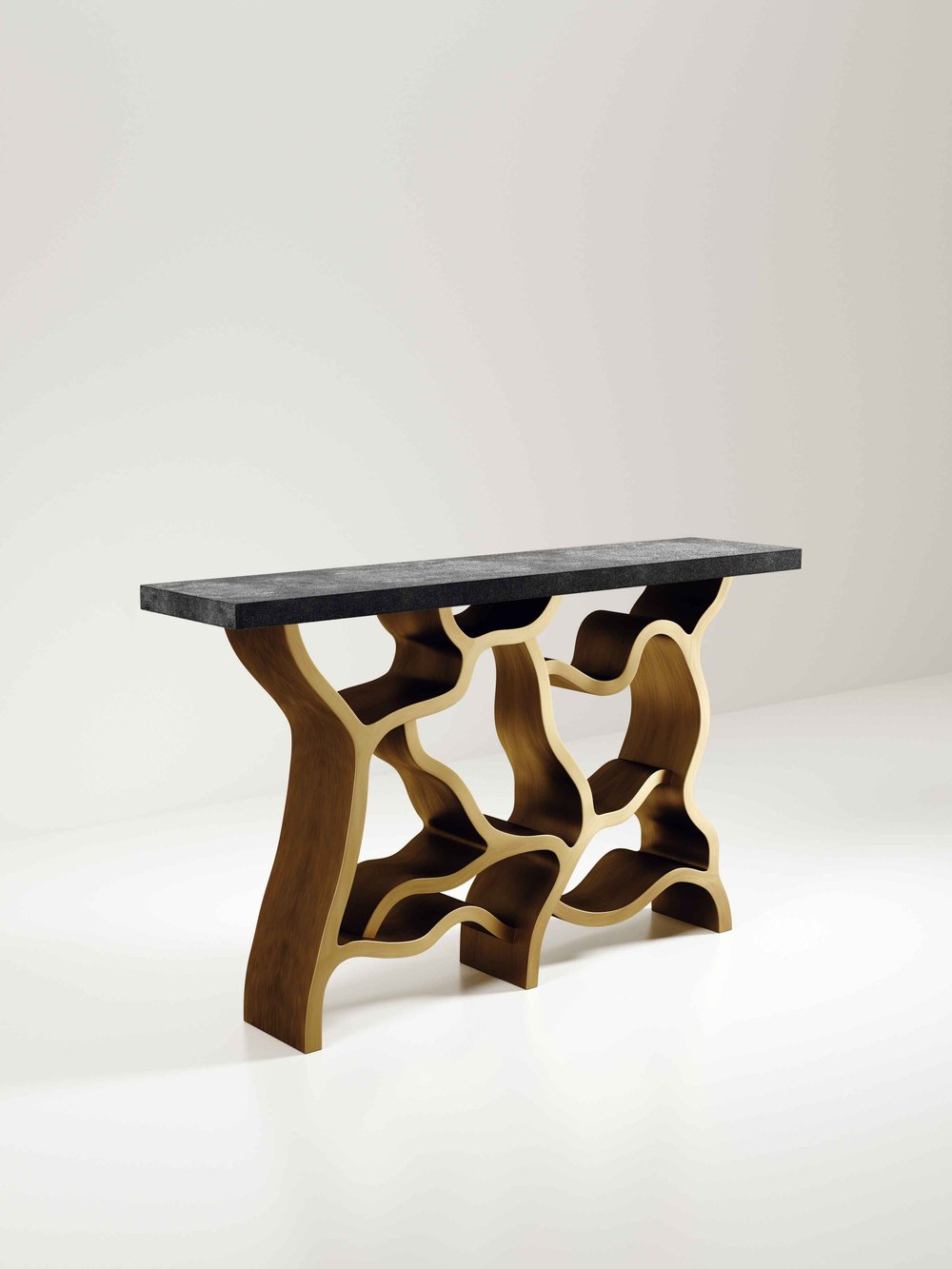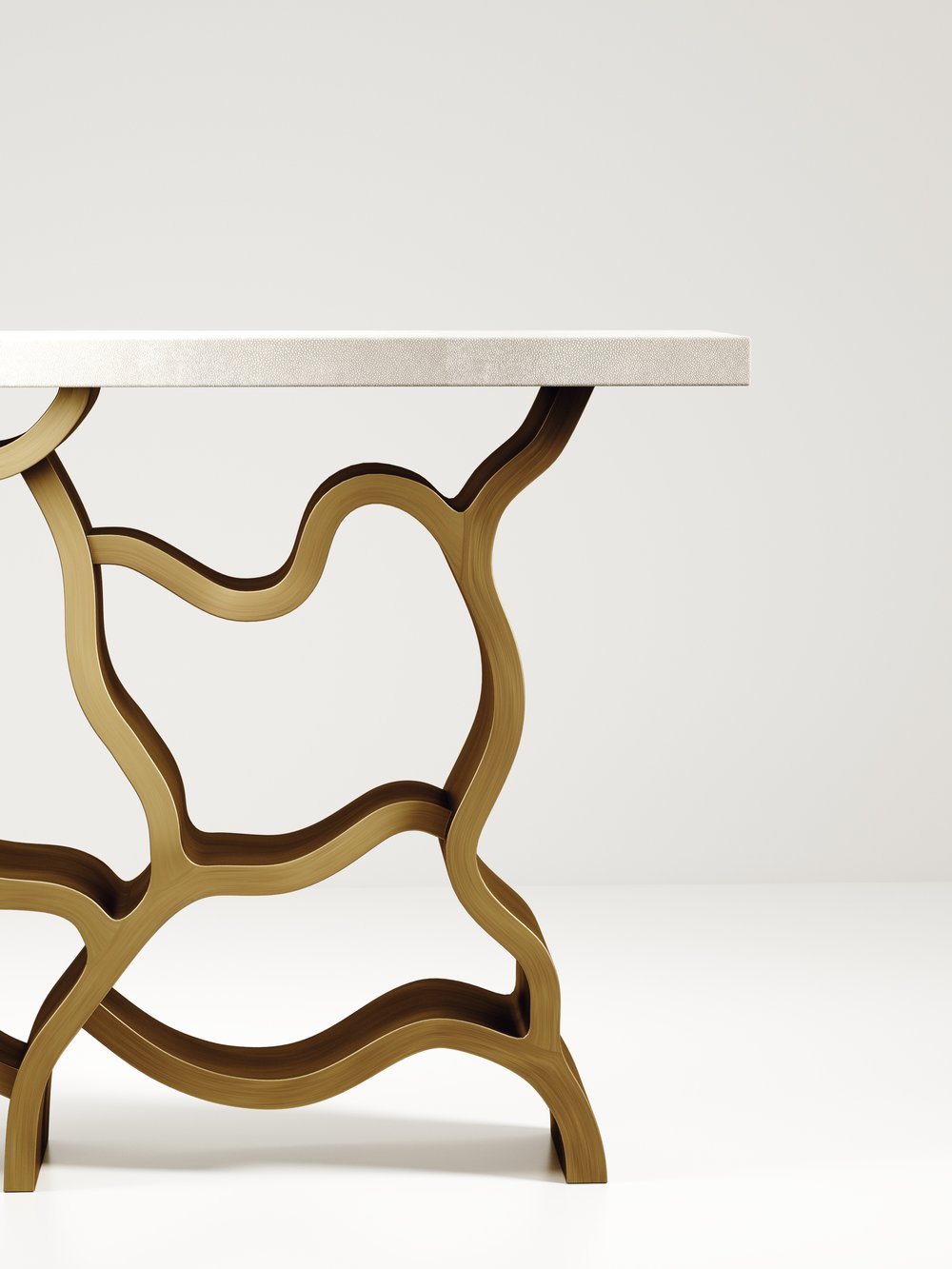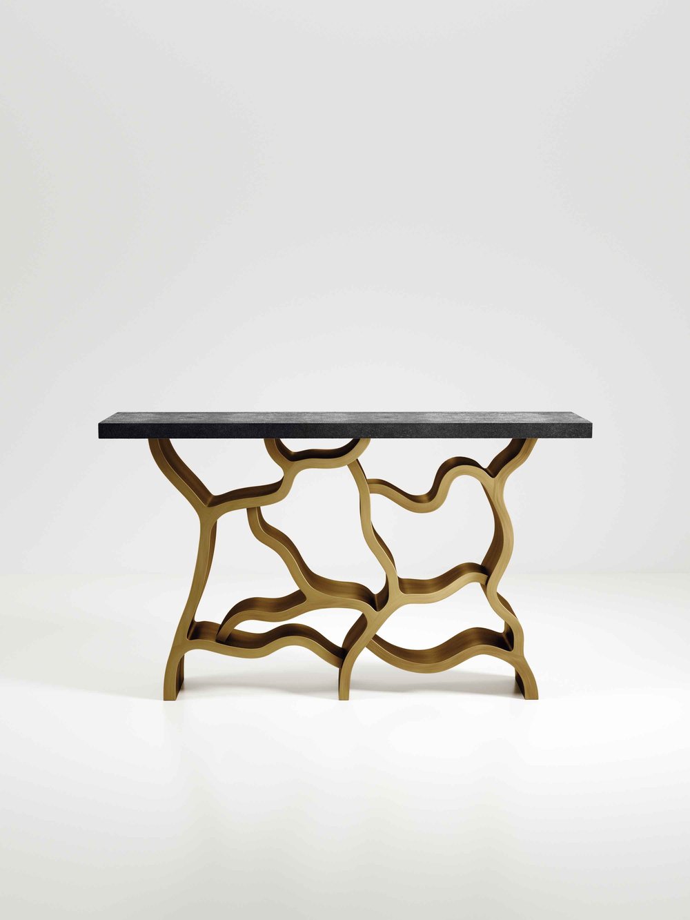 The Leaf Console Table by Kifu Paris is a dramatic and organic piece. The cream shagreen inlaid rectangle top sits on a striking bronze-patina brass base that emulates intertwining branches. This piece is designed by Kifu Augousti the daughter of Ria and Yiouri Augousti. Available in other finishes.