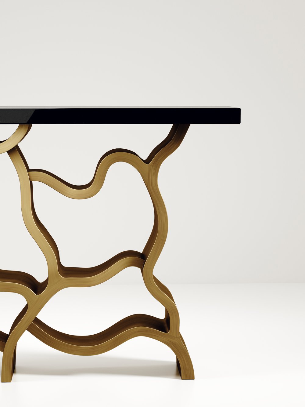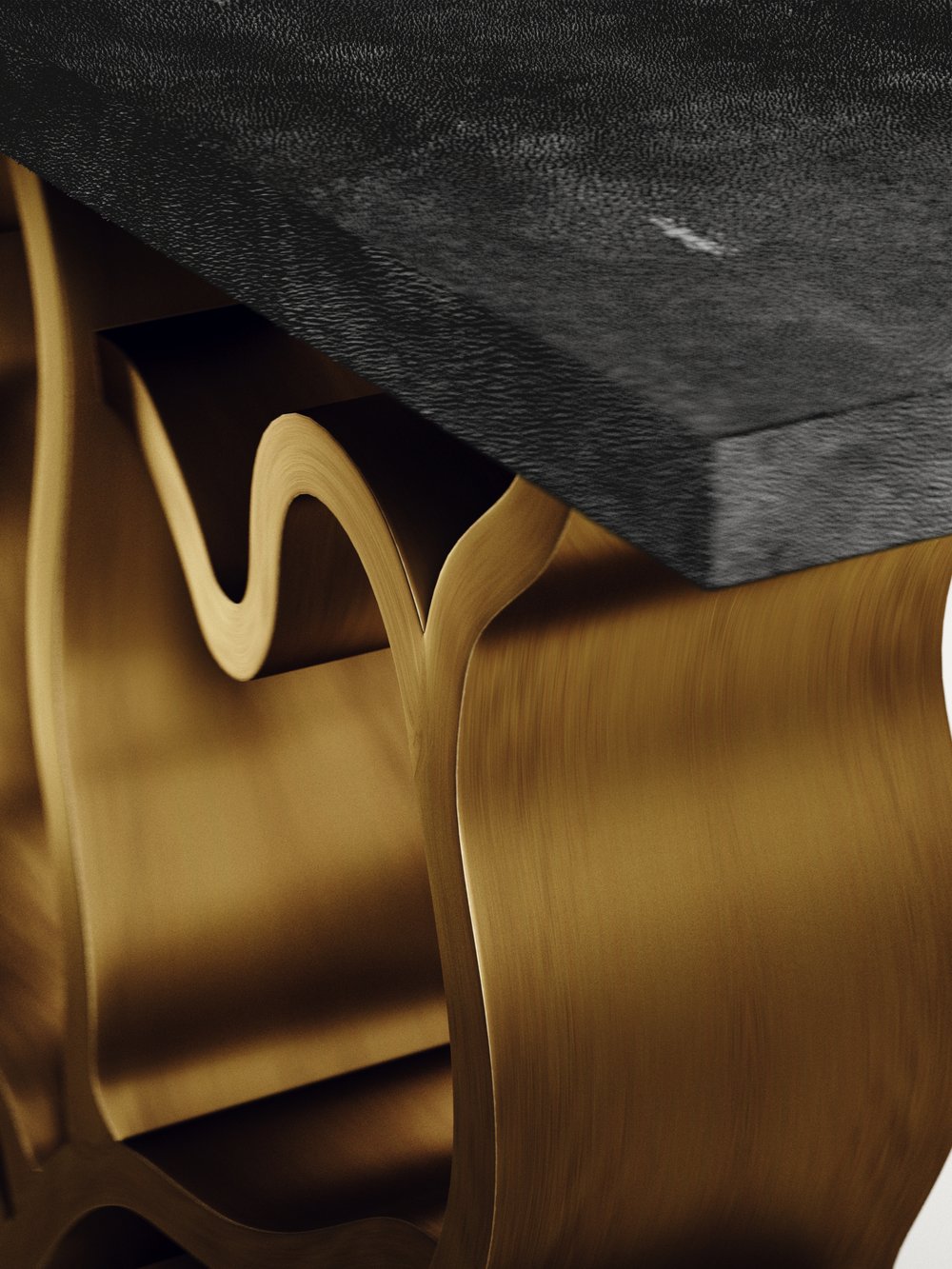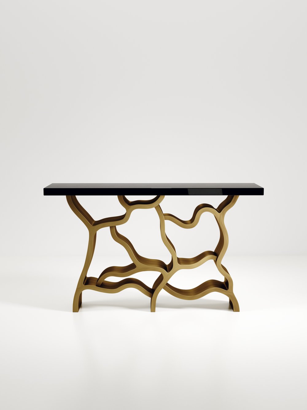 The Leaf Console Table by Kifu Paris is a dramatic and organic piece. The cream shagreen inlaid rectangle top sits on a striking bronze-patina brass base that emulates intertwining branches. This piece is designed by Kifu Augousti the daughter of Ria and Yiouri Augousti. Available in other finishes.