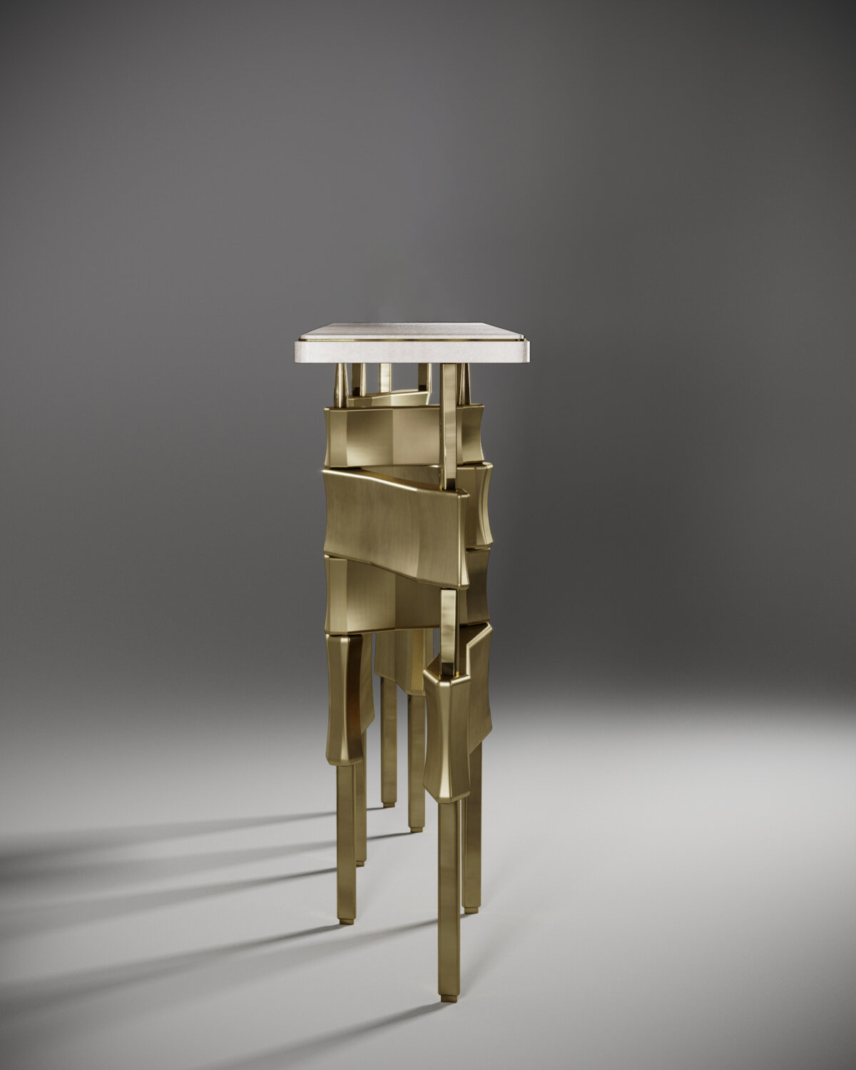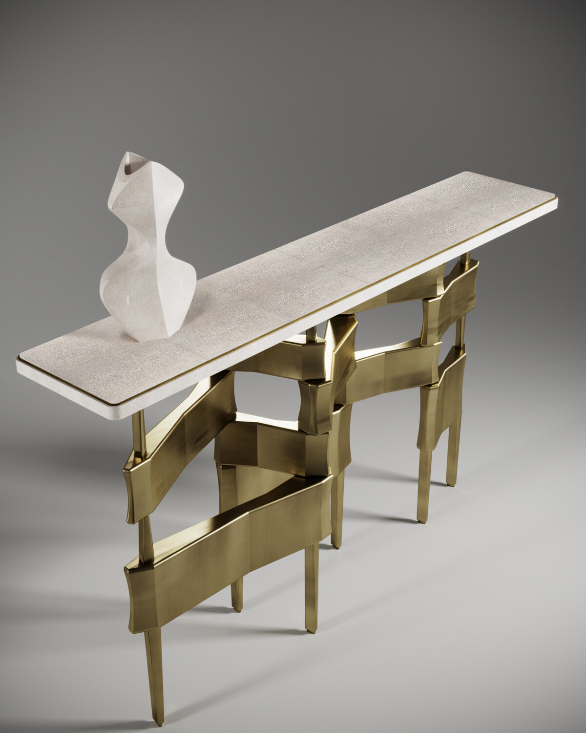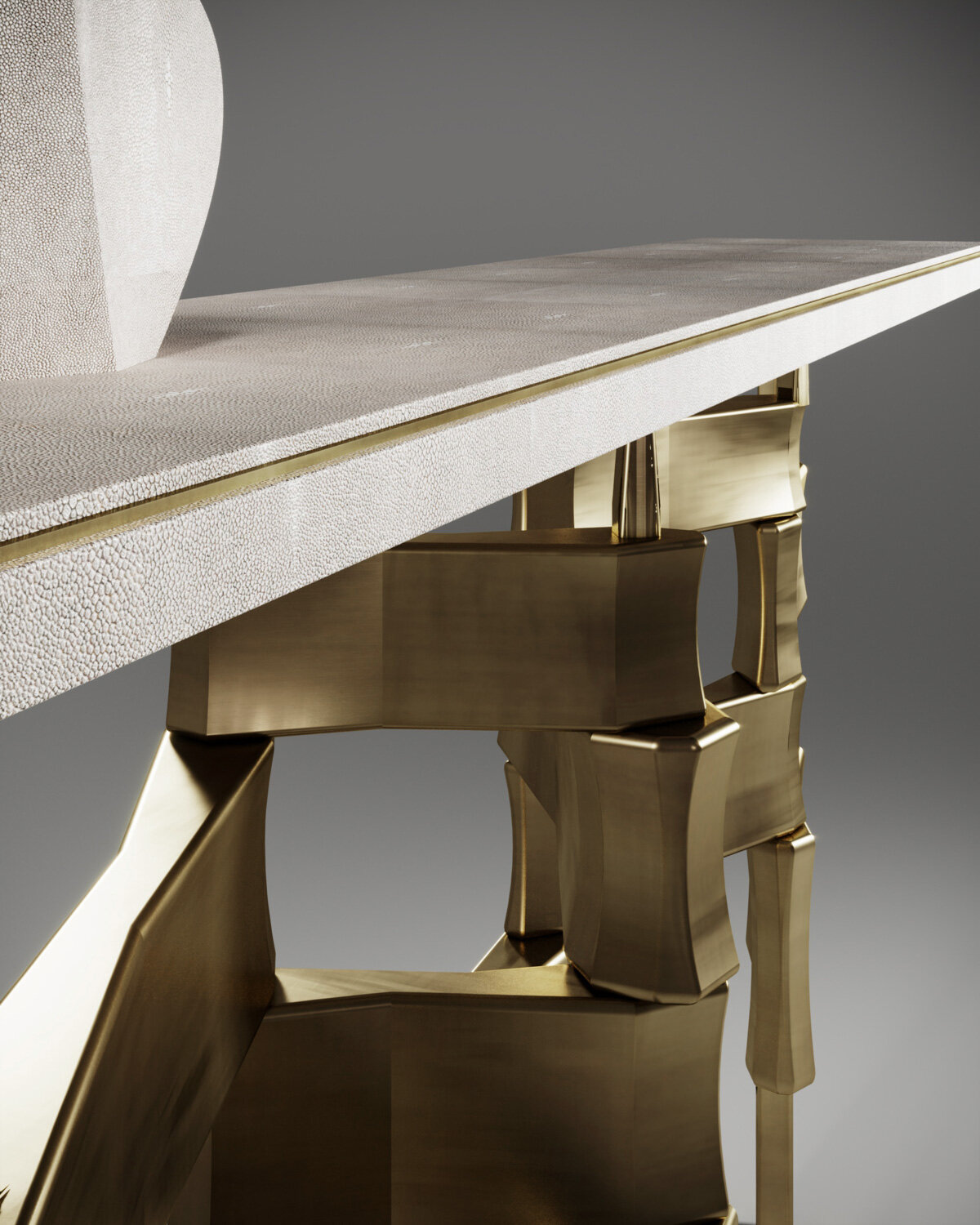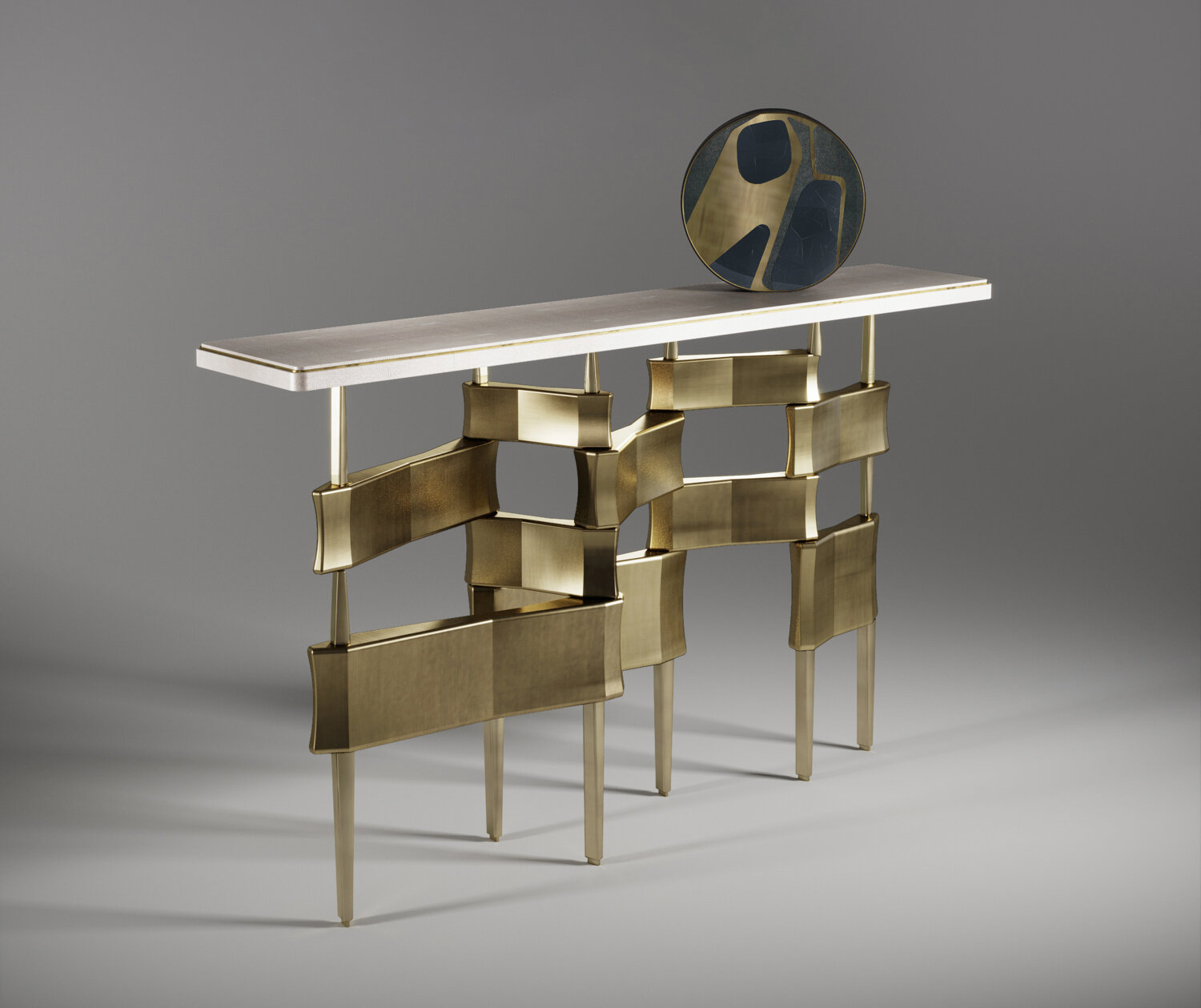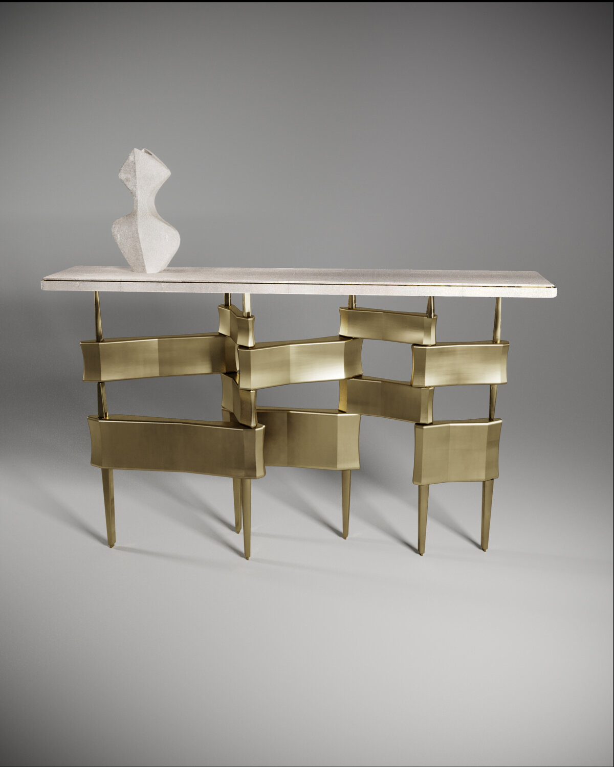 The Metropolis console table by Kifu Paris is a dramatic and sculptural design that demonstrates the incredible and signature artisanale work from her Augousti genes. The bronze-patina brass base of the console is conceptually inspired by the skyline of cosmopolitan cities. The top is inlaid in cream shagreen with a subtle metal indentation detail. This piece comes in other finishes as well as a coffee and side table variations, see images at end of slide. Vase sold separately.