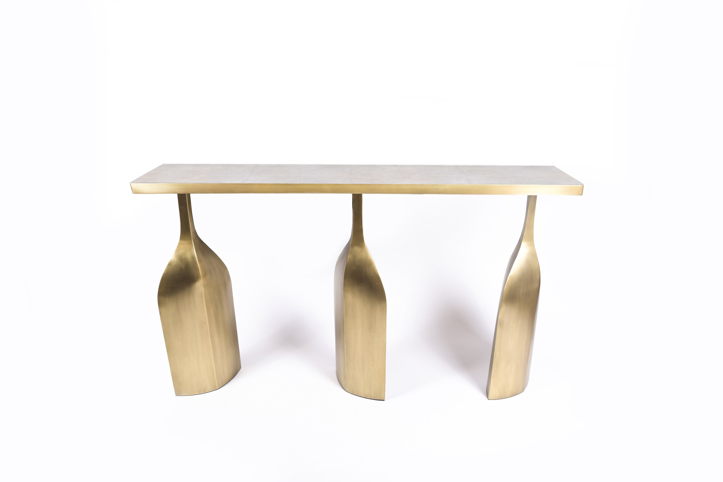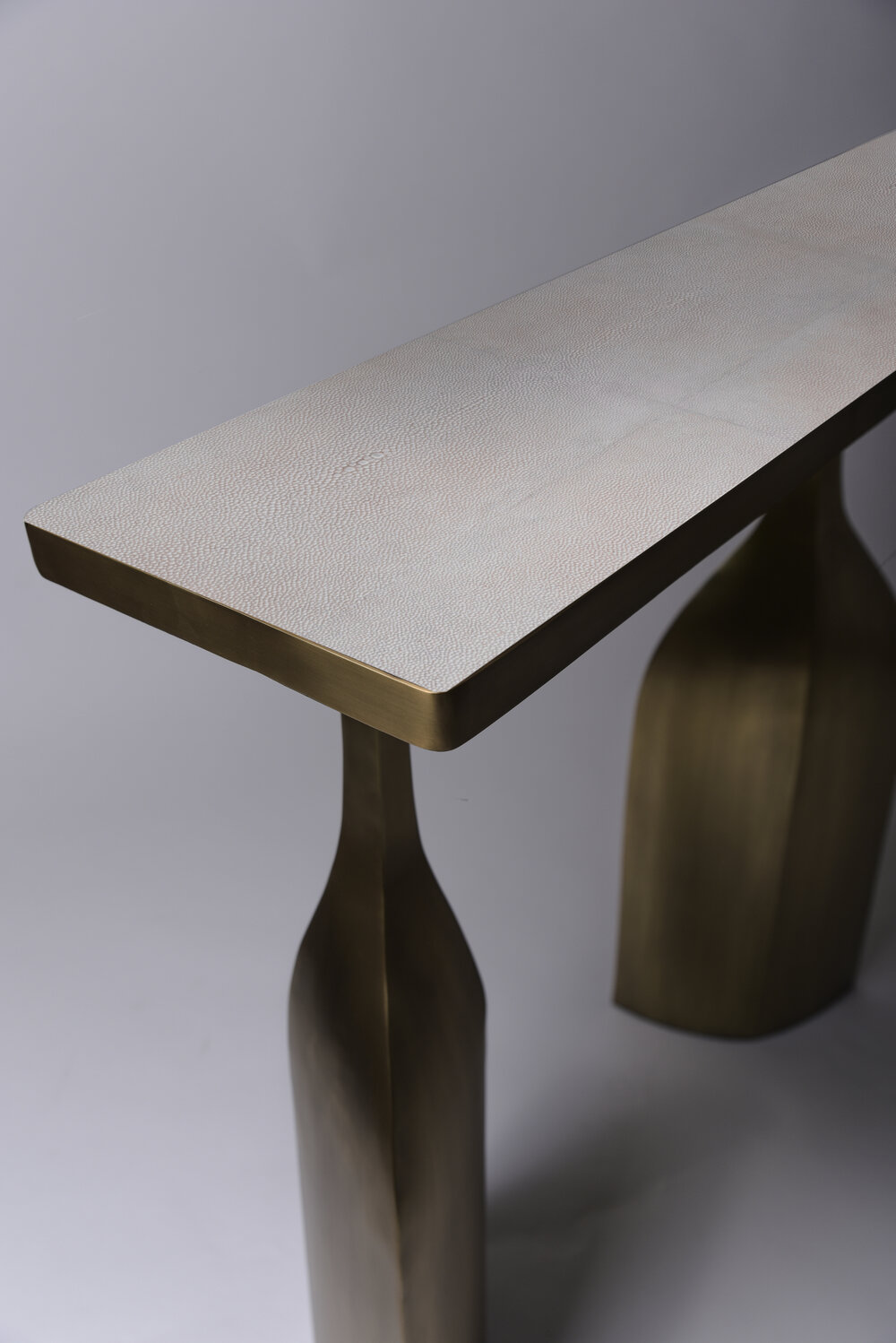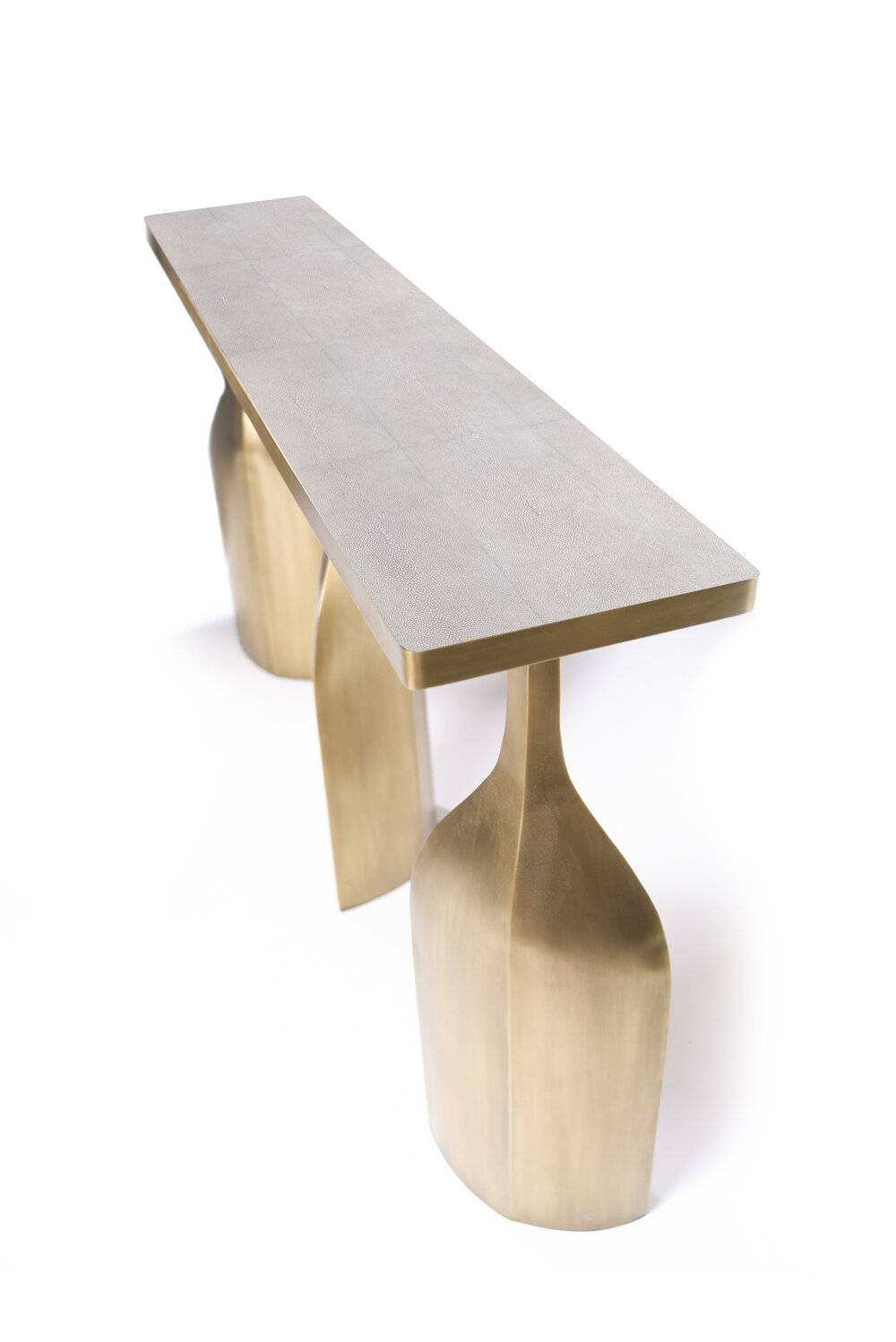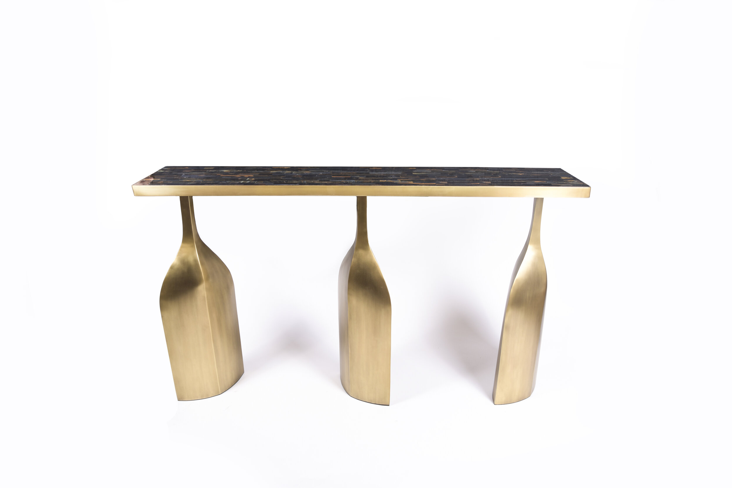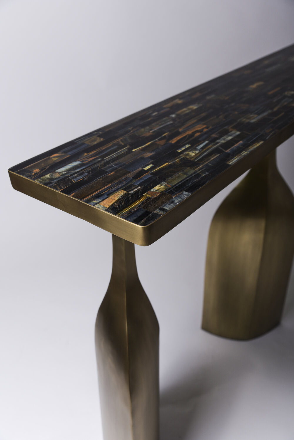 The Trinity Console is bold and exquisite in design. The top is inlaid either with the dreamy semi-precious stone: tiger eye blue or with our signature Antique Natural Shagreen. The Tiger Eye Semi-Precious Stone features incredible natural details with its mixture of blue, black and gold hues. The top sits on three stunning bronze-patina sculptural legs.