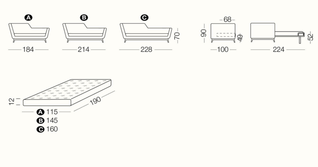 With its unique daybed shape, Jeremie recalls the Art Deco style, emphasized by its three variants: “Trendy”, turquoise fabric with special white details and orange base, “Fashion”, in shades of deep pink with floral patterns, striped details and green base, “Glamour”, in elegant taupe and brown colours. Featuring a seat in feather and high resilient polyurethane foam, feather backrest pillows and solid beech wood base in standard wenge finish or RAL color on demand, Jeremie is available in two widths, 214 cm and 228 cm and in several contemporary or classic fabrics. Jeremie is also available in bed version with a 190 cm long mattress.