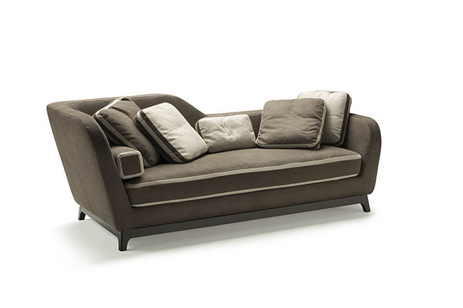 With its unique daybed shape, Jeremie recalls the Art Deco style, emphasized by its three variants: “Trendy”, turquoise fabric with special white details and orange base, “Fashion”, in shades of deep pink with floral patterns, striped details and green base, “Glamour”, in elegant taupe and brown colours. Featuring a seat in feather and high resilient polyurethane foam, feather backrest pillows and solid beech wood base in standard wenge finish or RAL color on demand, Jeremie is available in three widths, 184, 214 cm and 228 cm and in several contemporary or classic fabrics. Jeremie is also available in bed version with a 190 cm long mattress.