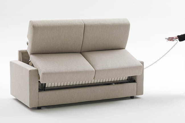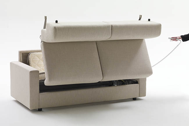 Lampo Motion is a sofa that brings style and sophistication to a modern setting. Operating the electric motor with its remote control, without removing any of the cushions, Lampo Motion turns effortlessly into a conventional bed with a 200 cm. length mattress. The cover is completely removable and washable according to the desired fabric.