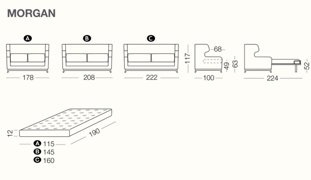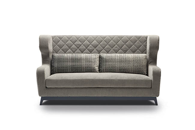 Morgan is distinguished by its Art Deco design and for the high back, creating a modern Bergère; the well-proportioned volumes combine classic and contemporary tastes. Morgan is ideal for decorating the home environment, lobby areas and the receptions of hotels and offices. Featuring a seat in feather and high resilient polyurethane foam, feather backrest pillows and solid beech wood base in standard wenge finish or RAL color on demand, Morgan is available in three widths: 222, 208 and 178 cm and in several contemporary or classic fabrics. Morgan is also available in bed version with a 190 cm long mattress.
