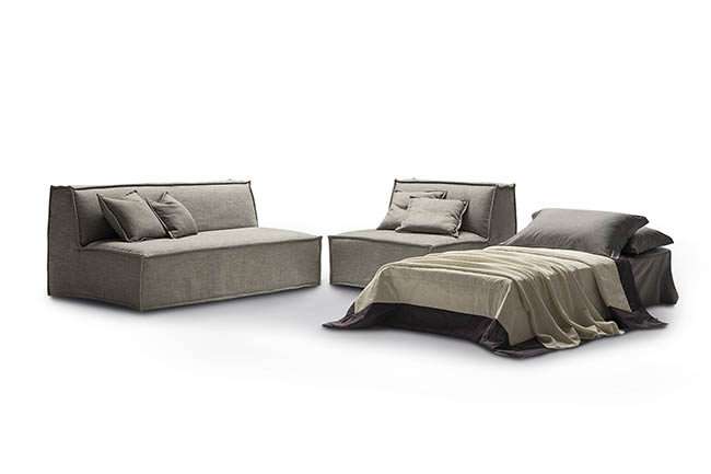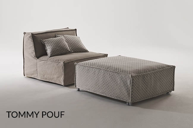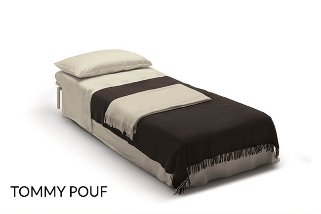 Sofa with a young design, Tommy converts into a bed with slatted base through a simple mechanism with front opening; the polyurethane foam mattress is covered with a quilted cotton fabric.