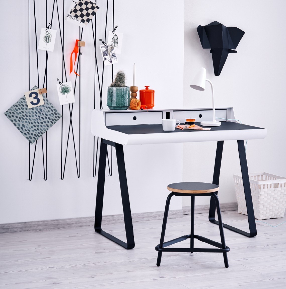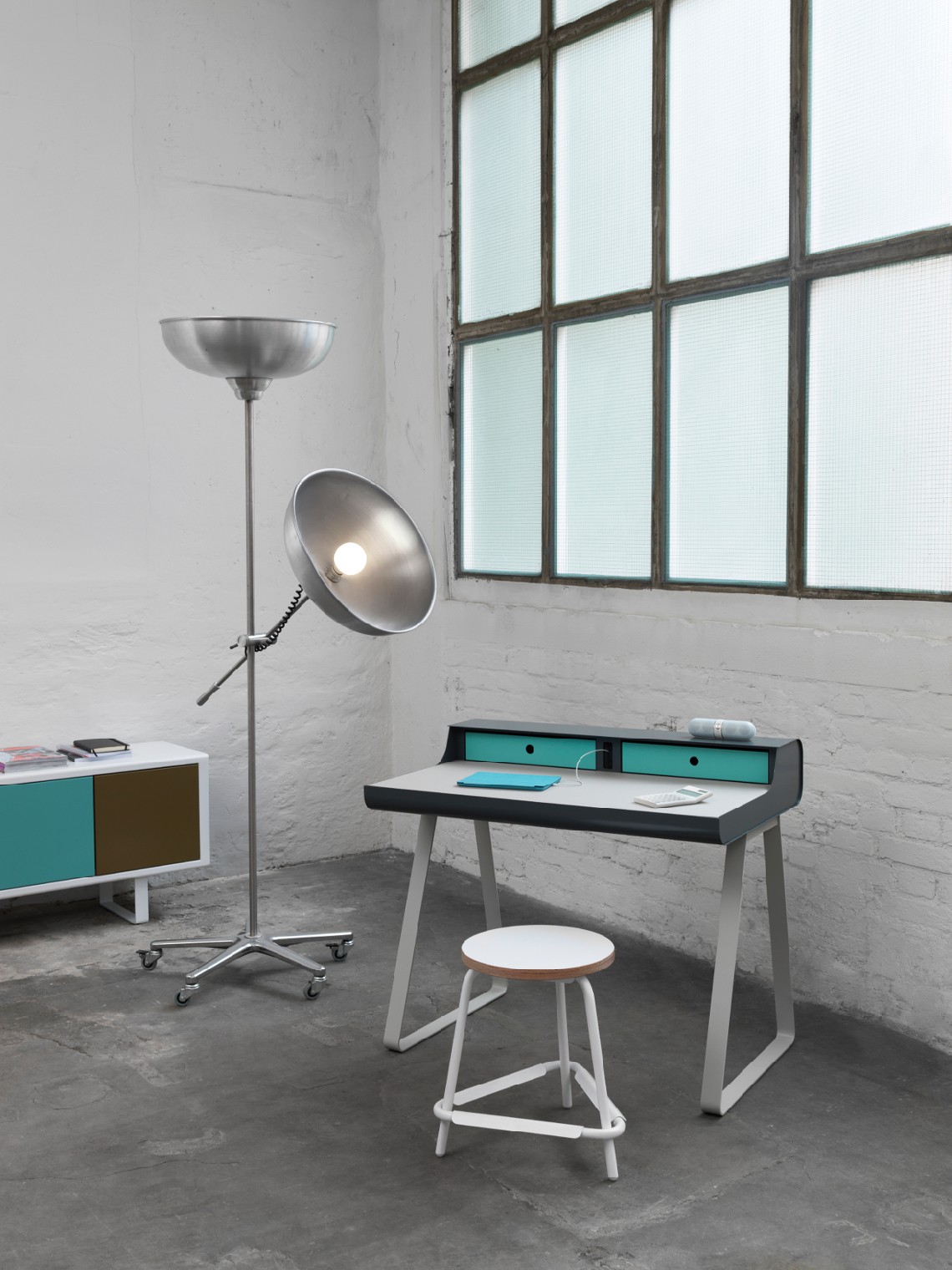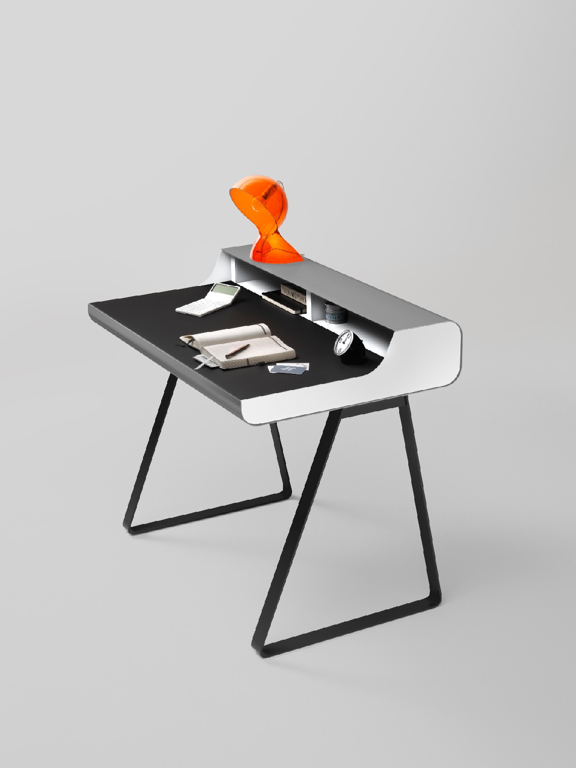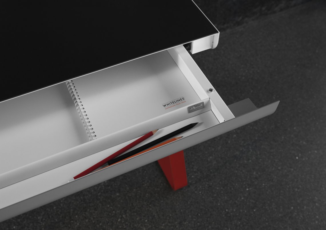 Ein gro?zügiger Assistent mit K?pfchen – der Sekret?r PS 10 überzeugt durch eine ausladende Arbeitsfl?che und pr?zise ausgearbeitete Details: zwei versenkte Aufbewahrungsf?cher mit Klappen für Kabel und Steckerleisten, der Mittelsteg mit Bürste zur Kabelführung und eine ger?umige Schublade mit Stiftablage. Optional sind zwei Schubk?sten erh?ltlich.
