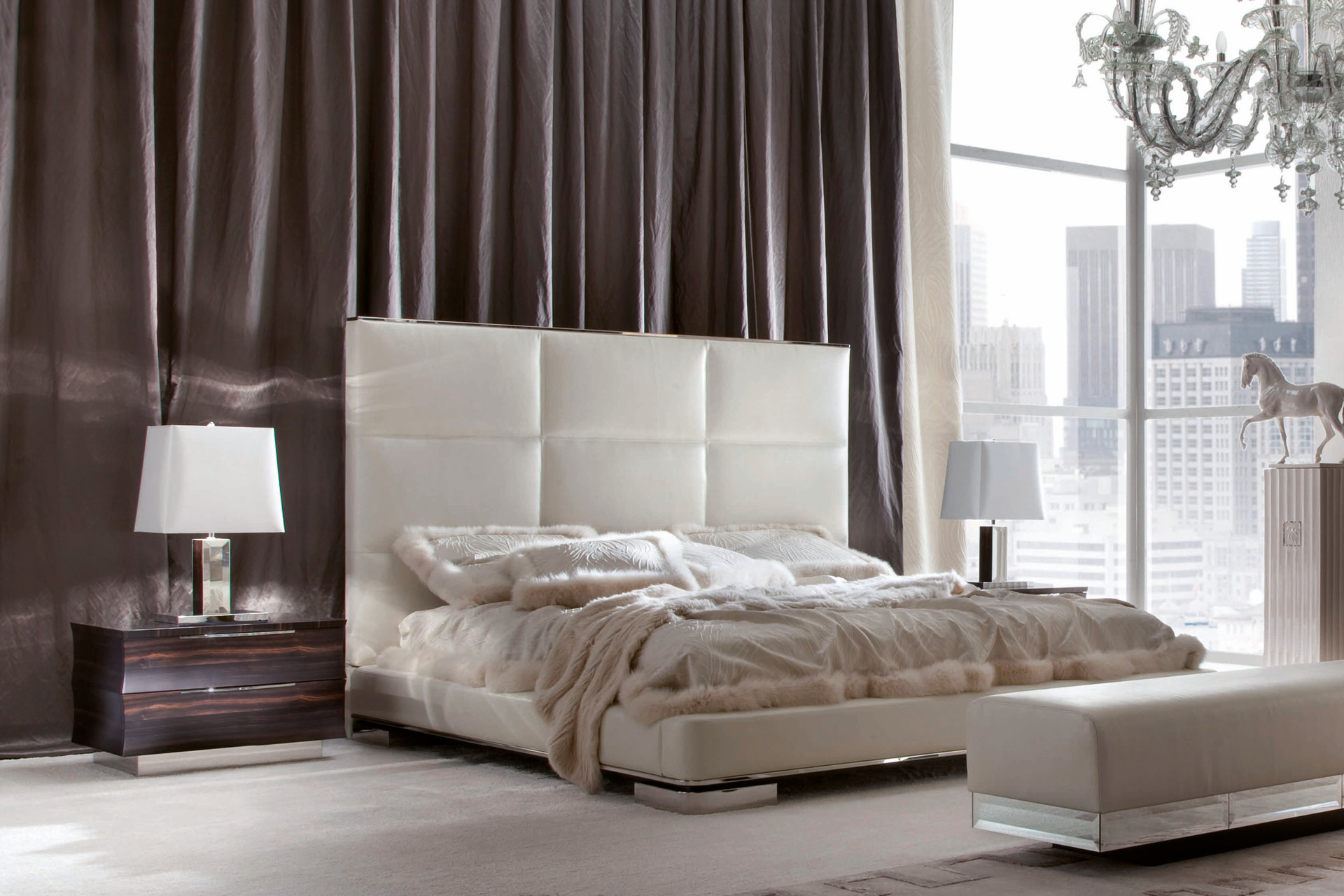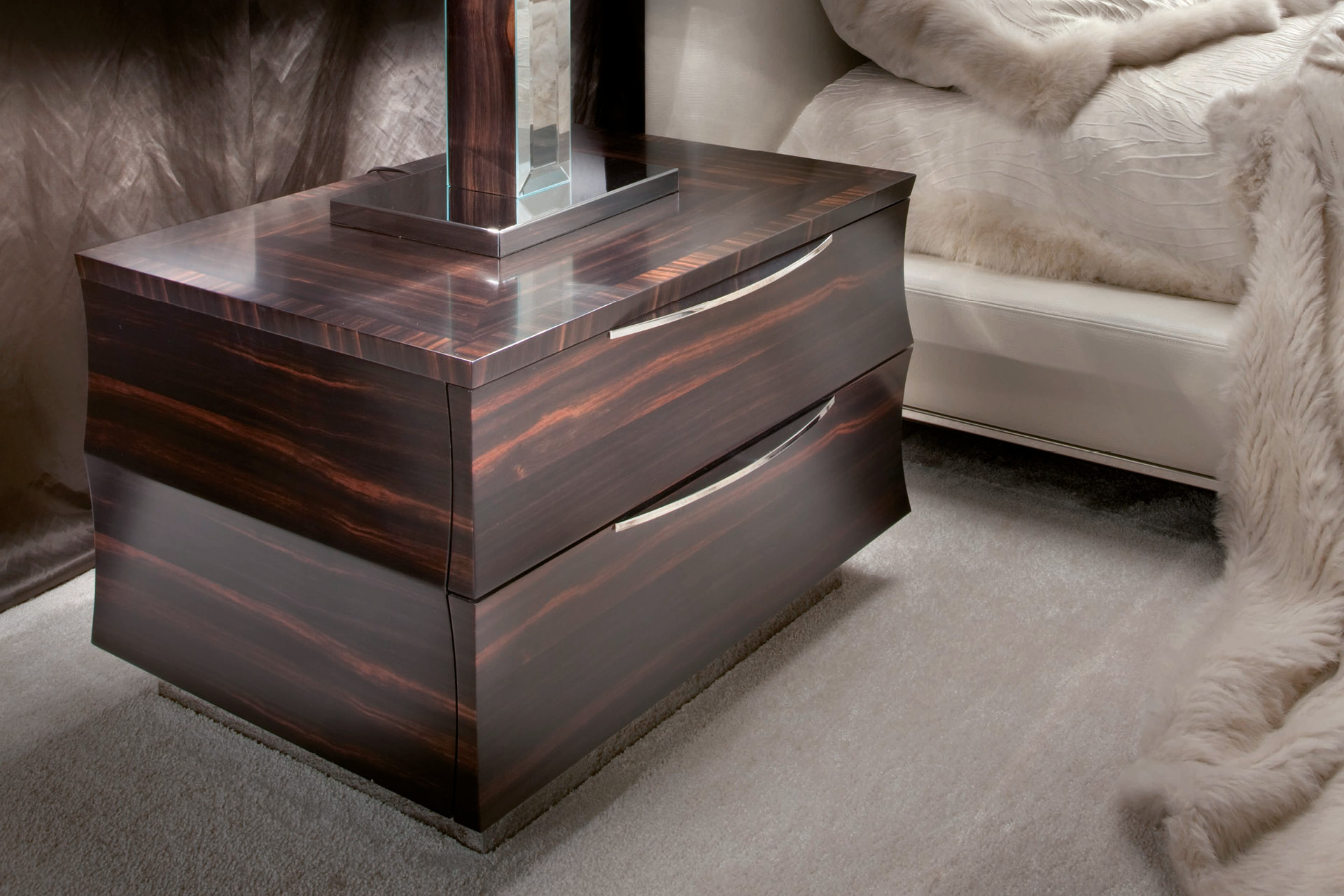 Night table available in makassar ebony veneer in satin finish. 2 full extension drawers with bottom in velvet fabric. Chrome stainless steel top inlay. Chrome stainless steel handles and base