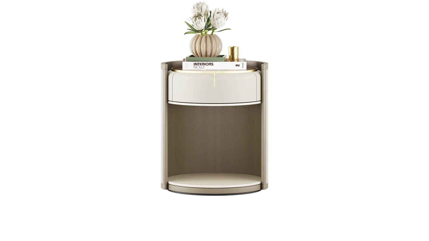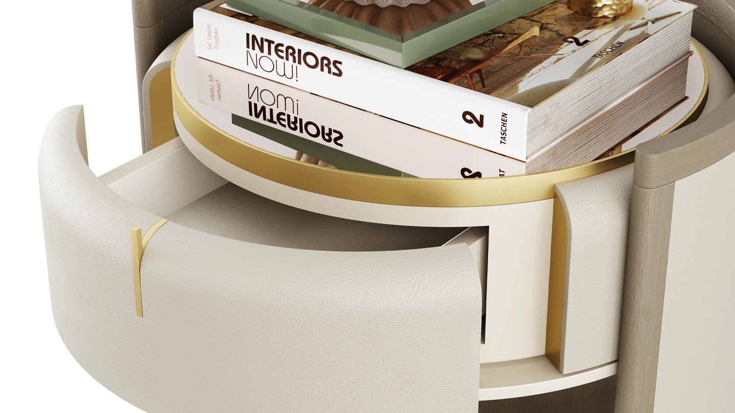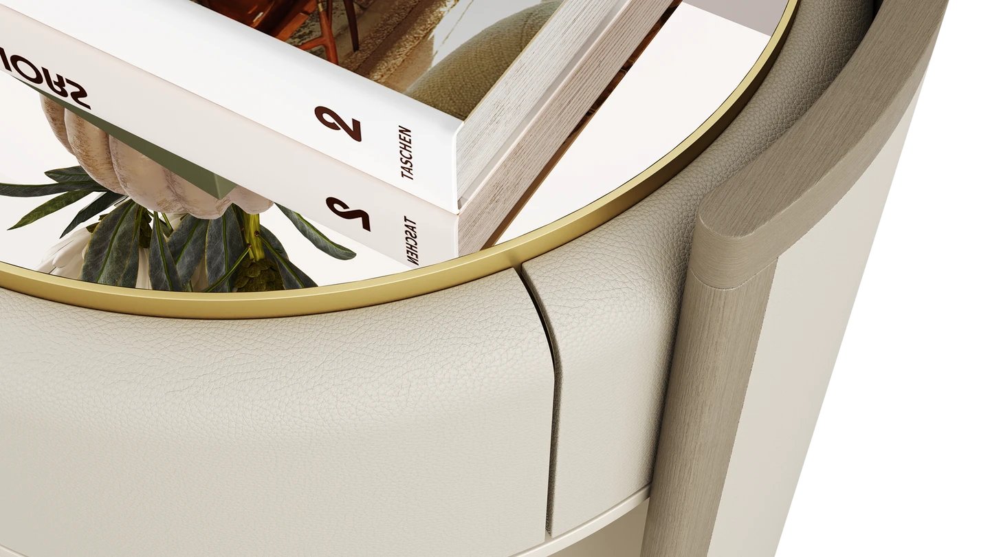 Elevate your bedroom with our ARLES Bedside Table. The curved shape is simple but striking, combining lacquered wood and leather, while the bronze mirror top brings a touch of elegance.