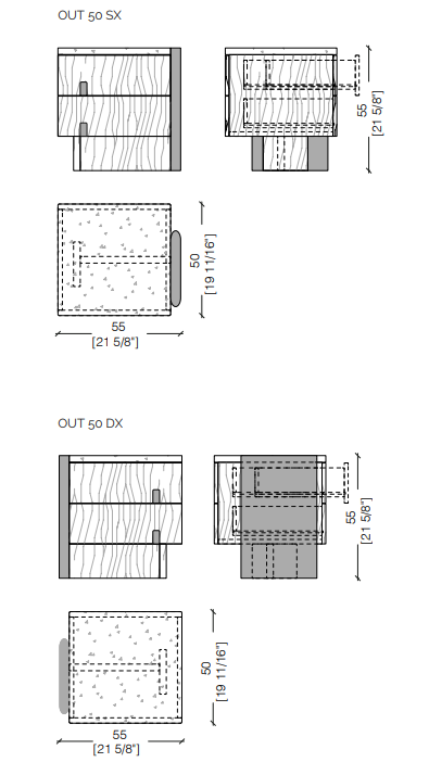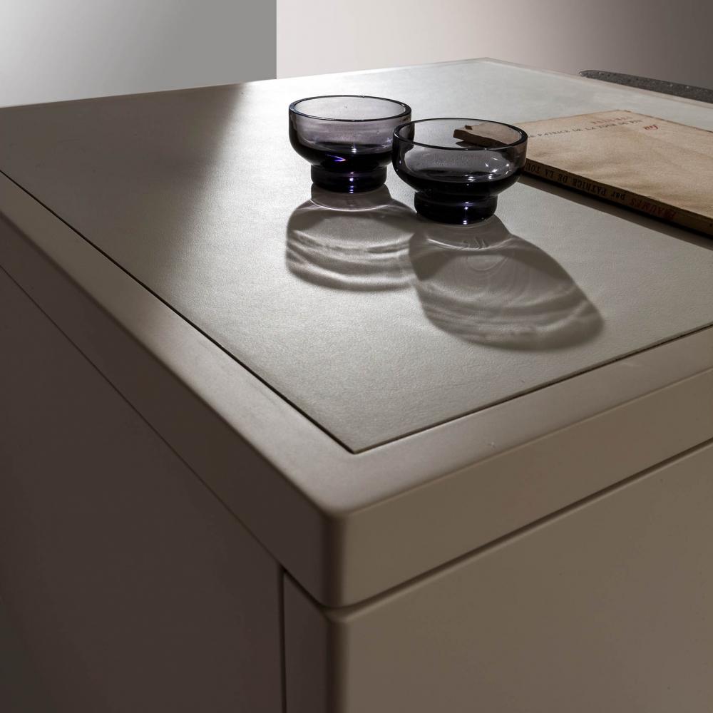 Top and chest of drawers in plain, dyed or lacquered wood in all RAL colours. Sides and handles available in brushed "gold" or in liquid metal Raptor.