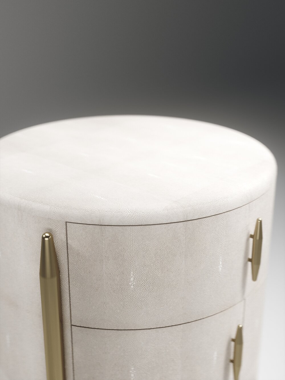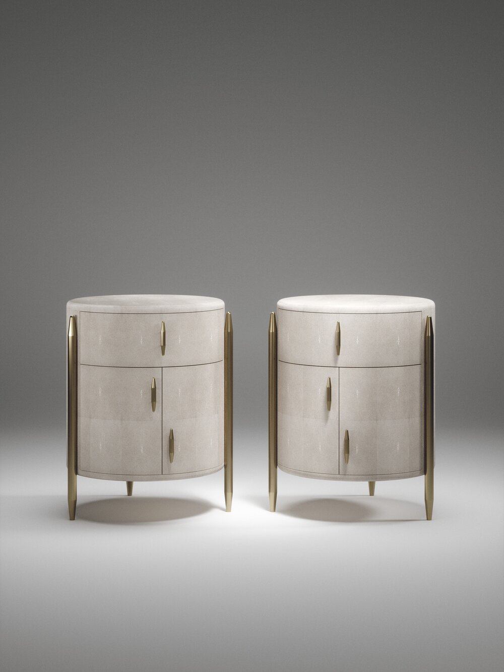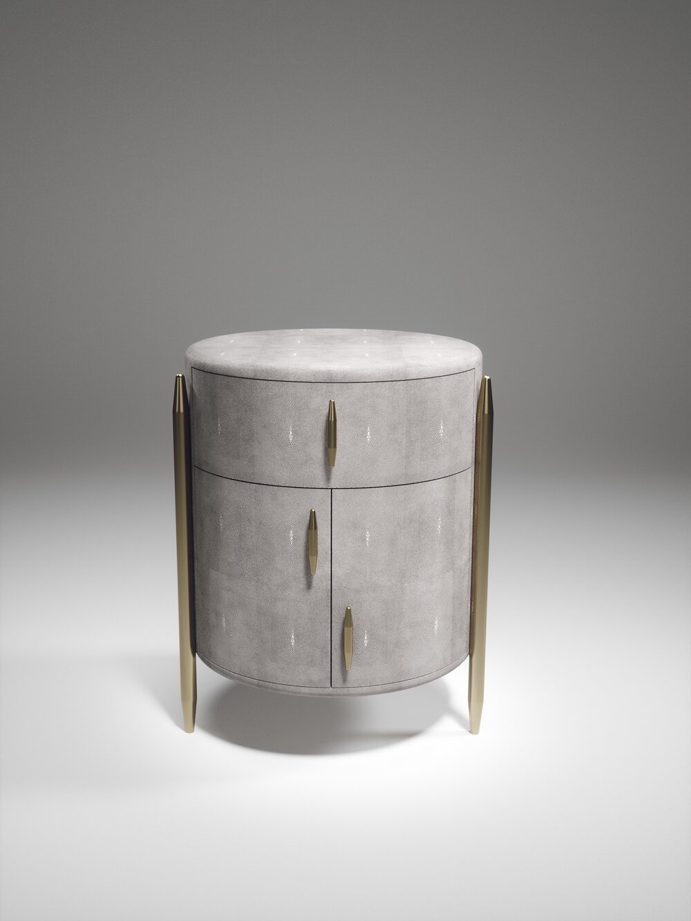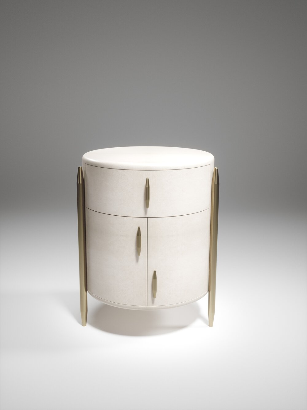 The Dandy Round Bedside Table by Kifu Paris is an elegant and a luxurious home accent, inlaid in cream shagreen with bronze-patina brass details. This piece includes 1 drawer total and a cabinet below; the interiors are inlaid in gemelina wood veneer. Available in other finishes and as a square version. This piece is designed by Kifu Augousti, the daughter of Ria and Yiouri Augousti.、