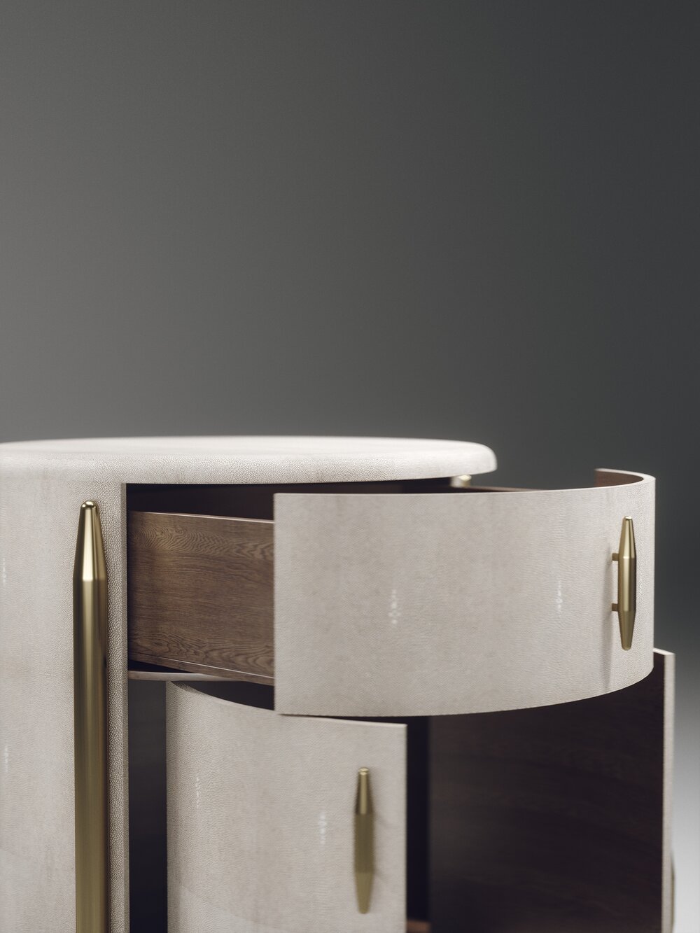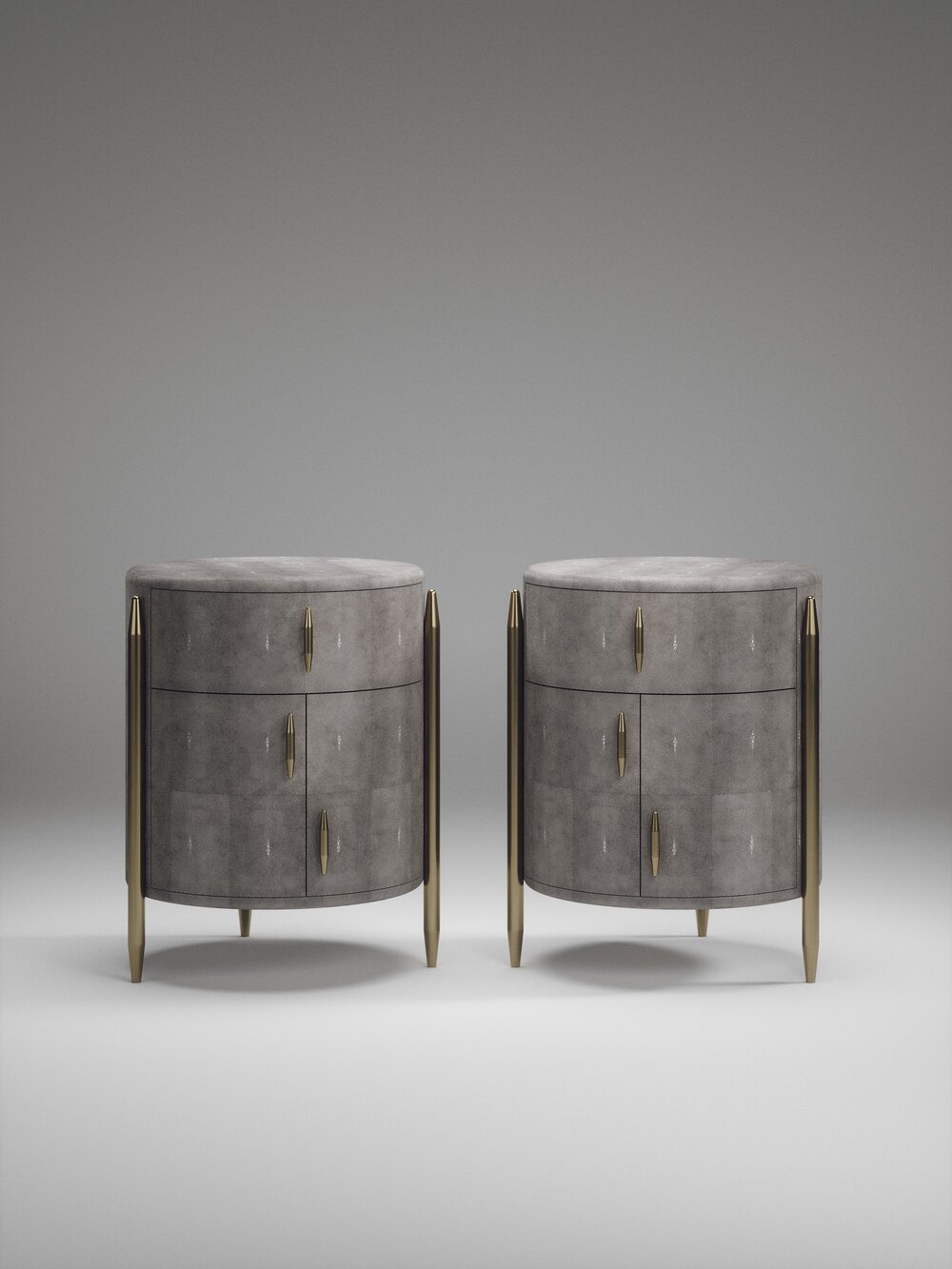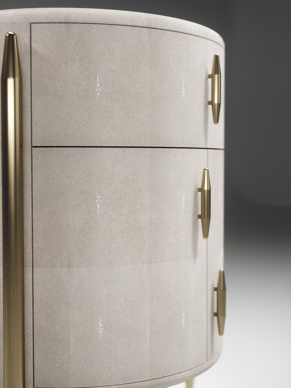 The Dandy Round Bedside Table by Kifu Paris is an elegant and a luxurious home accent, inlaid in cream shagreen with bronze-patina brass details. This piece includes 1 drawer total and a cabinet below; the interiors are inlaid in gemelina wood veneer. Available in other finishes and as a square version. This piece is designed by Kifu Augousti, the daughter of Ria and Yiouri Augousti.、