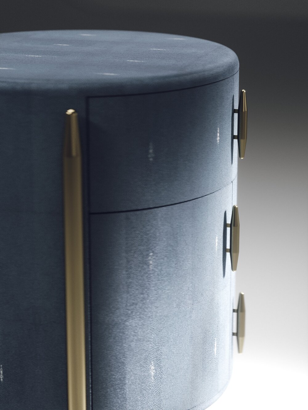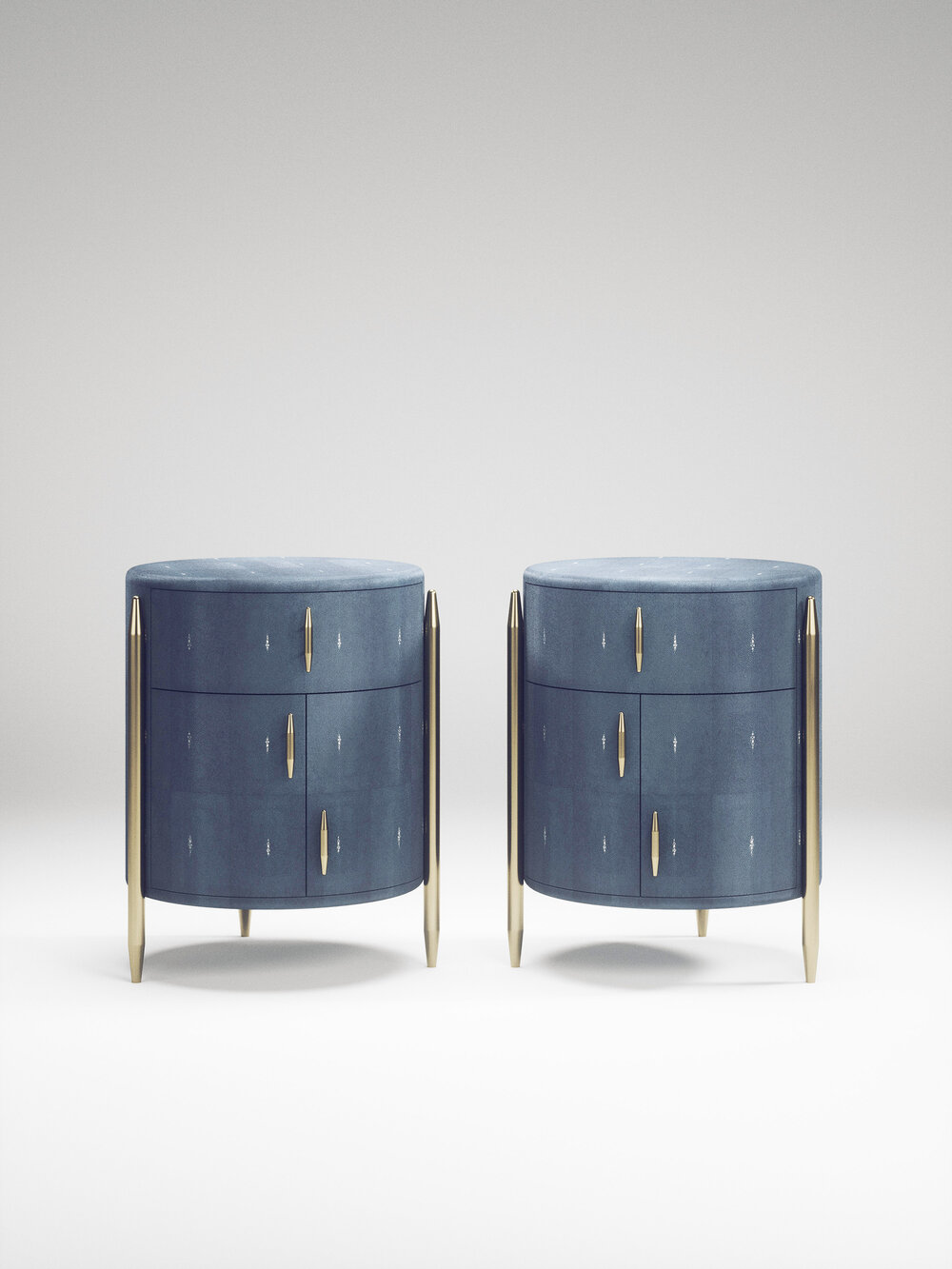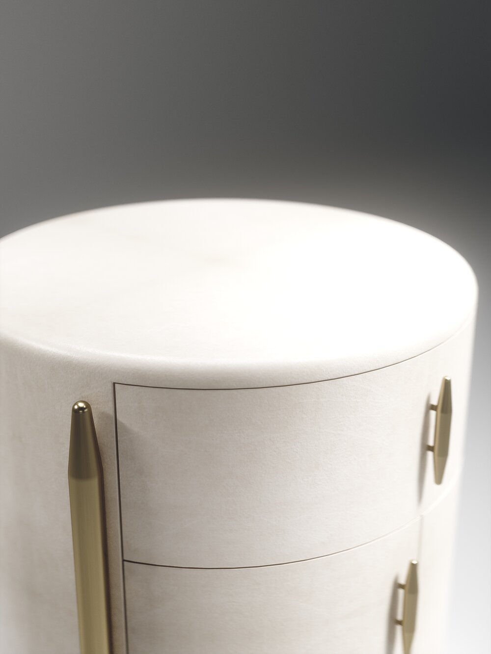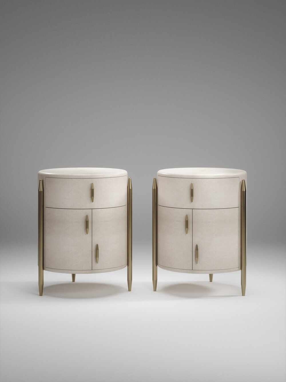 The Dandy Round Bedside Table by Kifu Paris is an elegant and a luxurious home accent, inlaid in cream shagreen with bronze-patina brass details. This piece includes 1 drawer total and a cabinet below; the interiors are inlaid in gemelina wood veneer. Available in other finishes and as a square version. This piece is designed by Kifu Augousti, the daughter of Ria and Yiouri Augousti.、