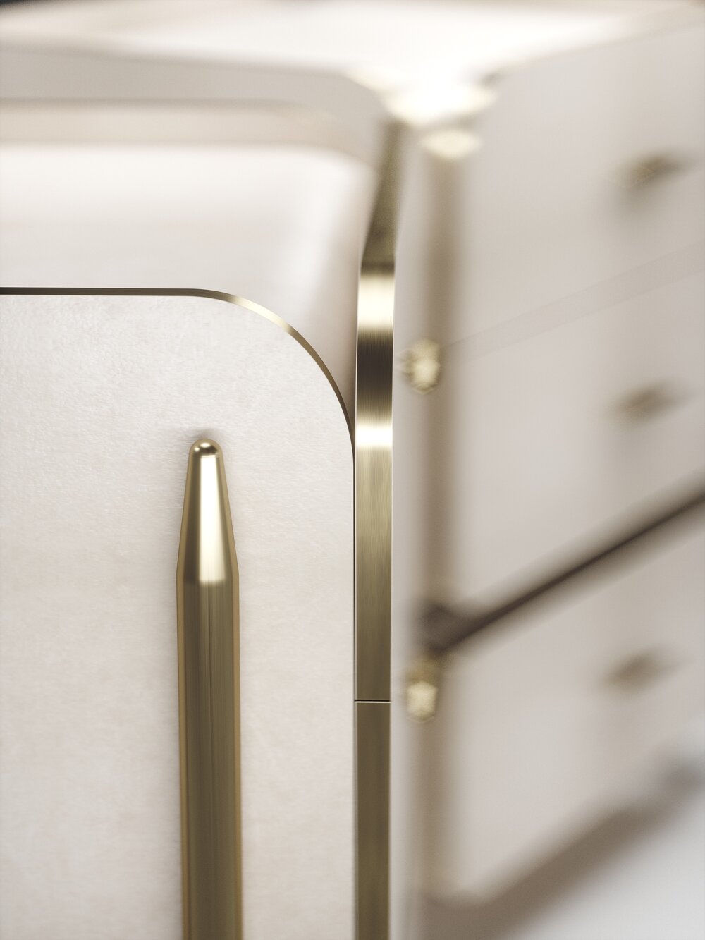 The Dandy Square Bedside Table by Kifu Paris is an elegant and luxurious home accent, inlaid in cream shagreen with bronze-patina brass details. This piece includes 3 drawers total and the interiors are inlaid in gemelina wood veneer. This piece is designed by Kifu Augousti, the daughter of Ria and Yiouri Augousti. Sold individually