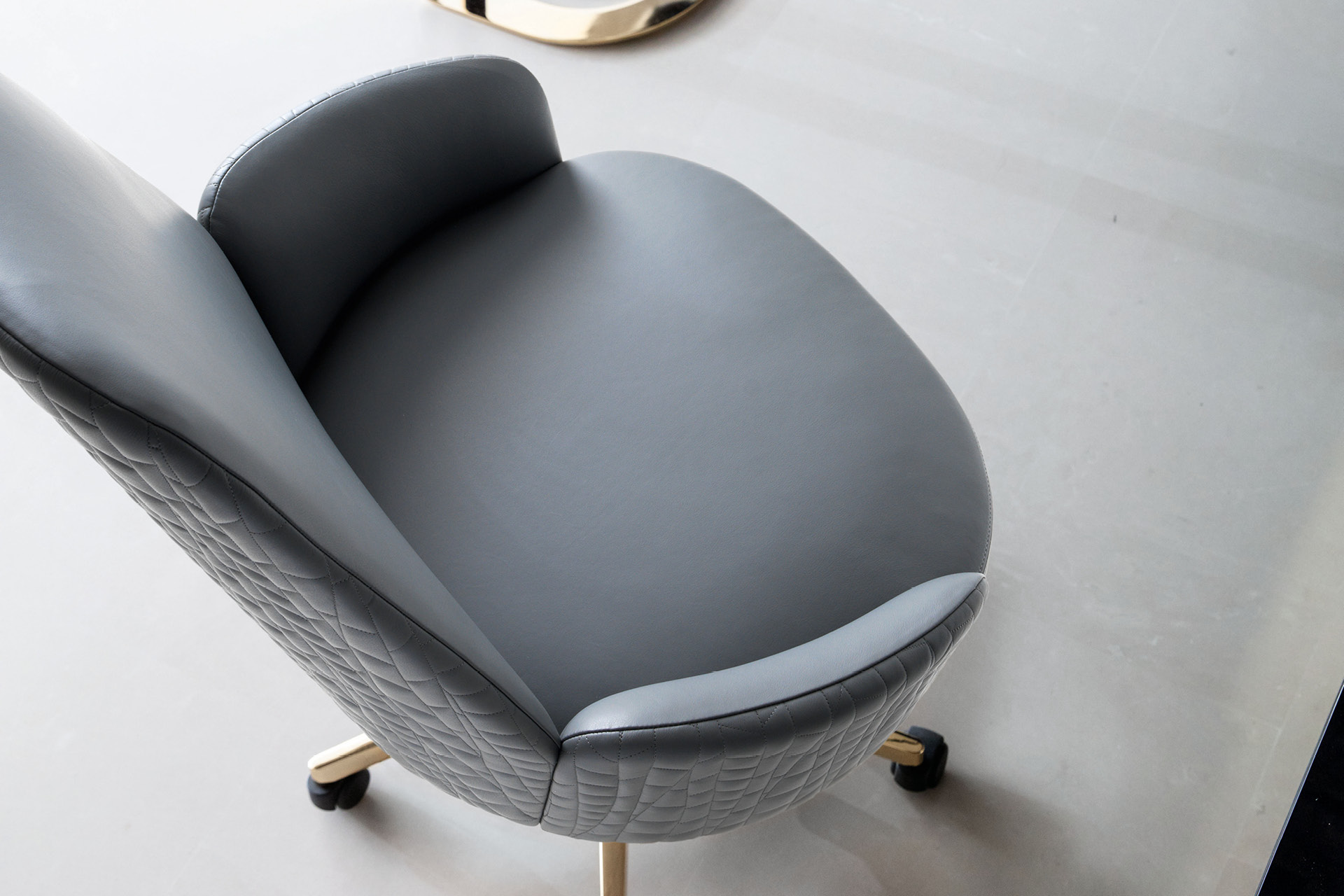 Presidential office chair available in leather, nubuk, leather, suede fabric, on wheels with adjustable height. Quilted back. Base in light gold chrome stainless steel.