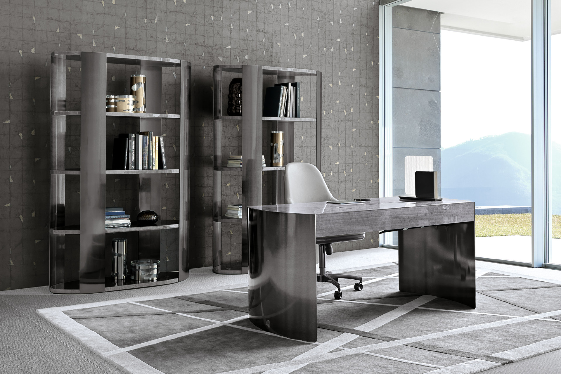 Fully upholstered home office chair in solid beech on wheels with adjustable seat height (cm. 44/52). Back in quilted first grade leather, nubuk leather, lizard printed leather, velvet or suede fabric. Wooden frame seat with Giorgio Collection logo. Base in satin black nickel stainless steel.