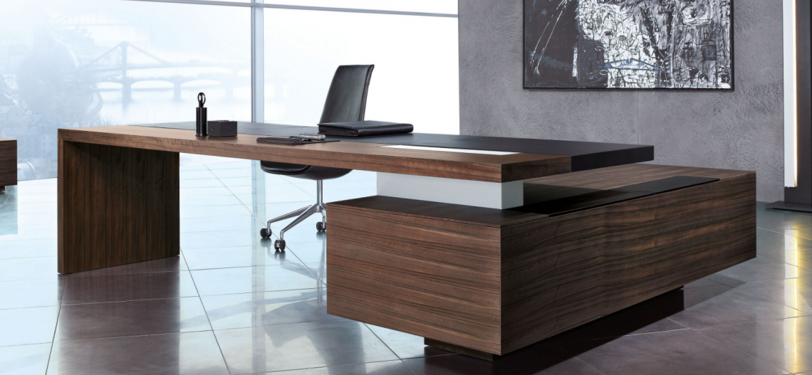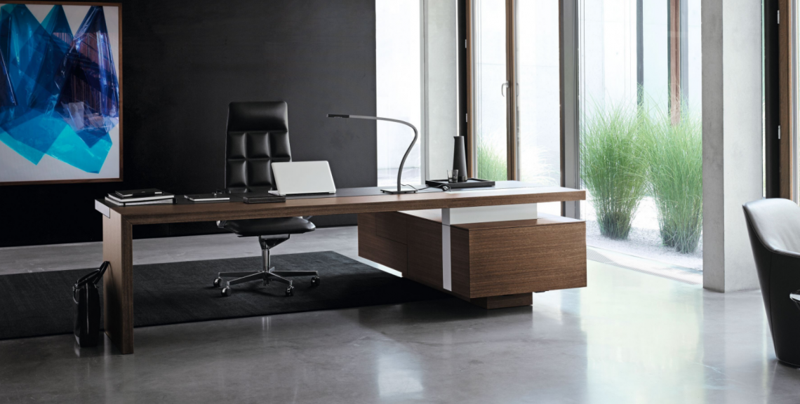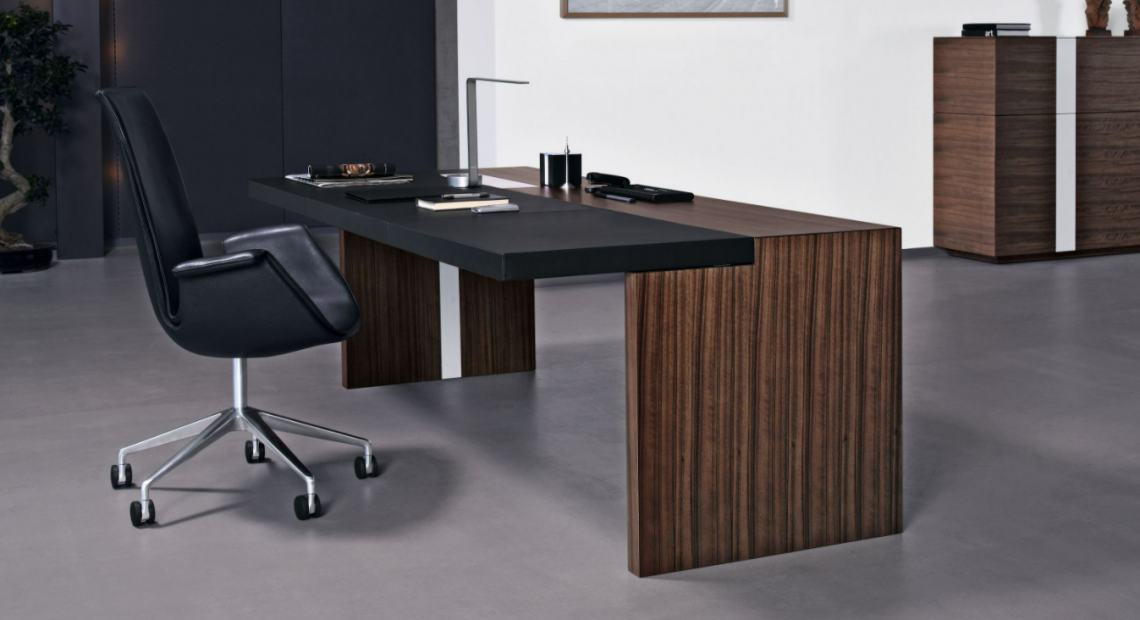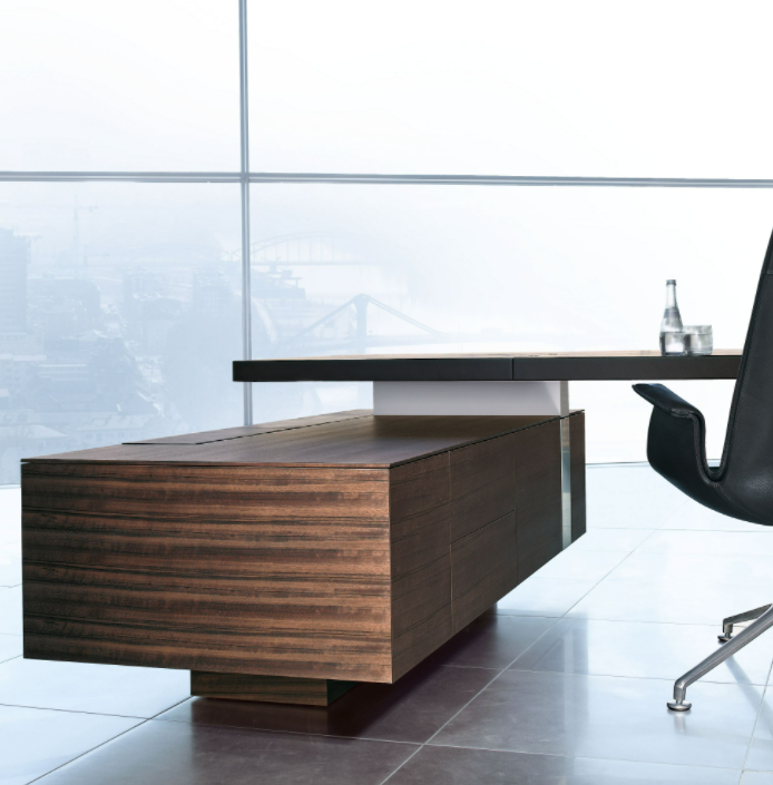 The spacious desk’s architecture made for management offices wins with clarity. With its powerful aesthetics, the streamlined proportions generate an impressive aura. For vision and trust on C level.