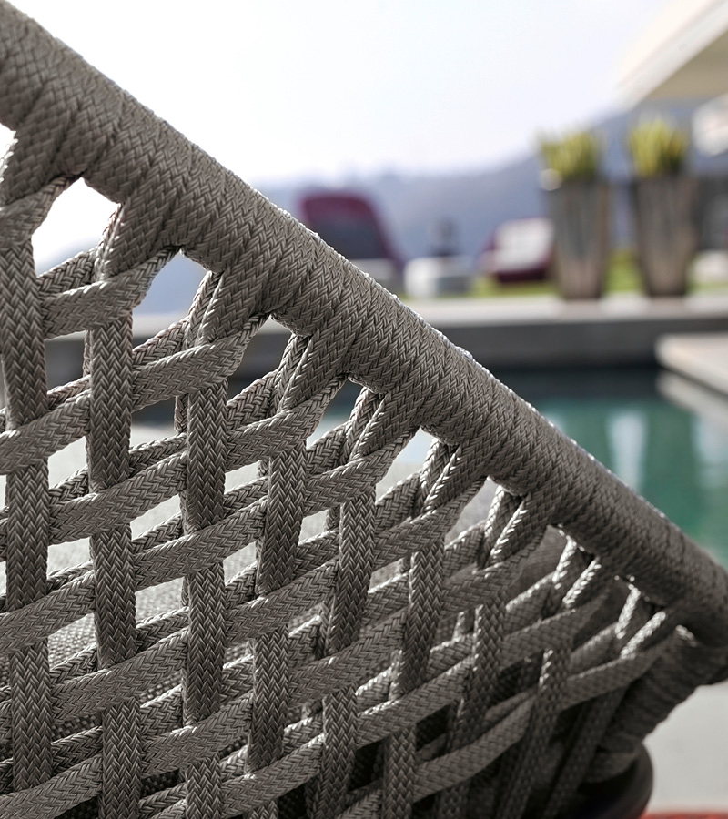 Outdoor occasional chair in special treated fabric or first grade leather. Cushion filling in waterproof dacron. Structure in combination of satined black metal treated in cataphoresis with inserted Giorgio Collection logo and woven cordage.