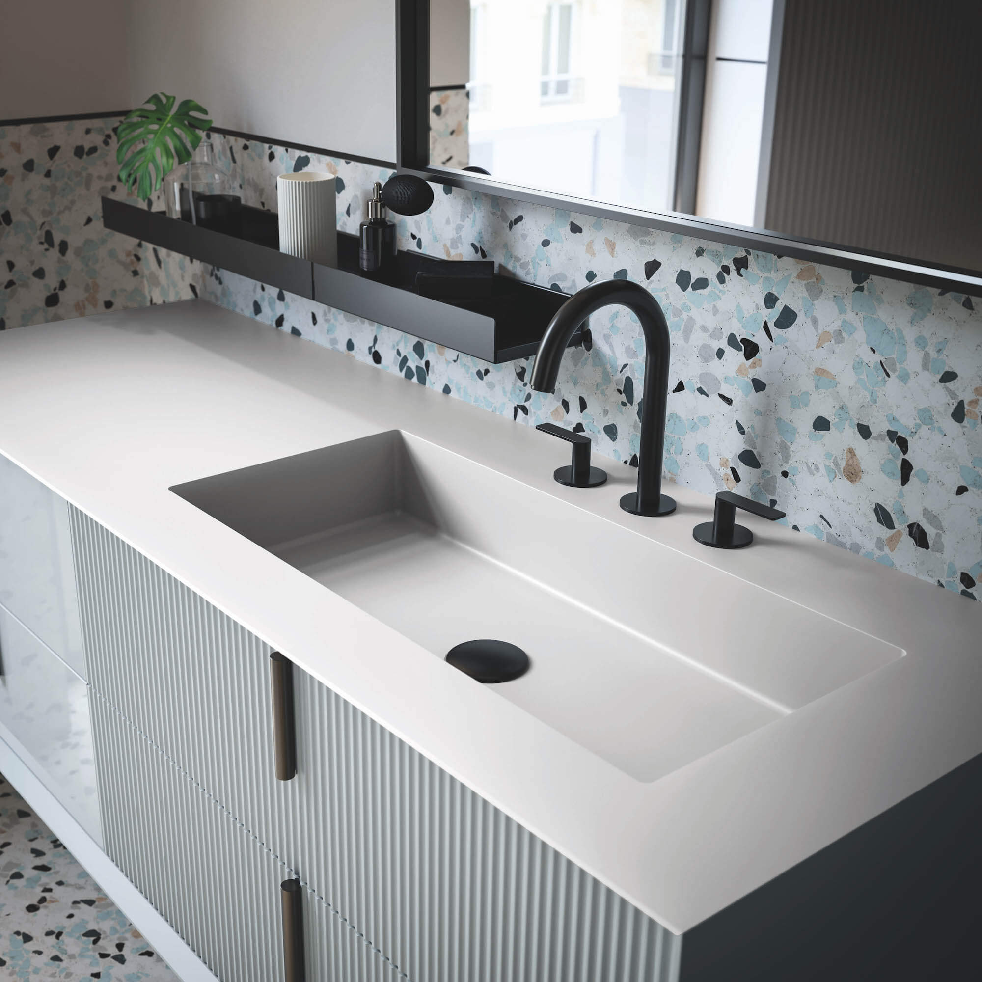VERTIGO can become a decorative element that, wisely dosed, creates extraordinary effects, merging with the other PUNTOTRE collections. In this composition it meets MODULA and plays with the contrasts between glossy and matt. A High Tech mirror, with a matt black aluminium profile, which can be equipped with lighting and managed to various specifications, this is the new BLACK mirror. In detail we appreciate the capacious Tecnoril top basin and the targeted contrast with the “total black” of the mixer group, ideally connected to the handle.