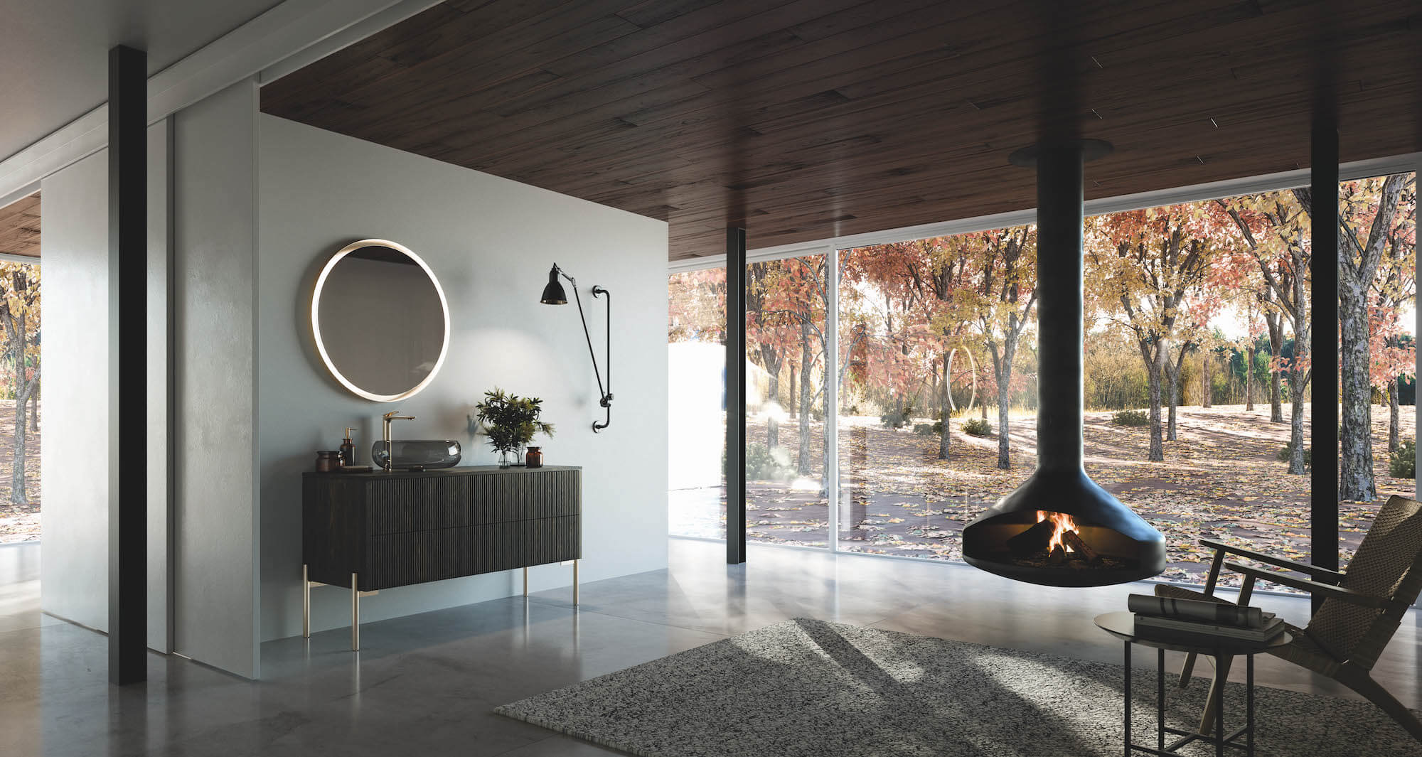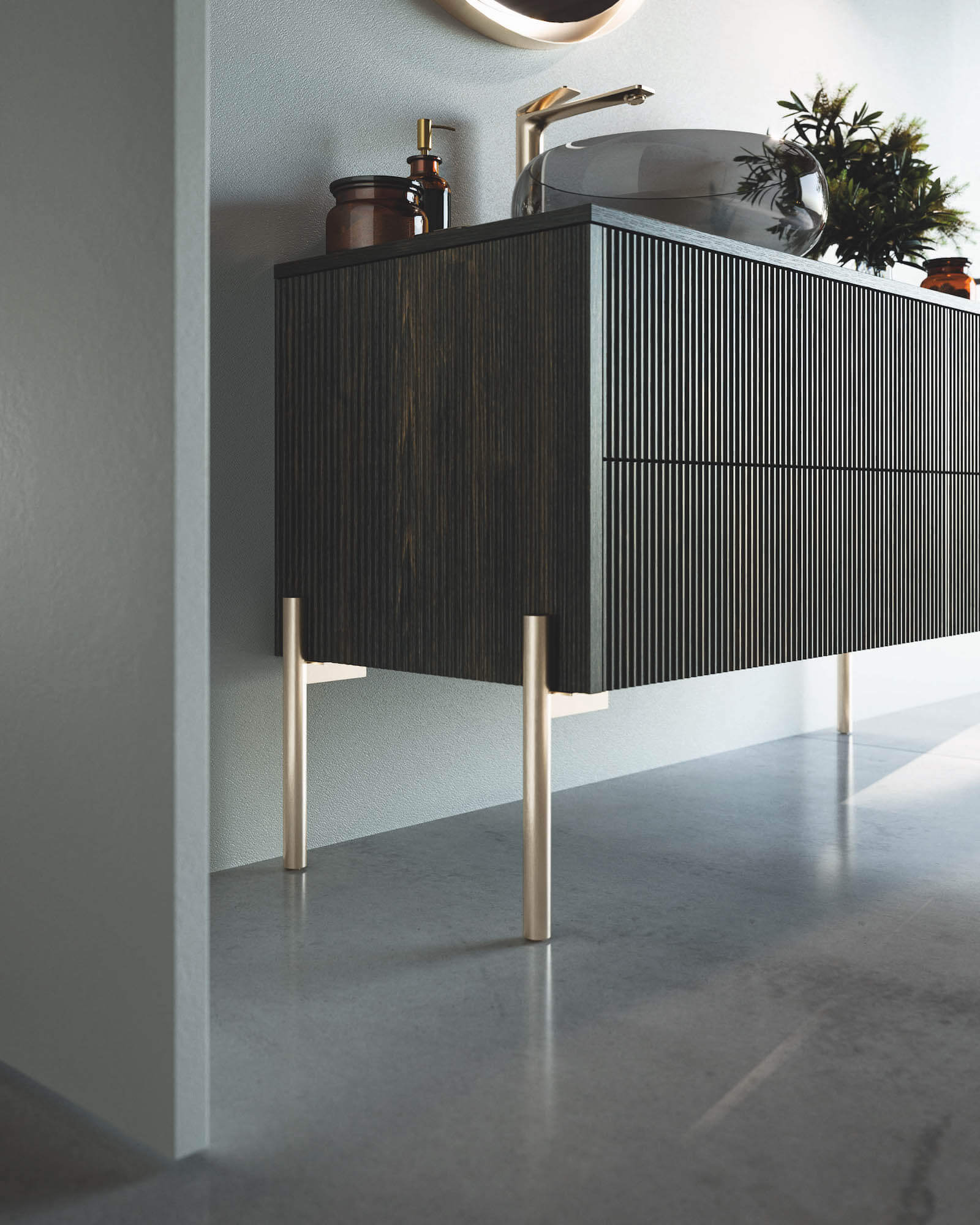 Compact but with a bursting image. In a dream environment, this composition, thanks to the push-pull opening of the fronts, keeps a rich piece of furniture essential. A rich but minimalist design foot that fits into the curves of VERTIGO, here combined with optional finishing sides. The SOLE mirror is full of charm, made in matt white as standard, and is available in optional brass and oxidized finishes.