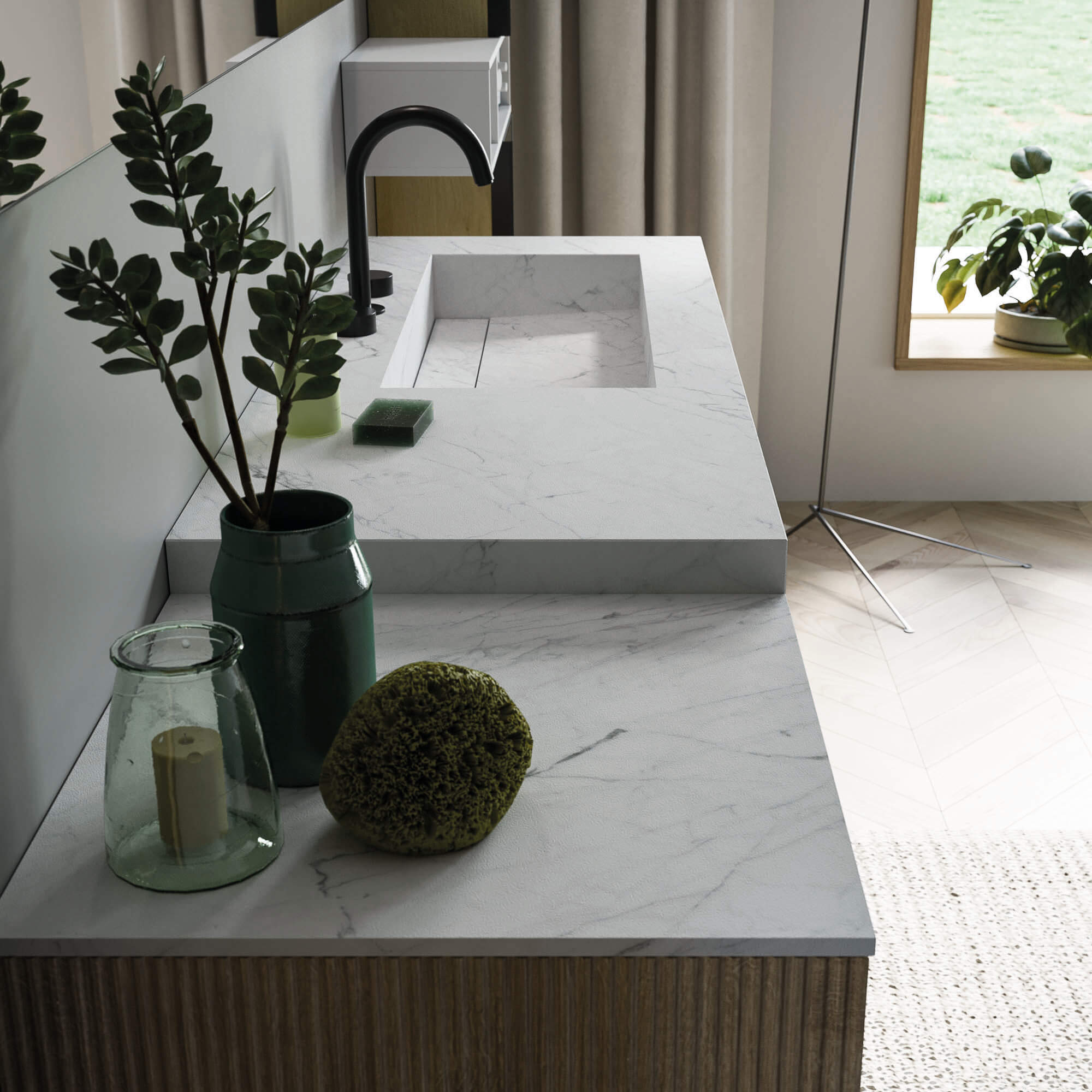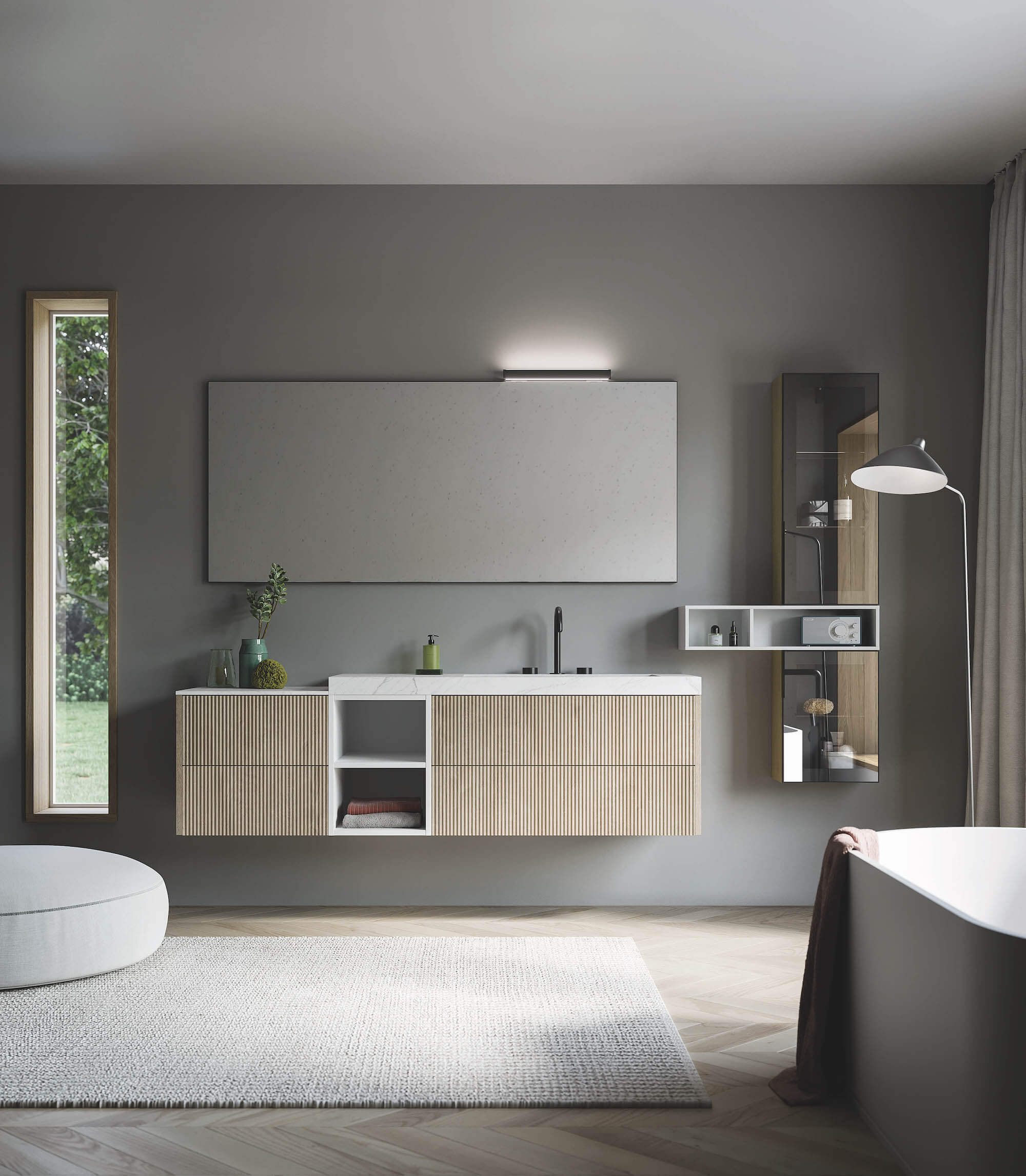 An environment, emphasized by the combination of light wood, white and stoneware shades, fresh, young, very current. Like a set stone, the Statuarietto stoneware top combines with the furniture. The open compartment in white emphasizes this effect even more. An elegant two-level effect, thanks to the use of tops in 12 and 60 mm, characterizes this view, note the interesting VEGA basin with inspectionable drain.
