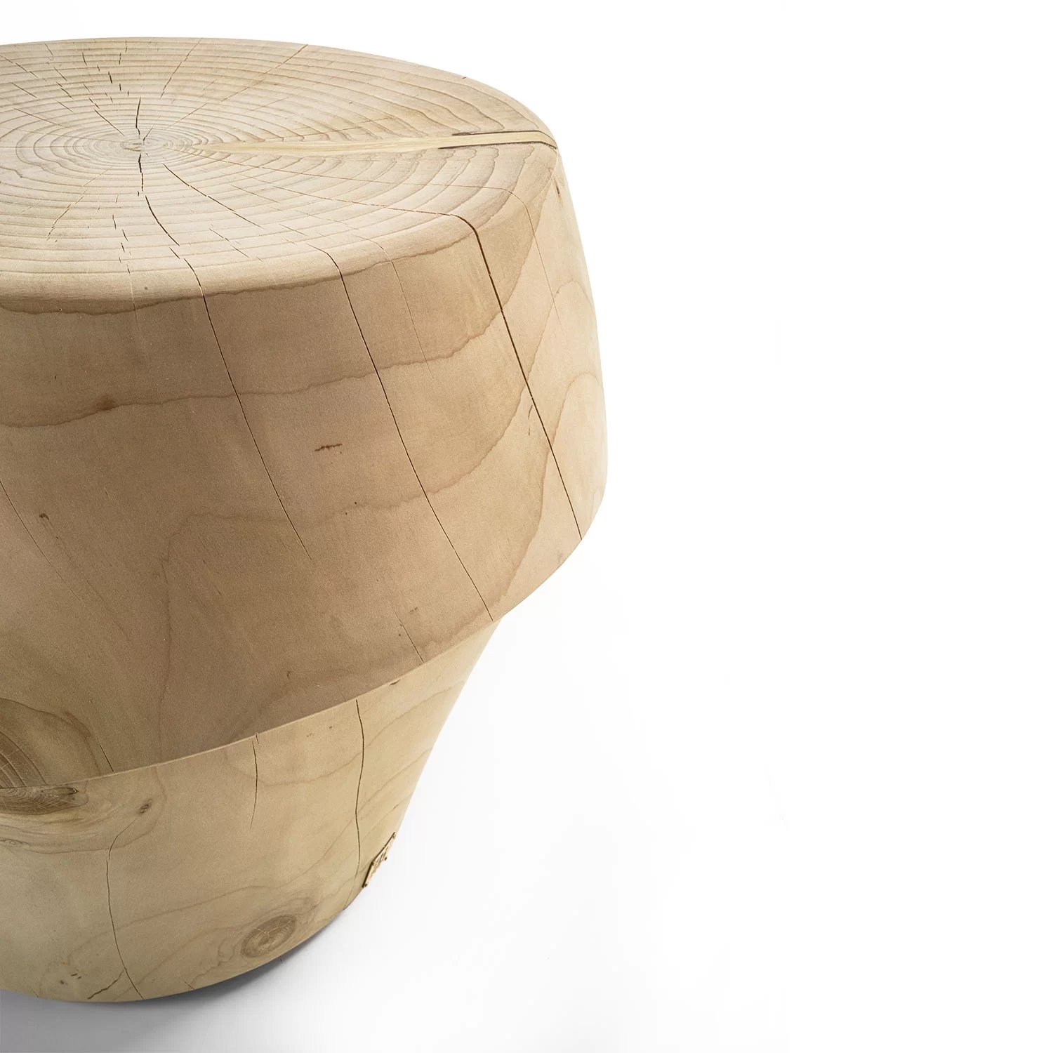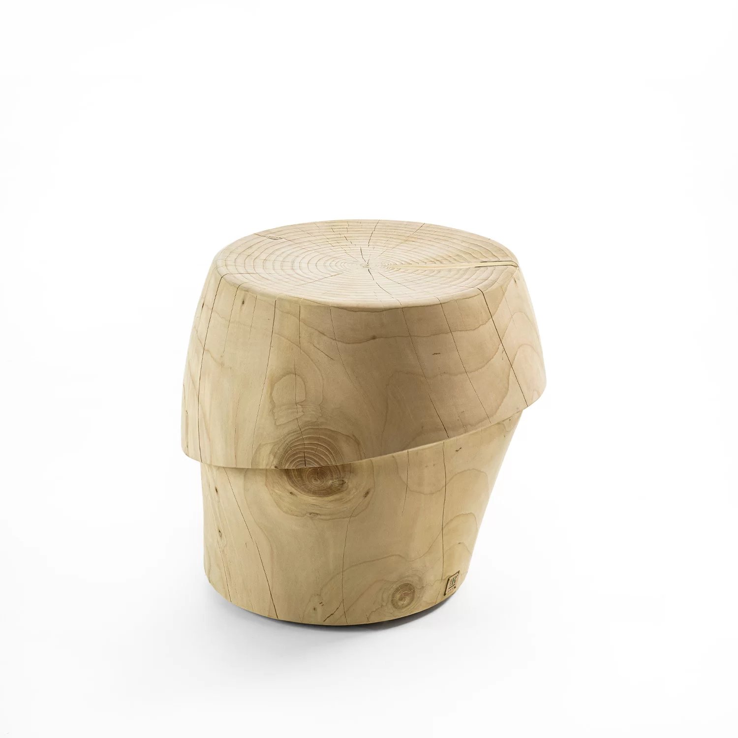 Sgabello in legno massello di cedro profumato lavorato da un blocco unico, con design ispirato ad un casco.