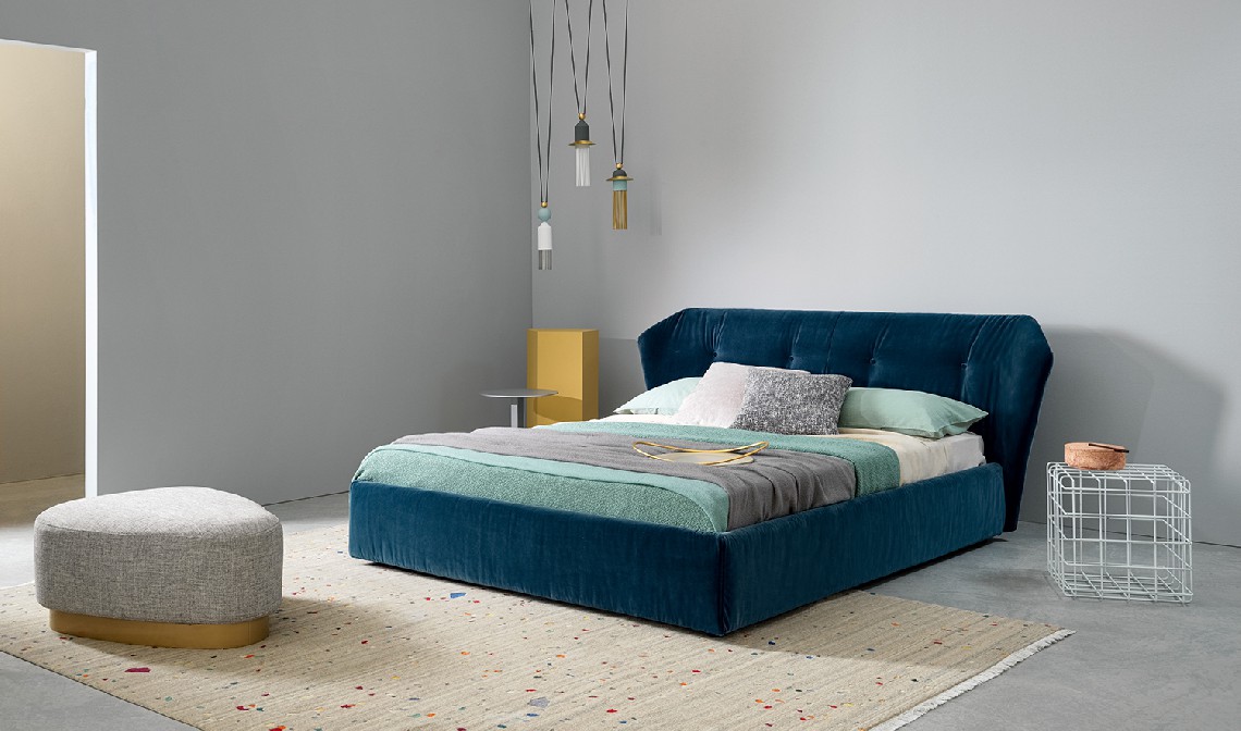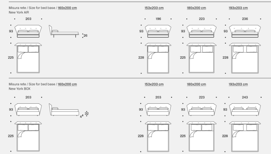 The variation with a floor bed frame offers a fuller option and expresses the classic identity of the New York line, maintaining the iconic quilted headrest.