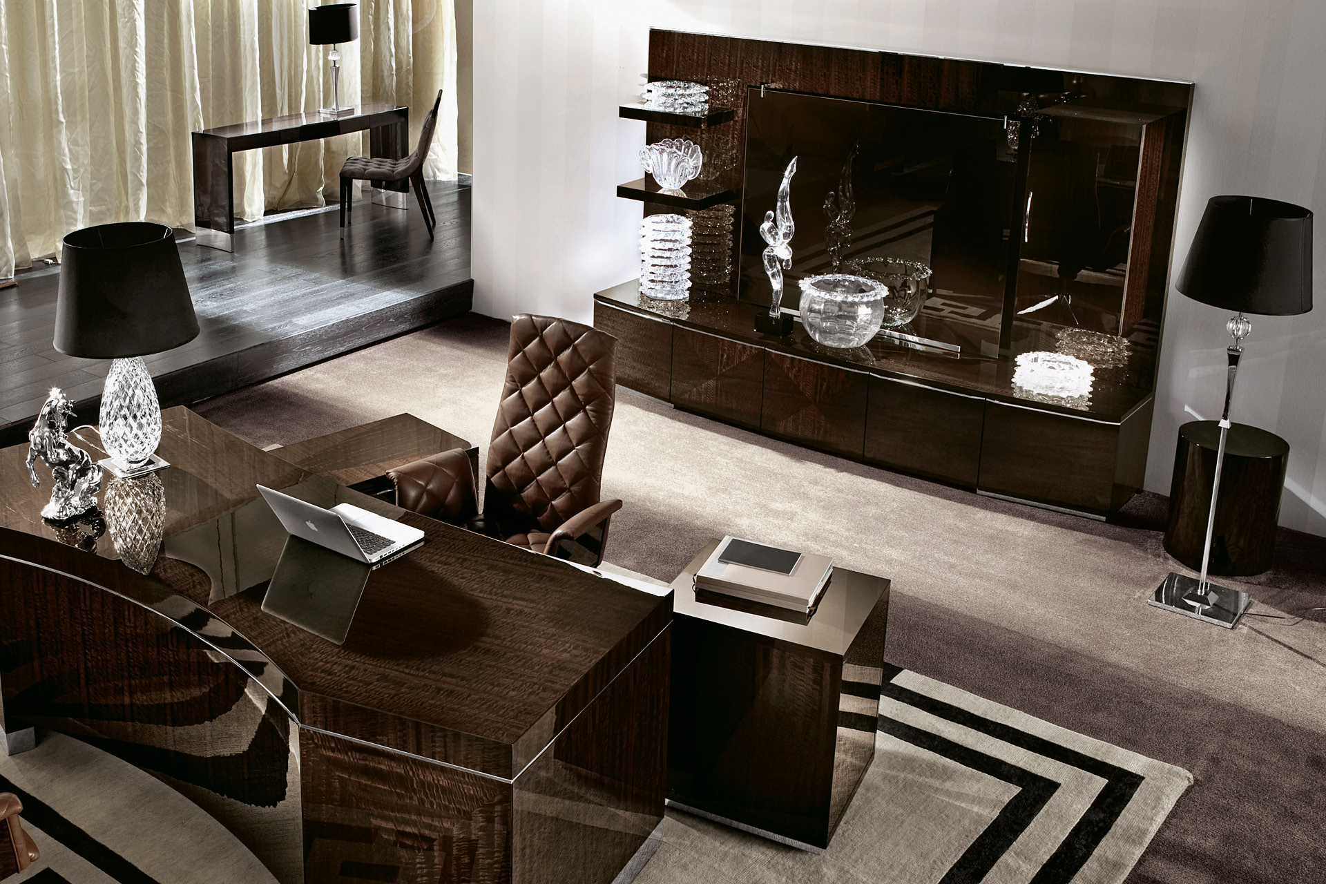 Plasma TV unit in european curly eucalyptus in high gloss polyester. Base w/4 big doors, upper wooden unit w/door and two interior glass shelves, 2 fix wooden shelves with led light system. Back panel in coloured brown glass w/led light system. Base and handles in chrome stainless steel.