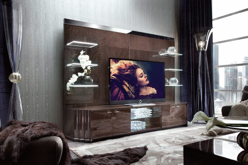 T.V. unit in moka japanese tamos burl veneer in high gloss polyester. Base w/4 doors and 1 open space w/glass shelf with led light, back panel with 6 fix glass shelves with led Light system. Base, top trims and handles in chrome stainless steel.