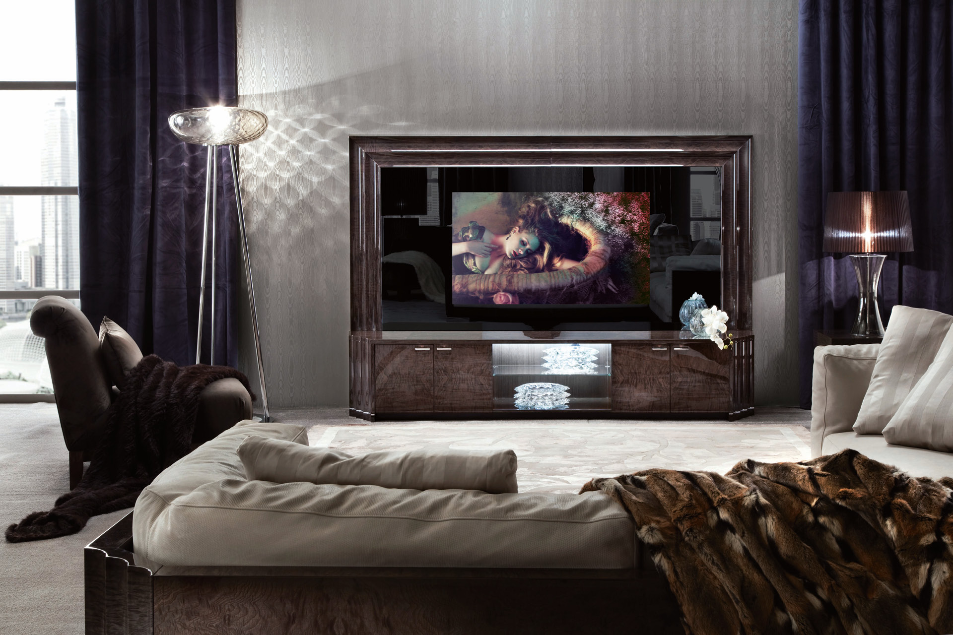 T.V. unit in moka japanese tamos burl veneer in high gloss polyester. Base w/4 doors and 1 open space w/glass shelf with led light. Back mirrored panel that accomodate a special LO?WE plasma TV.