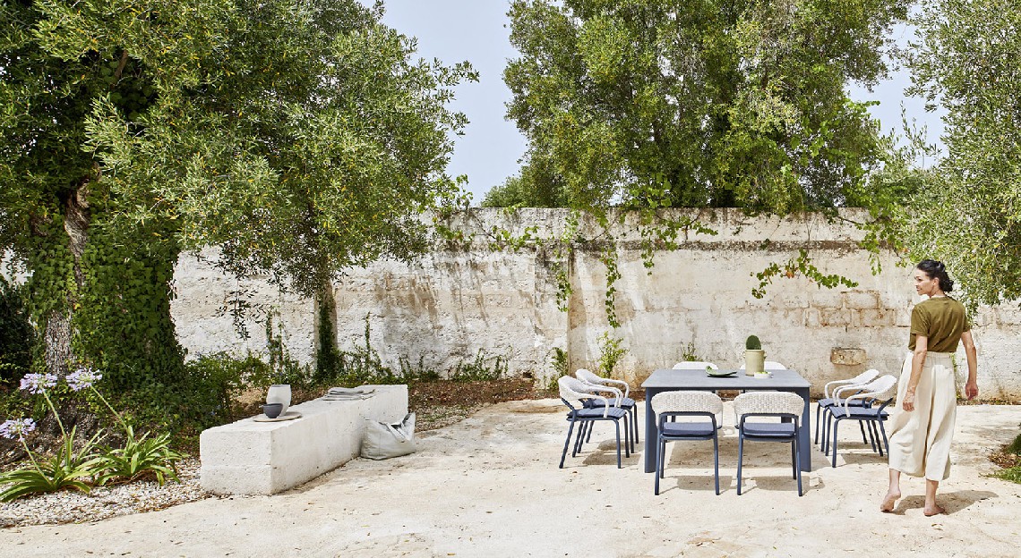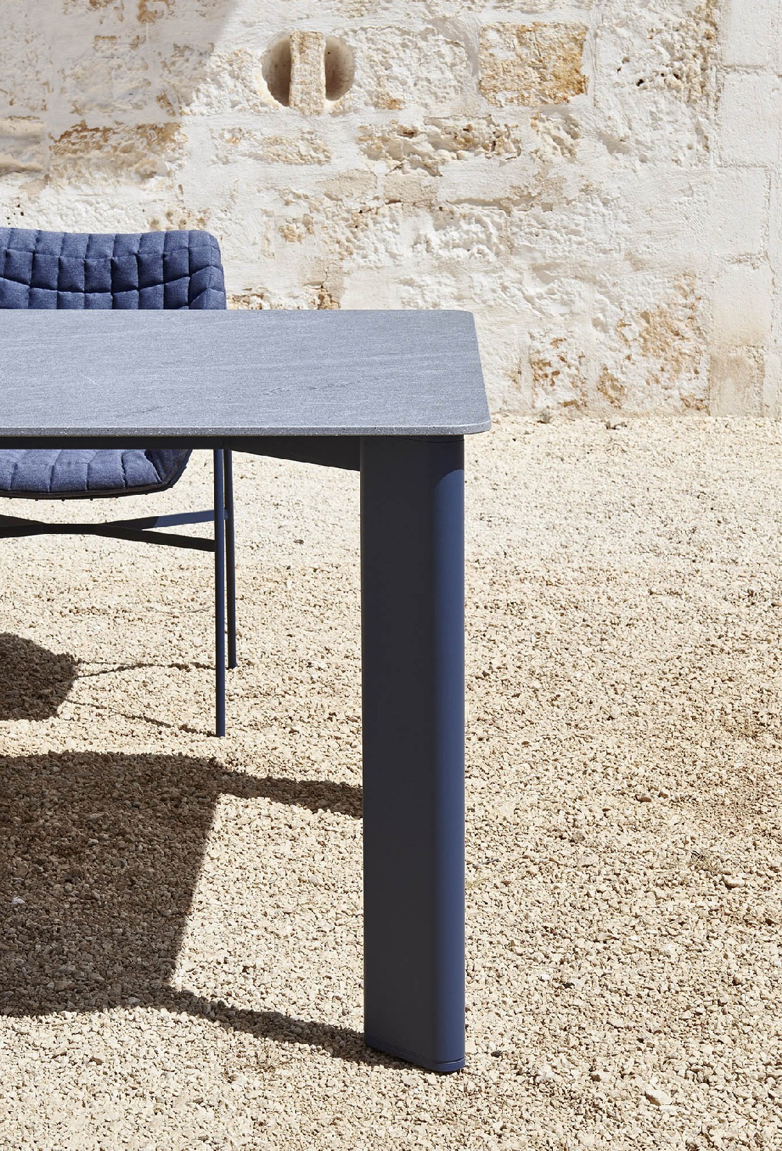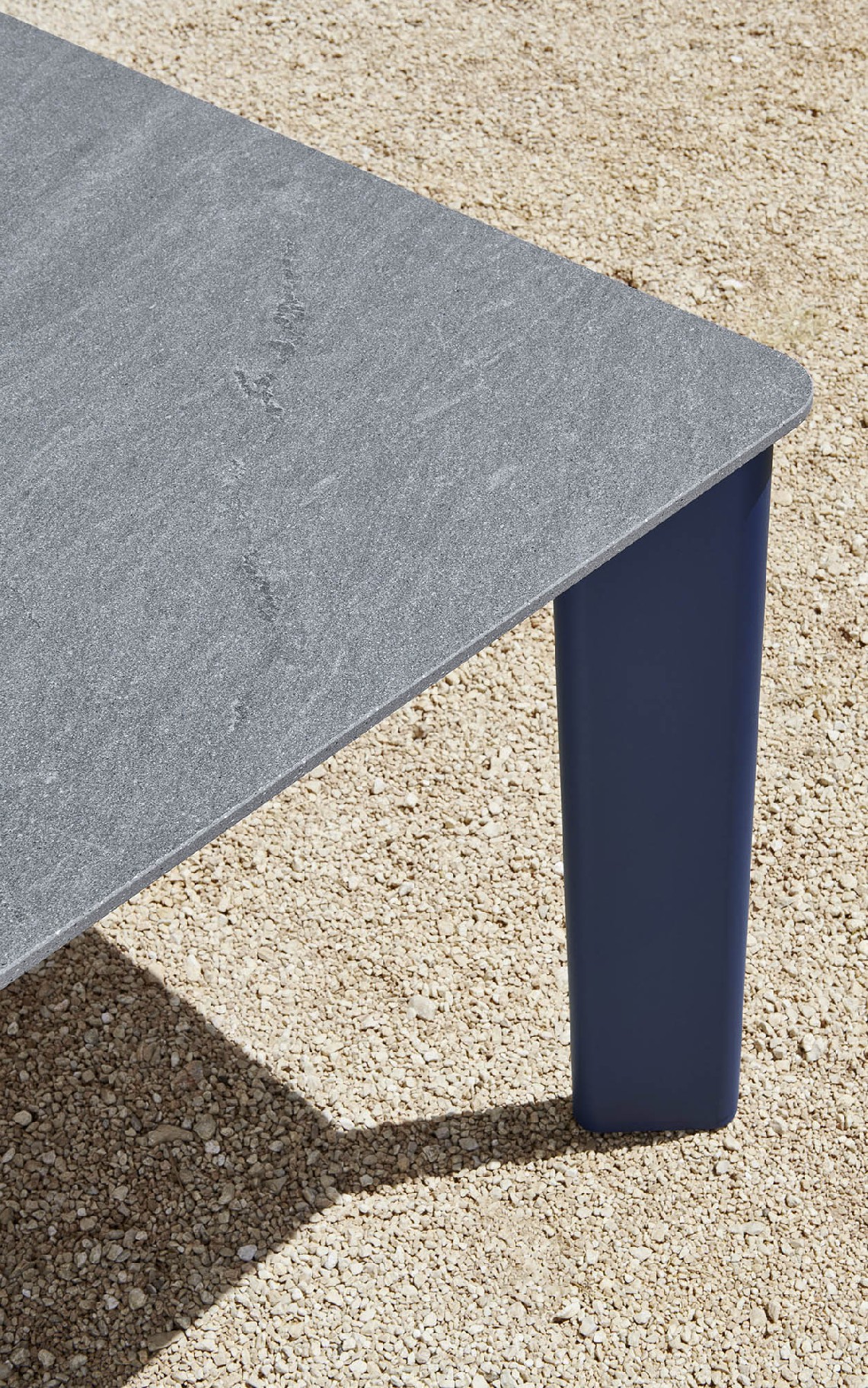 Perfect combination with lounge chairs, to spend pleasant convivial moments in the open air, the Plinto low table is chosen for both residential and contract environments.