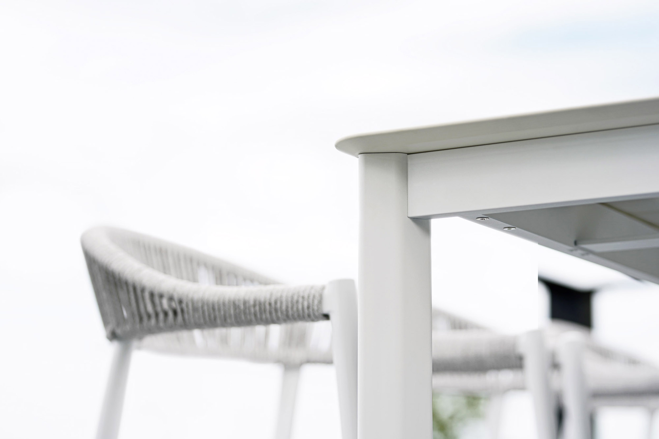 System is a collection of tables with an essential design, based on regular lines, slender thicknesses and rounded edges. The purity of the leg section and the soft and rounded shape of the tops give shape to a light and robust silhouette, perfect for decorating gardens, terraces, balconies or verandas in both residential and contract settings.
