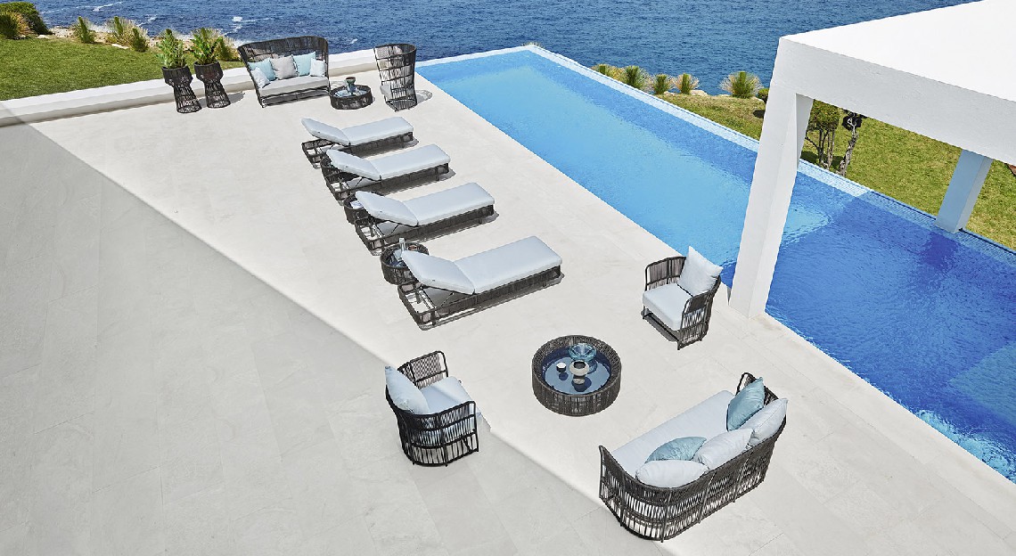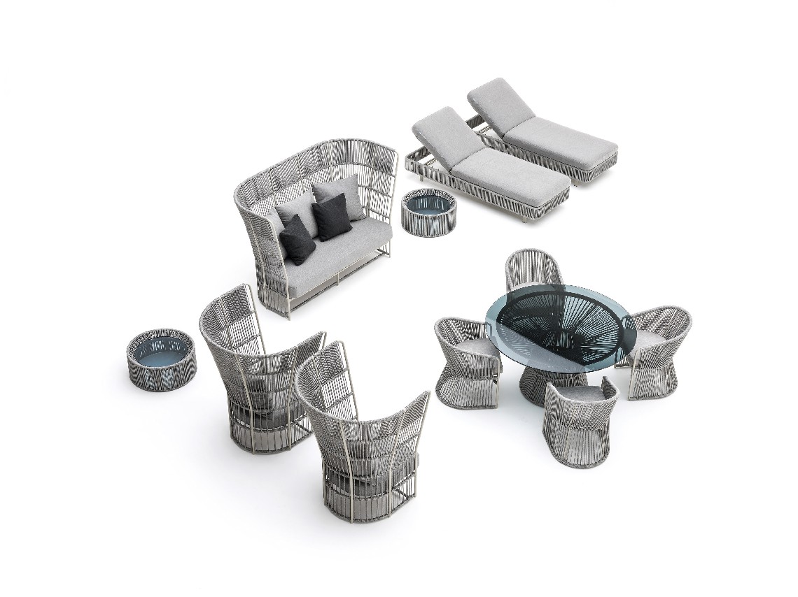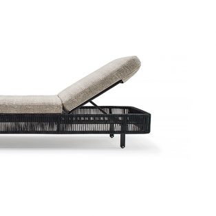 The elegant and sober design of the Tibidabo sunbed is designed to harmonize with different types of environment, from the home garden to the hotel terrace. A few simple elements to give shape to outdoor comfort: from the large cushion to the adjustable backrest. All embellished with a weaving in synthetic rope that outlines the profile of the painted aluminum structure.