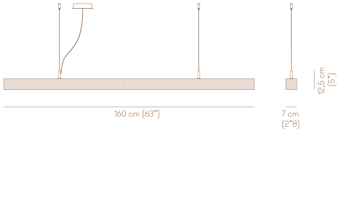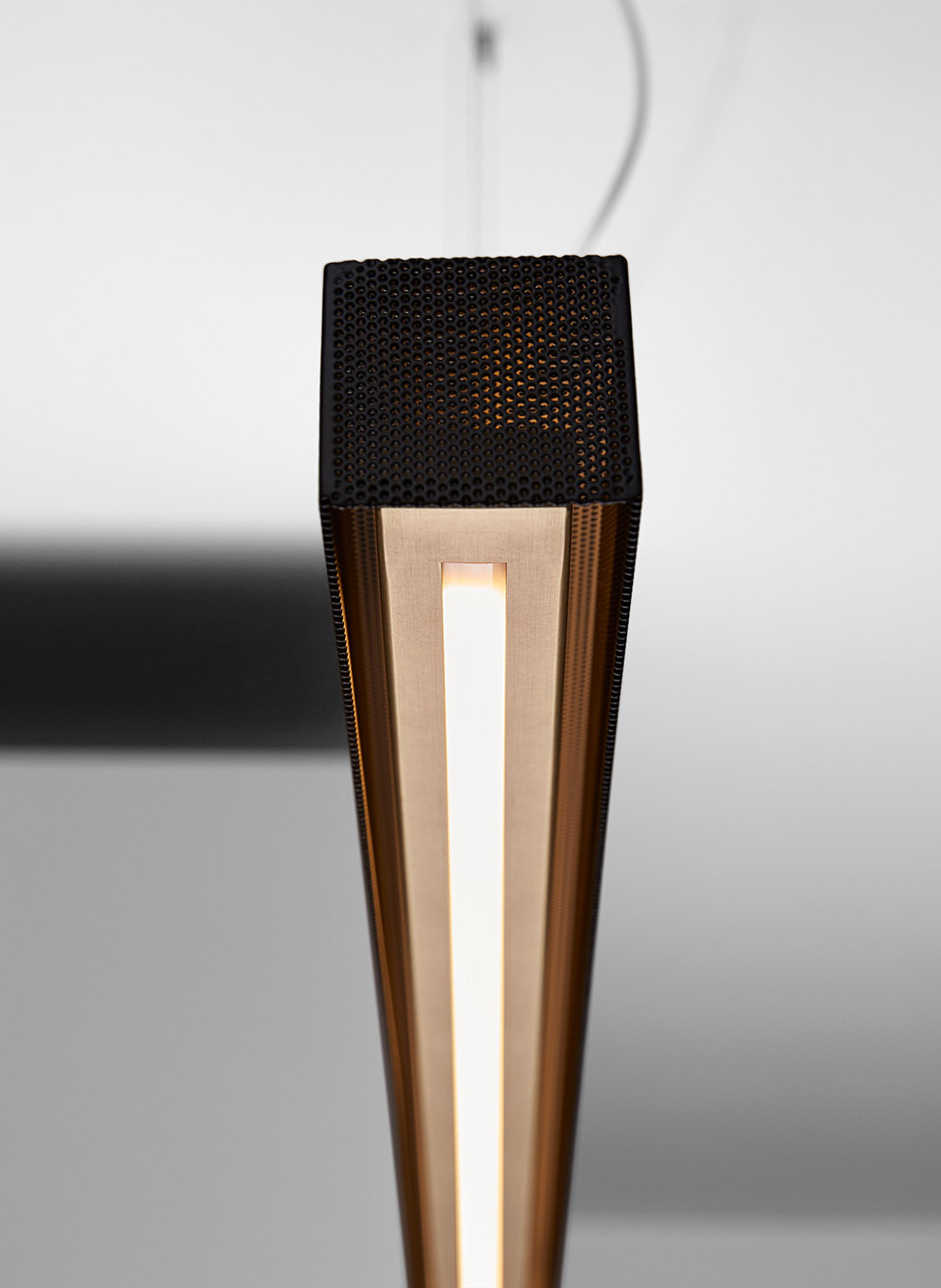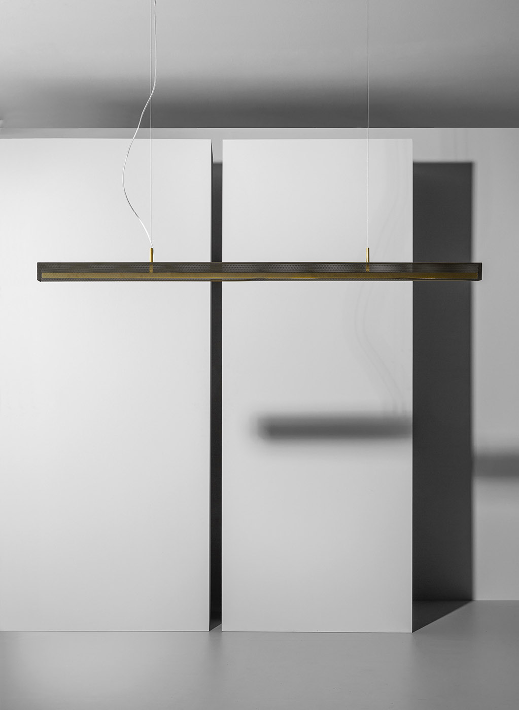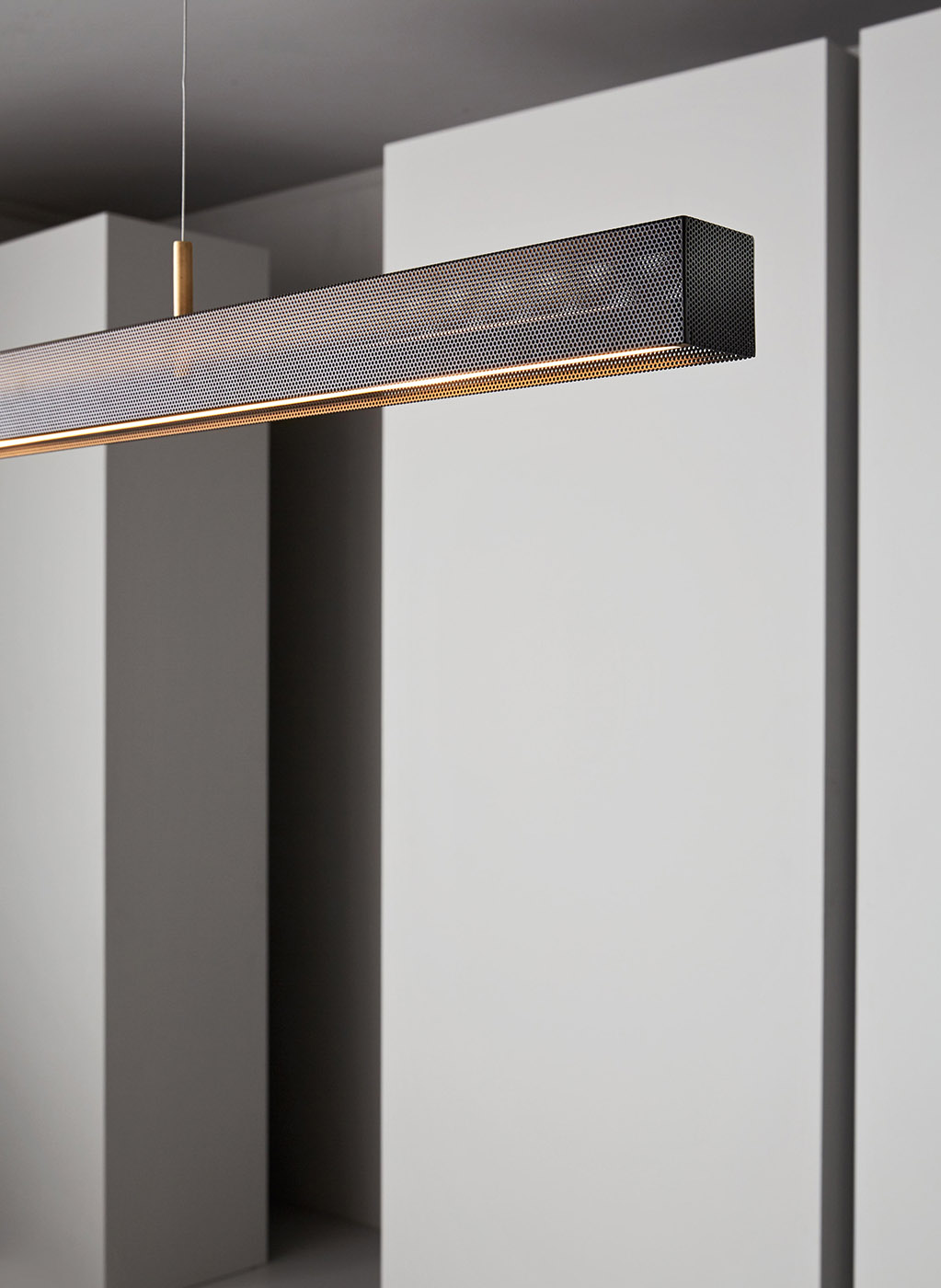 Suspended lamp with direct and indirect light. Light burnished brass structure and matte black perforated metal lampshade.