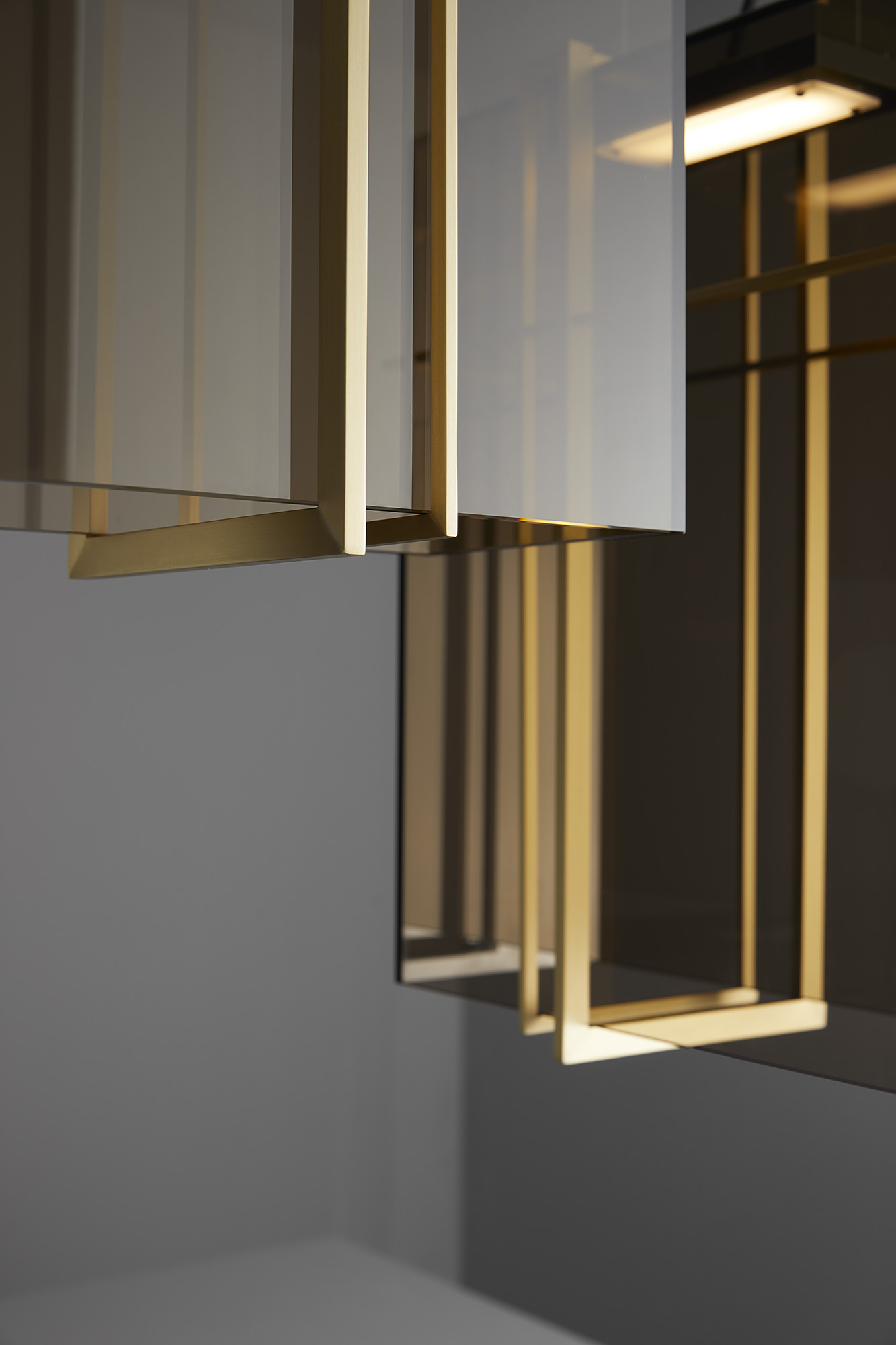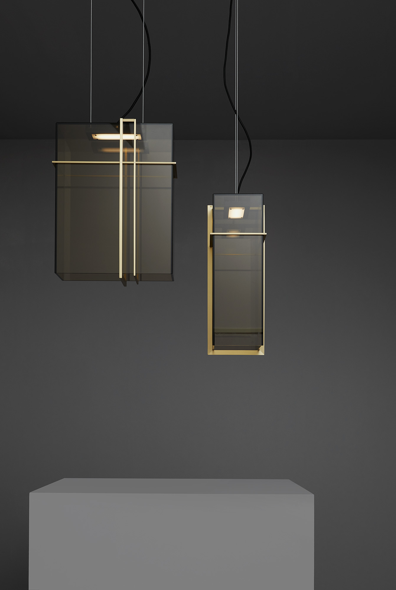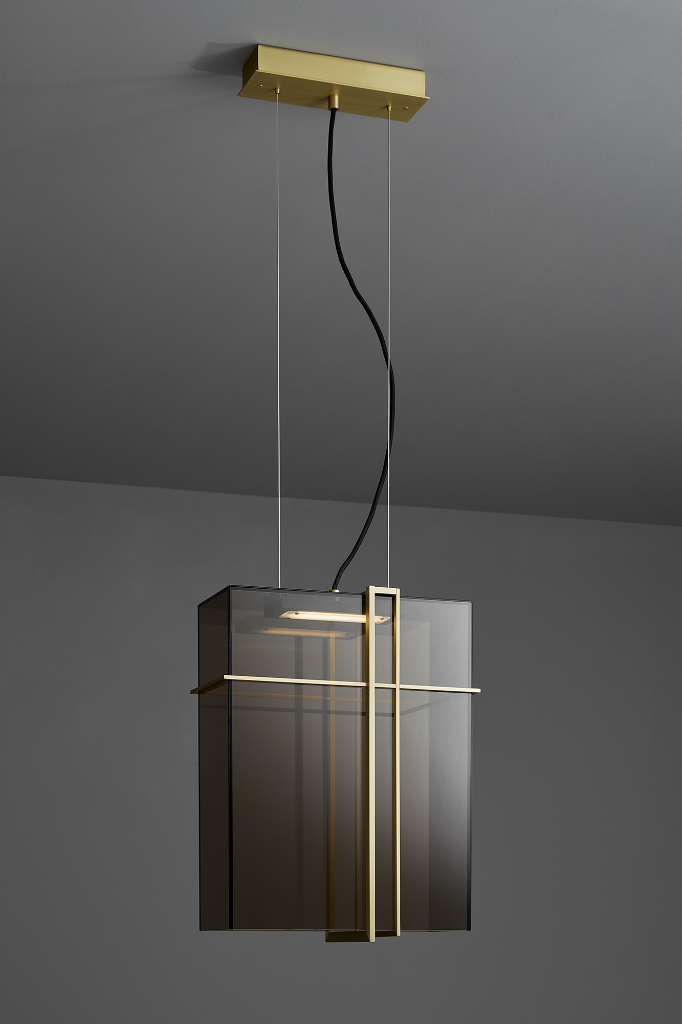 Suspension lamp with indirect light. Light buirnished brass structure with bronze trasparent glass diffuser.