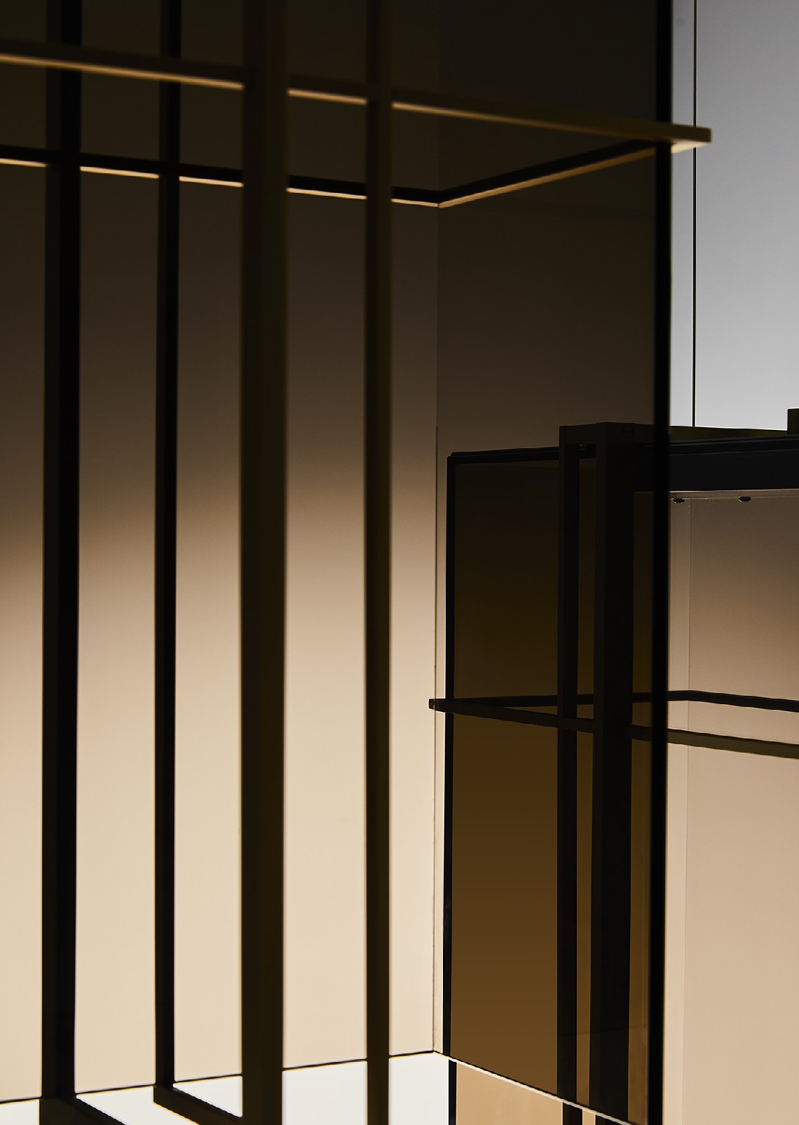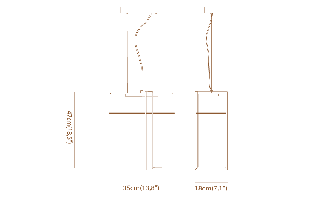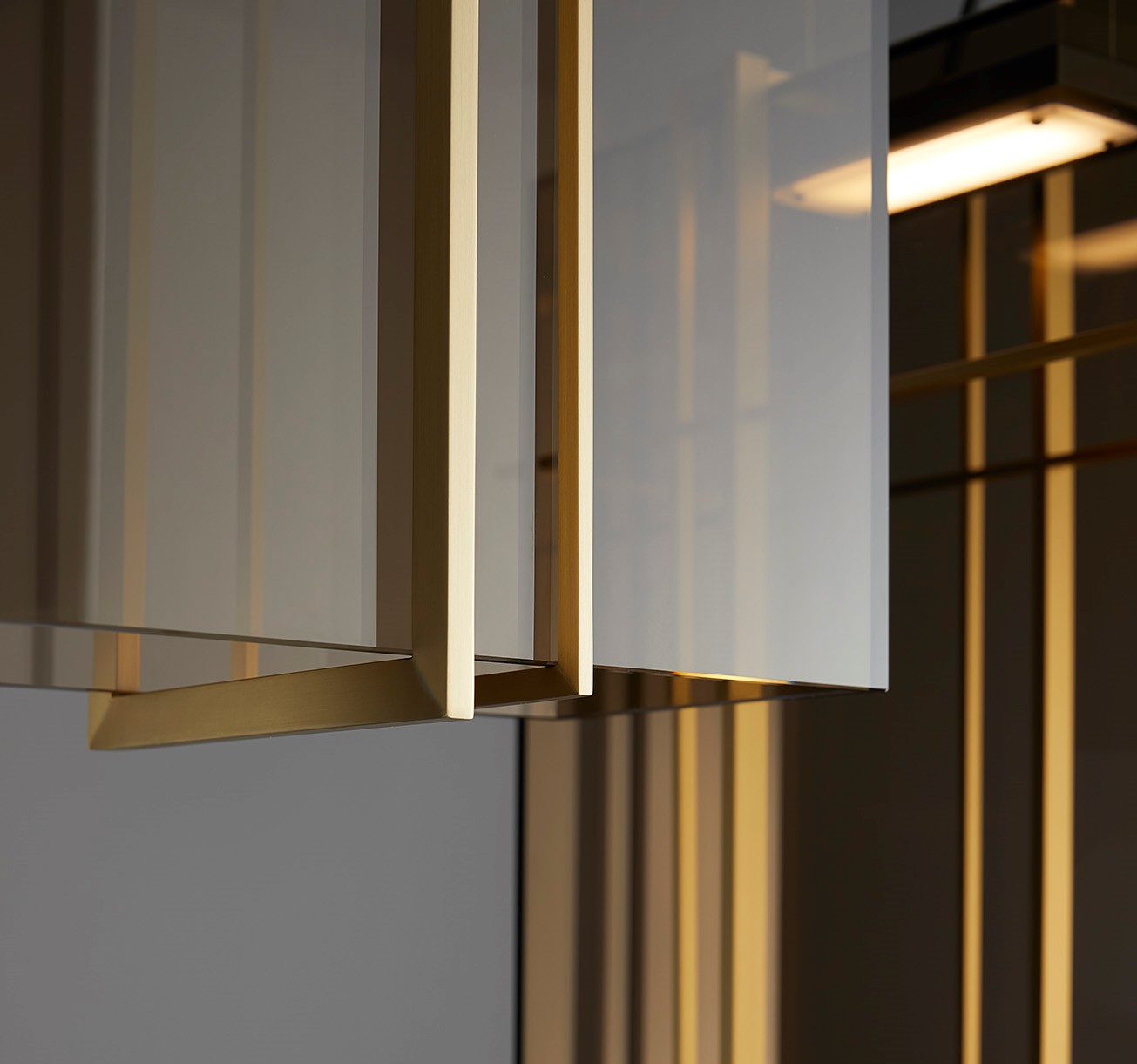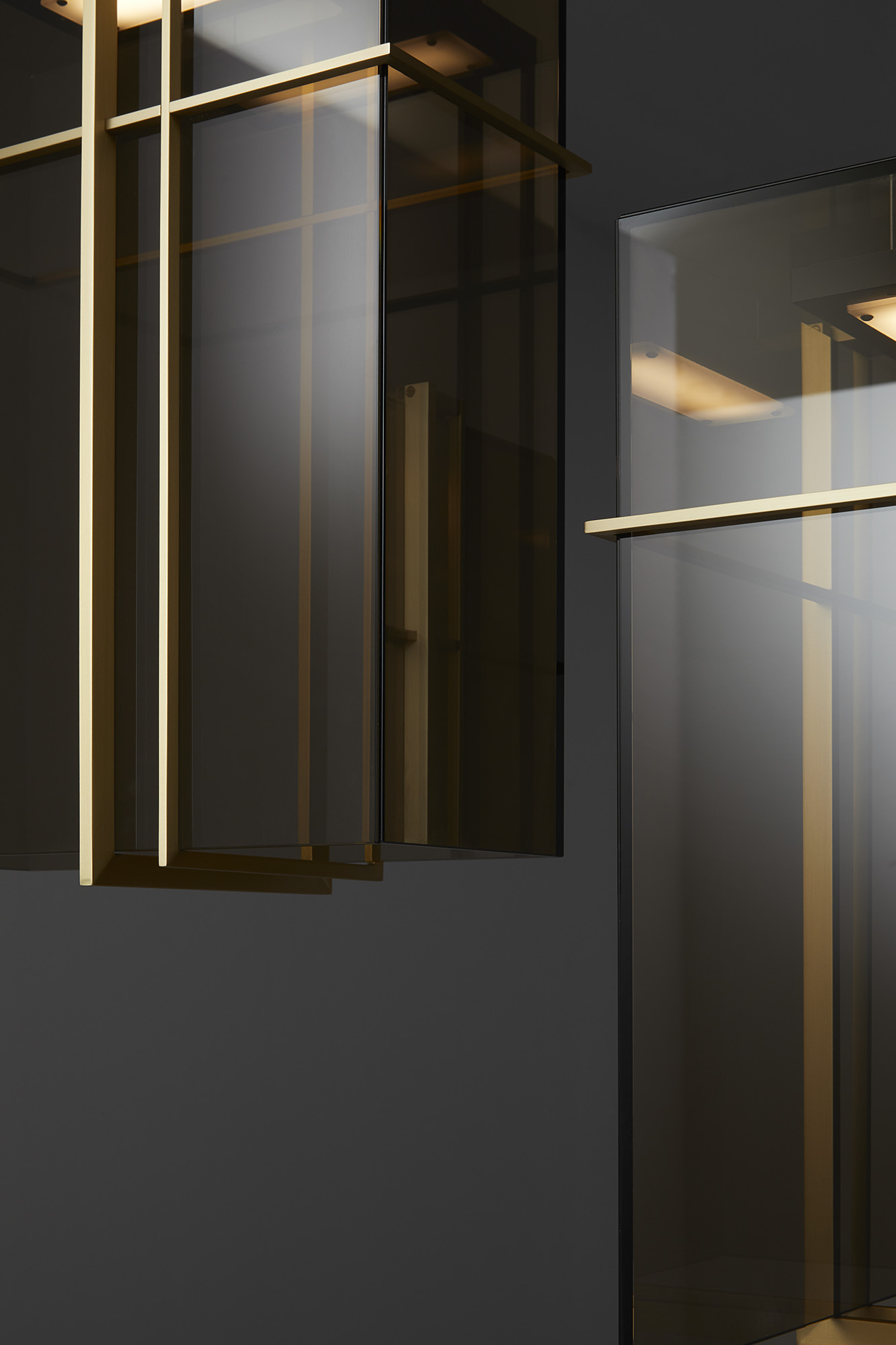 Suspension lamp with indirect light. Light buirnished brass structure with bronze trasparent glass diffuser.