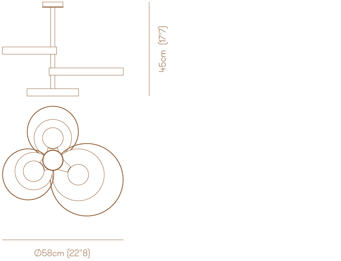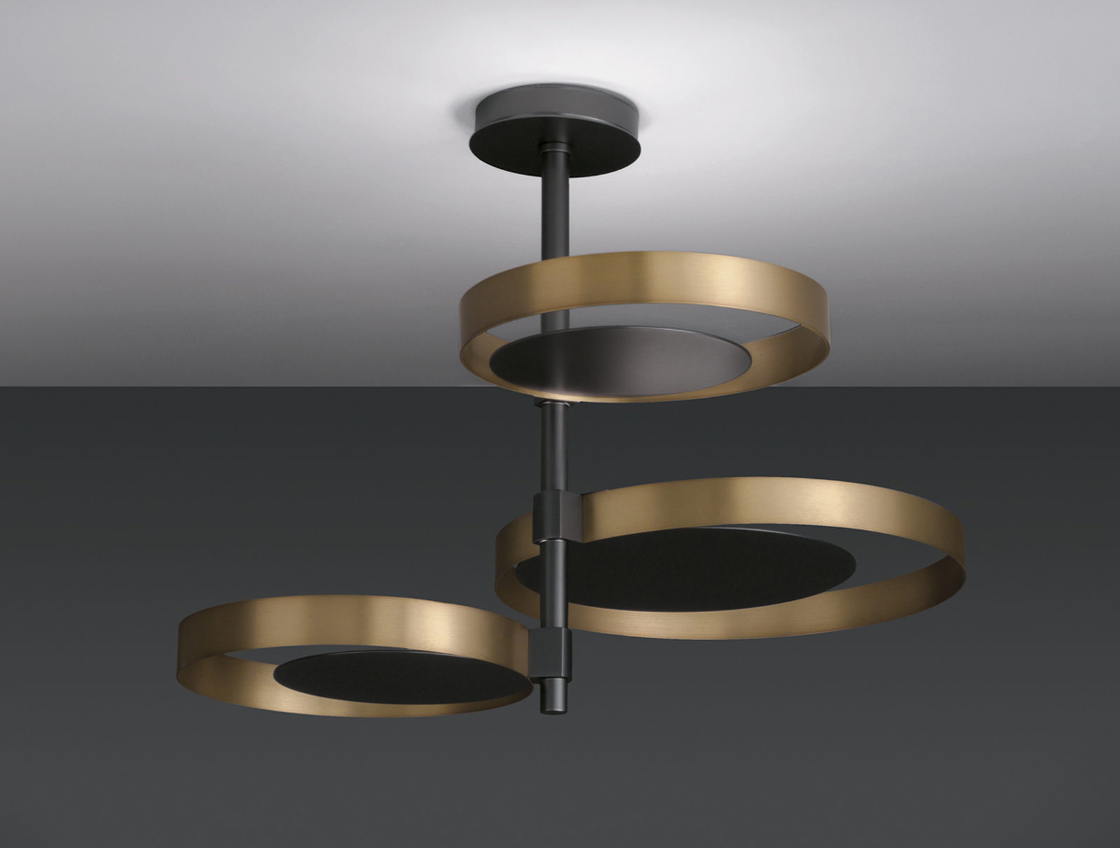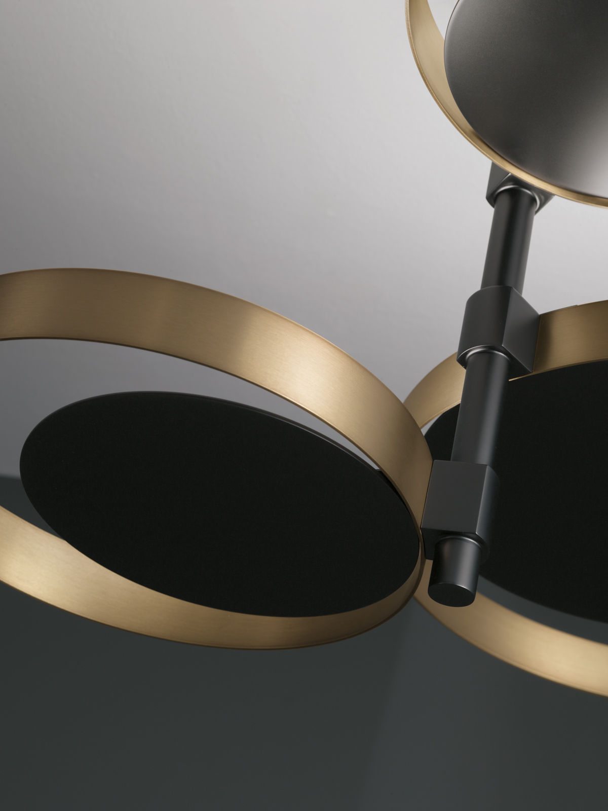 Ceiling lamp with indirect light. Light burnished brass rings and matte black nickel structure.