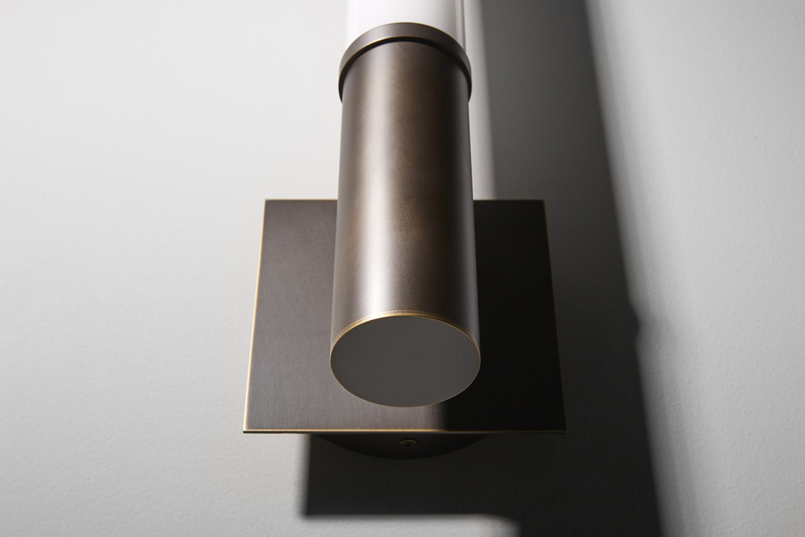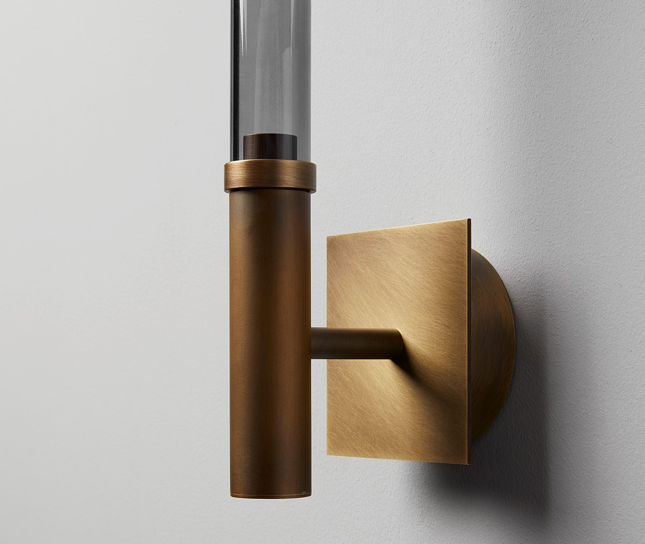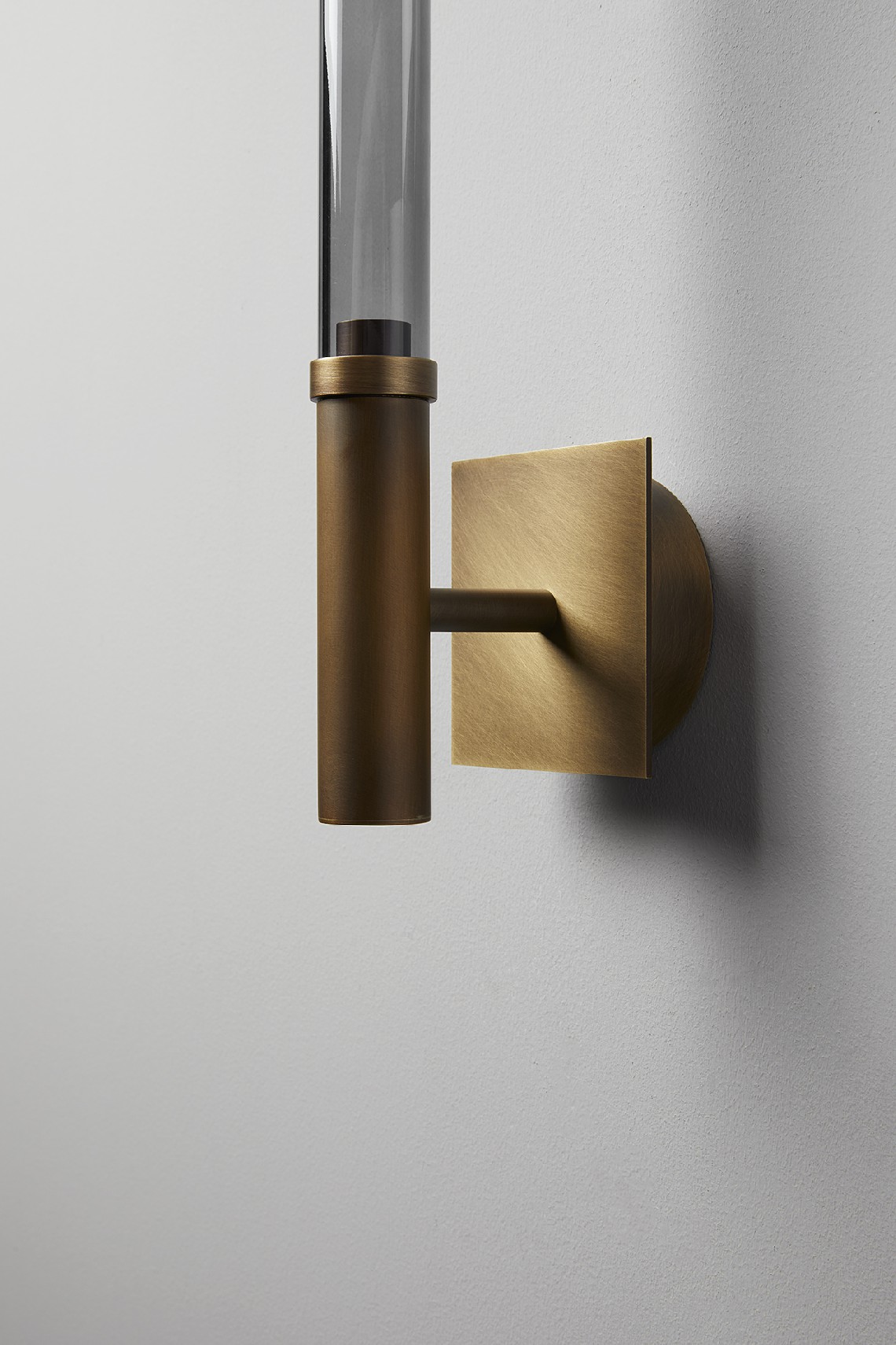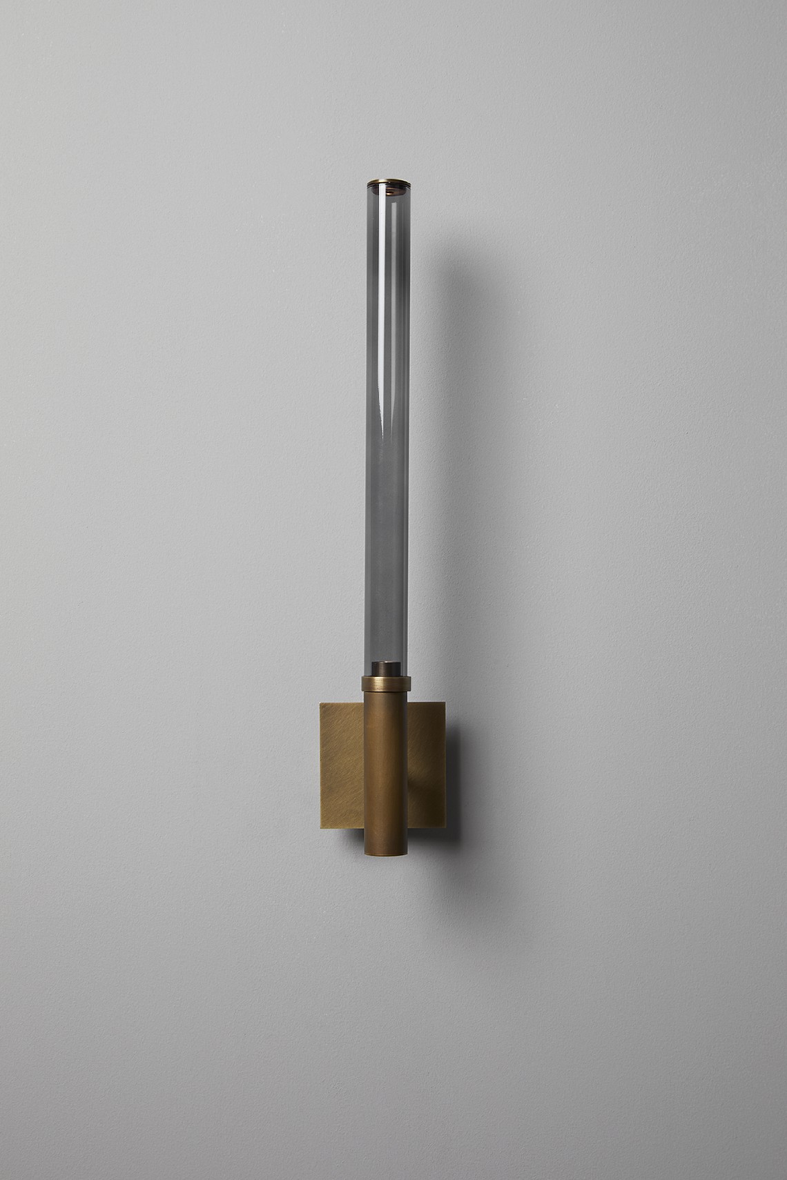 Wall lamp with diffused light. Brushed burnished brass structure and white or smoke grey Murano blown glass diffuser.