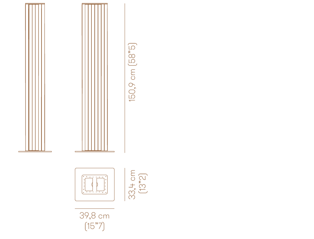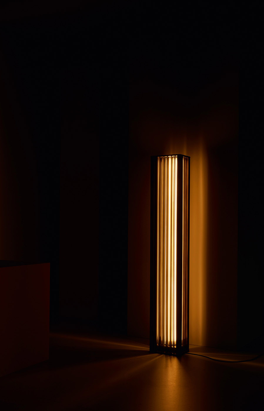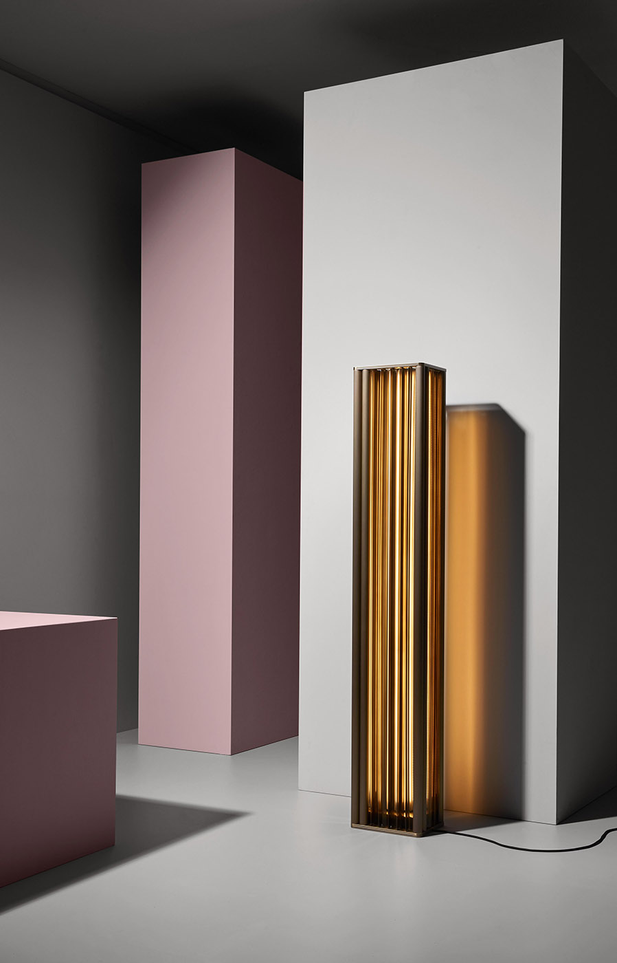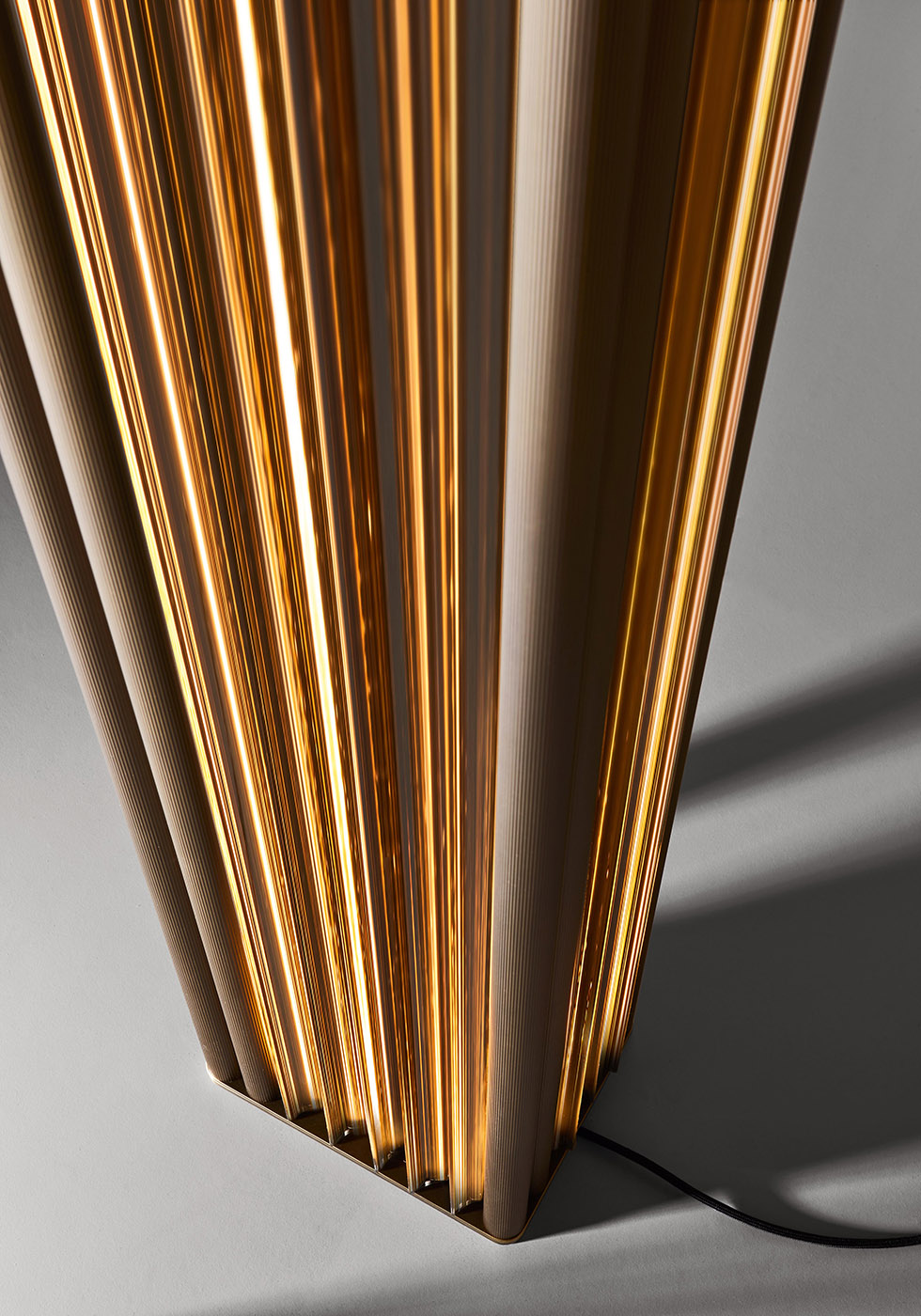 Floor lamp with diffused light. Dark burnished brass structure and crystal, amber or smoke grey Murano blown glass trihedrons.
