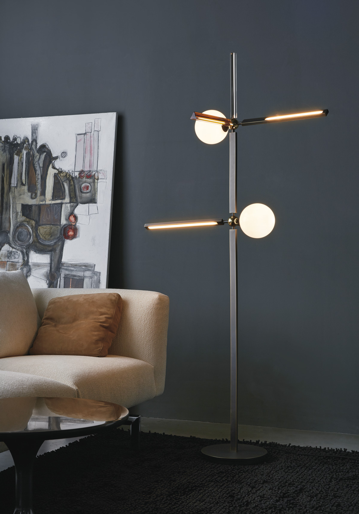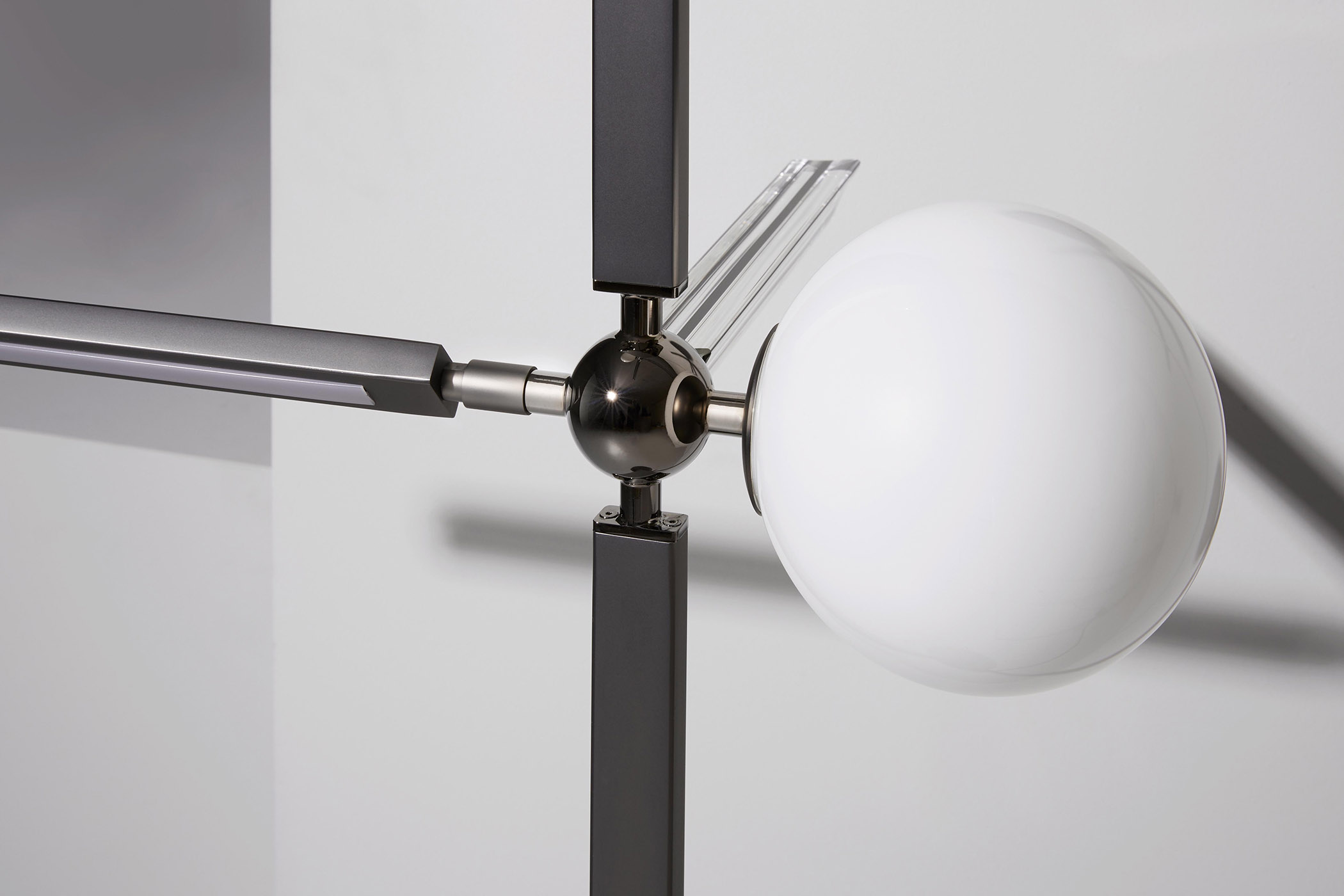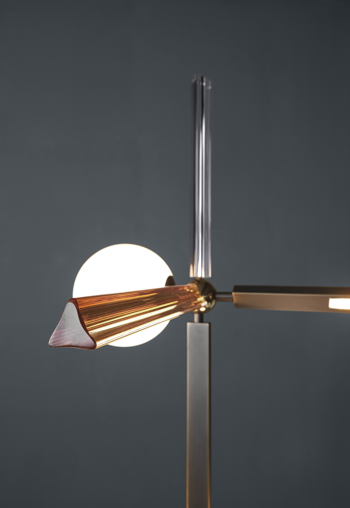Floor lamp with diffused and direct light. Dark burnished brass structure with polished gold metal spheres or matte black nickel structure with polished black nickel metal spheres. White Murano blown glass diffusers and crystal, smoke grey or amber Murano blown glass trihedrons.