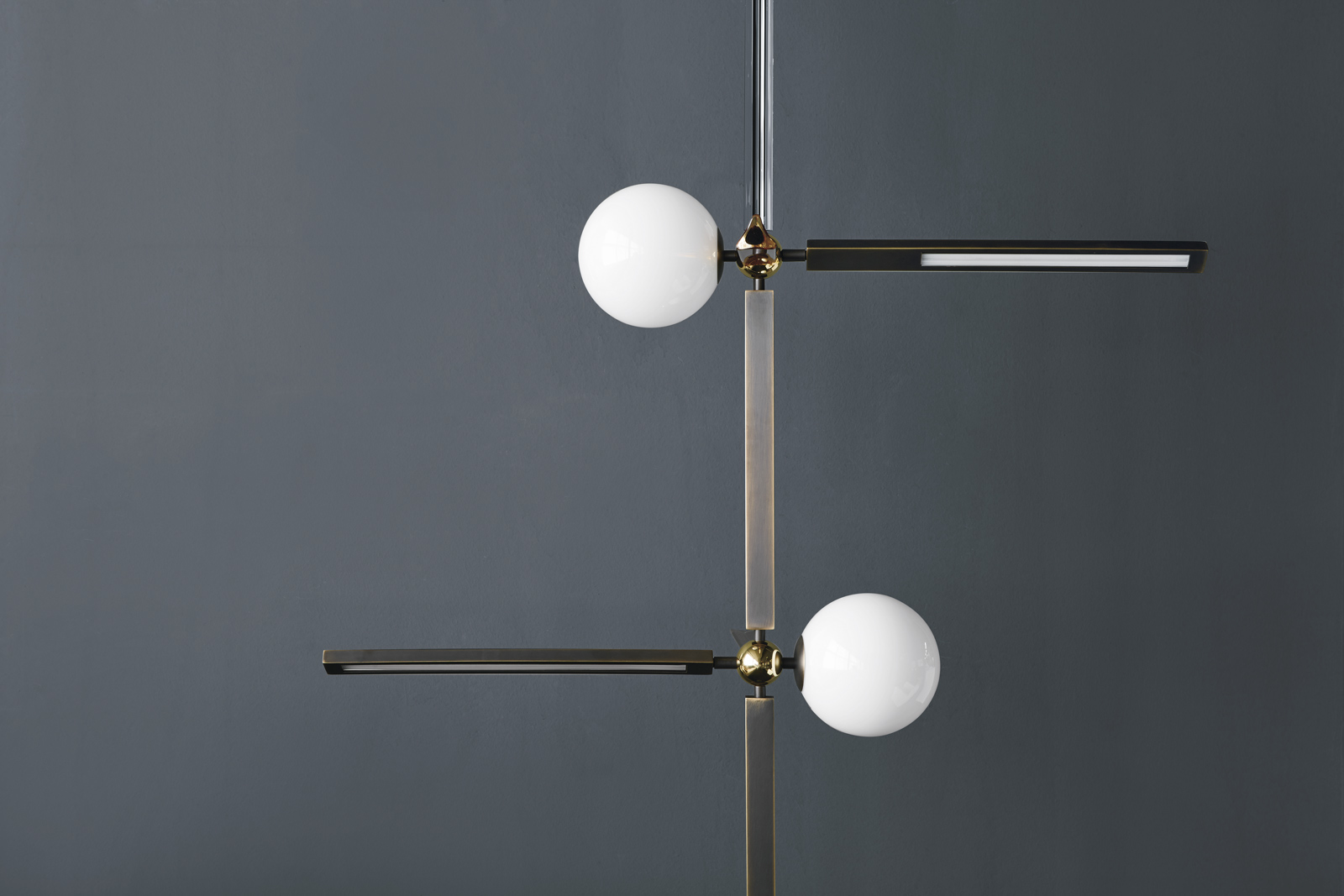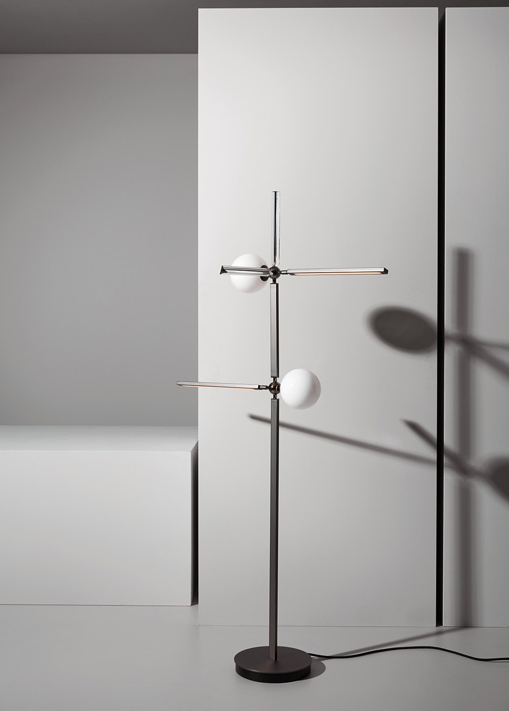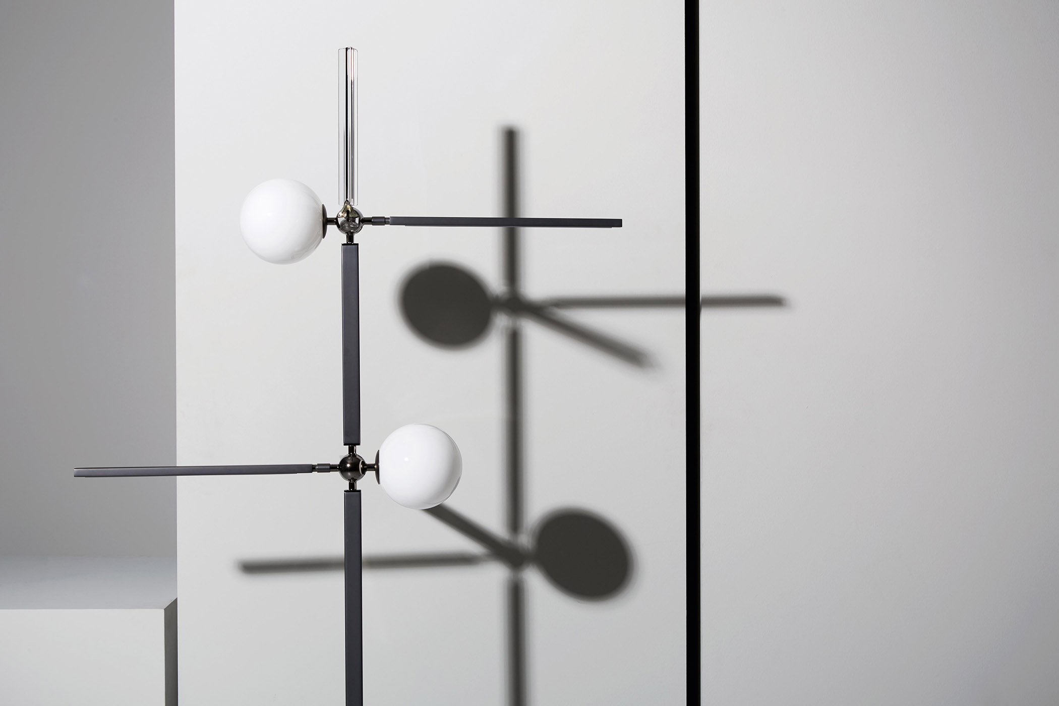 Floor lamp with diffused and direct light. Dark burnished brass structure with polished gold metal spheres or matte black nickel structure with polished black nickel metal spheres. White Murano blown glass diffusers and crystal, smoke grey or amber Murano blown glass trihedrons.