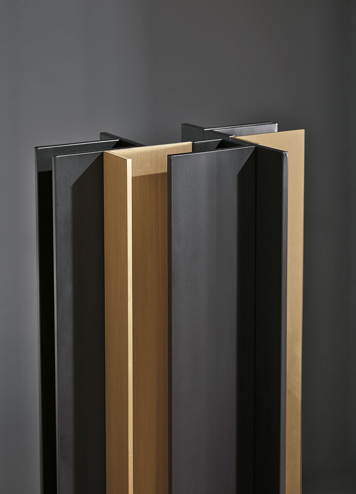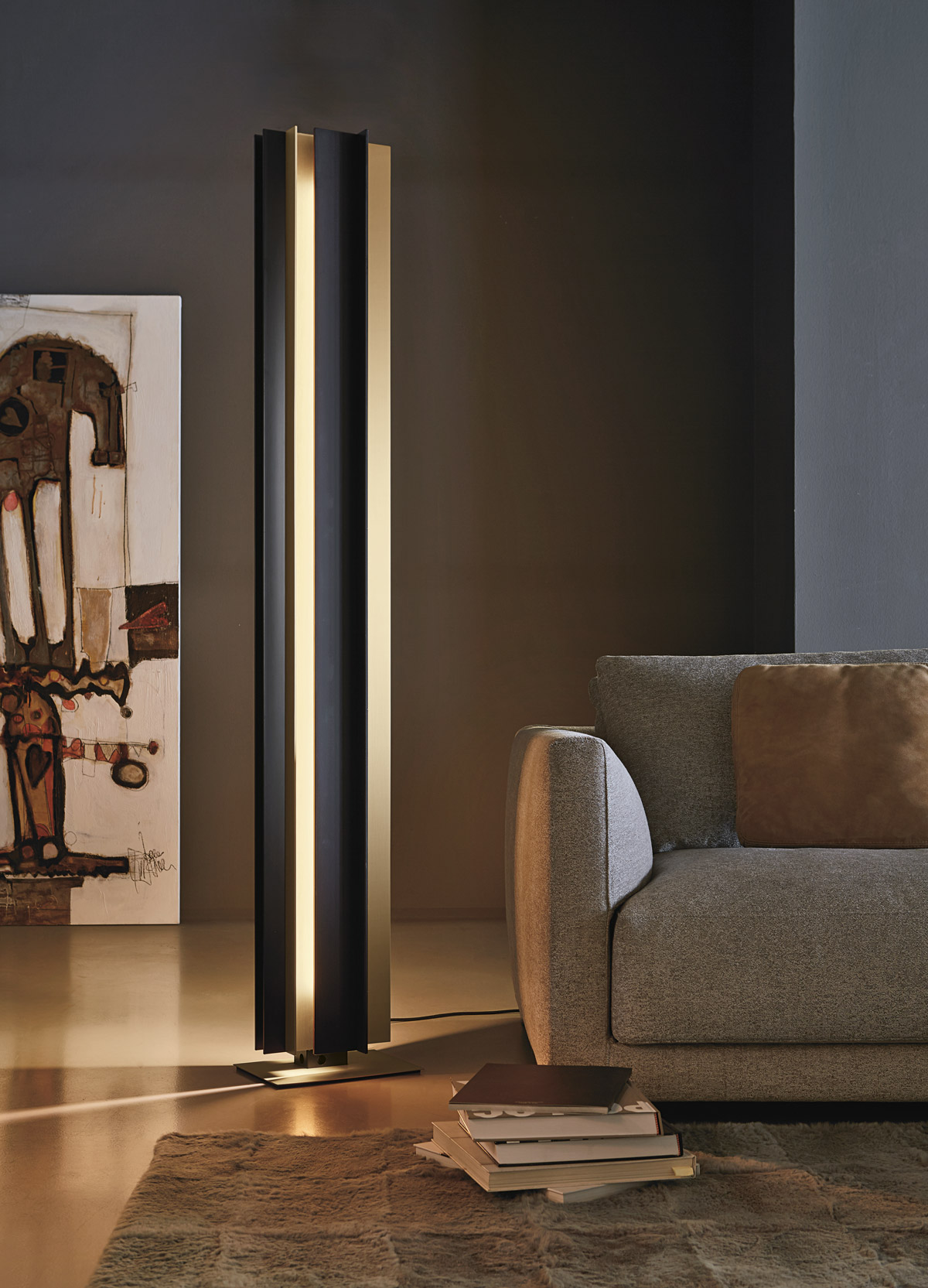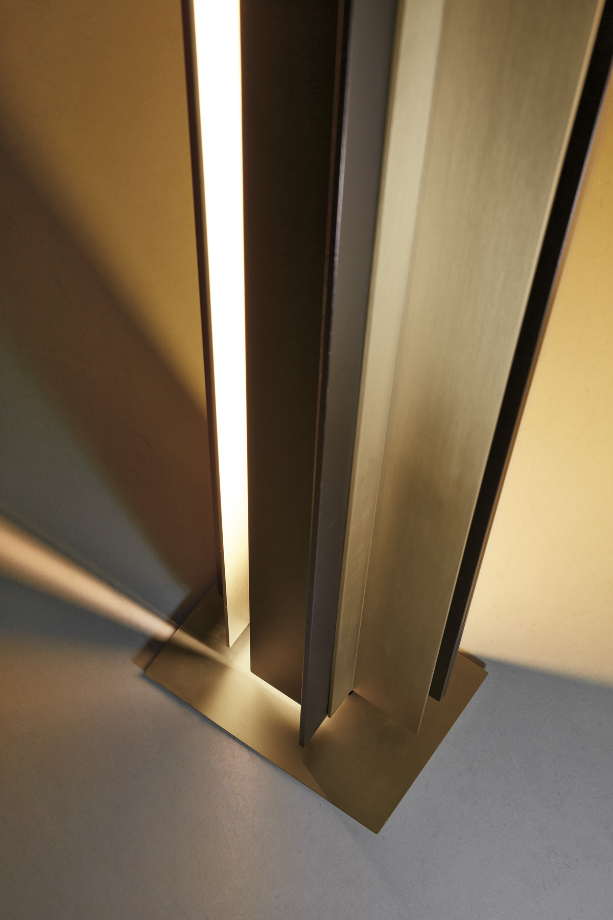 Floor lamp with indirect light. Light burnished brass and matte black structure.