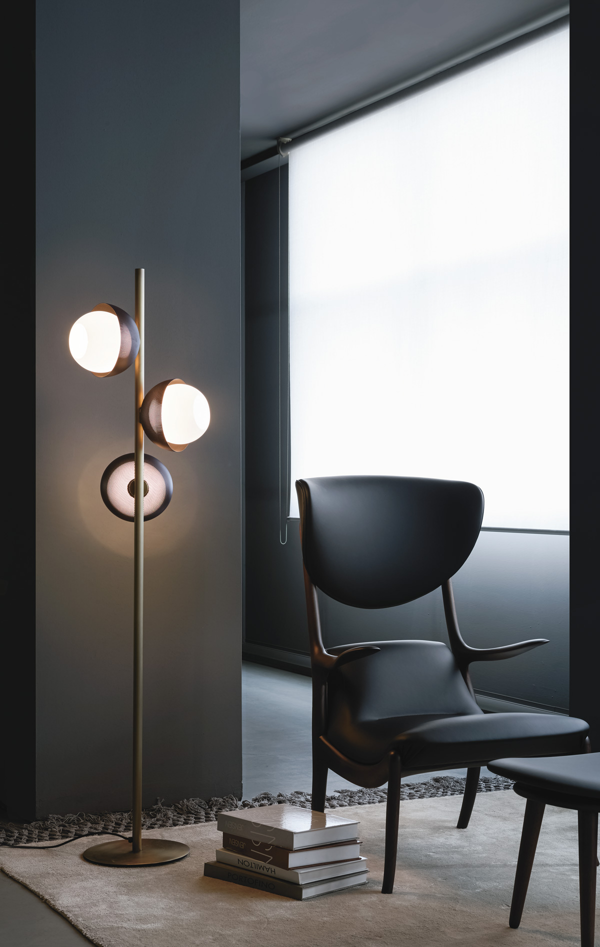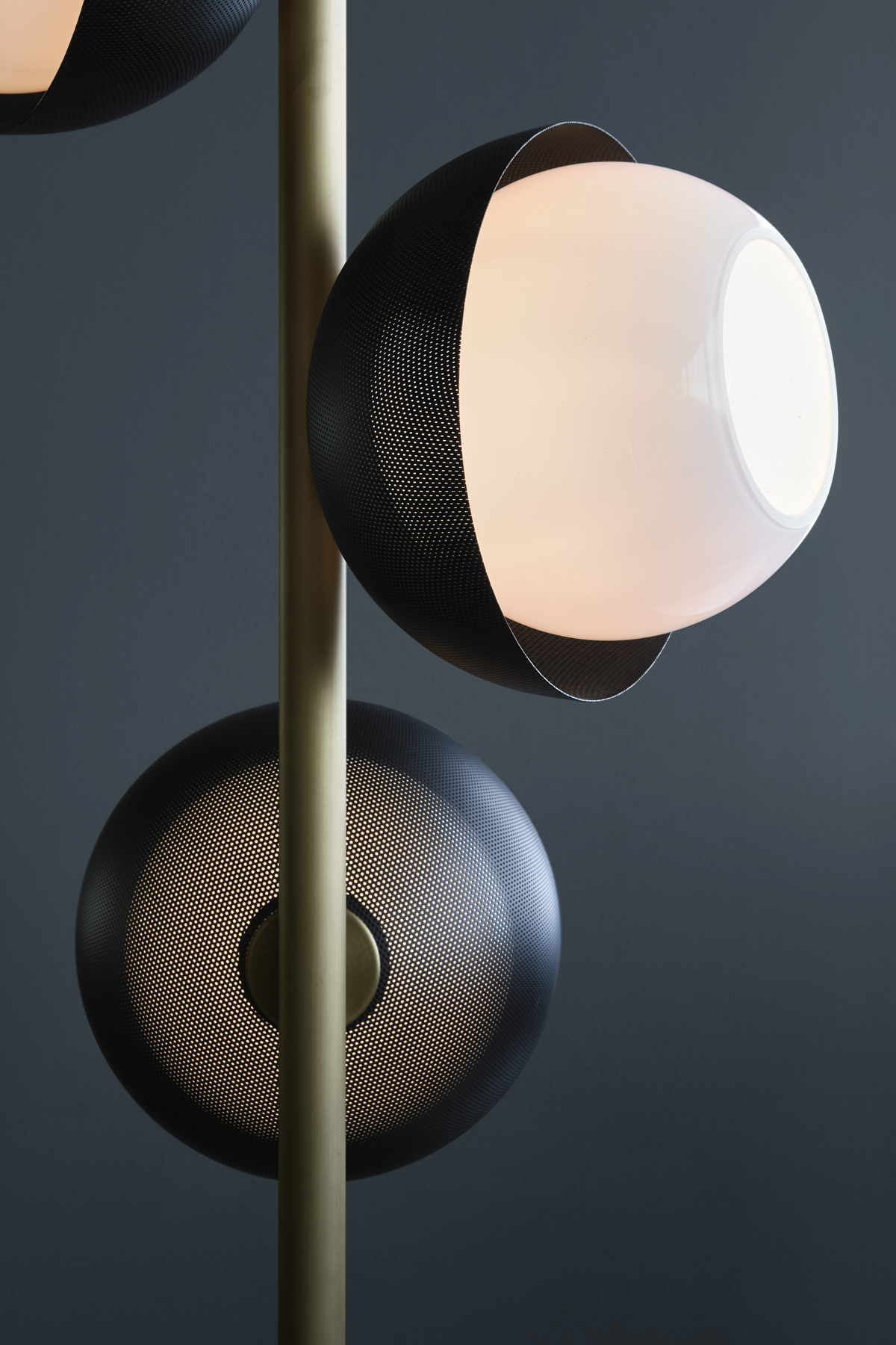 Floor lamp with diffused light. Light or dark burnished brass structure with matte gold or matte black perforated metal lampshades. White Murano blown glass diffusers.