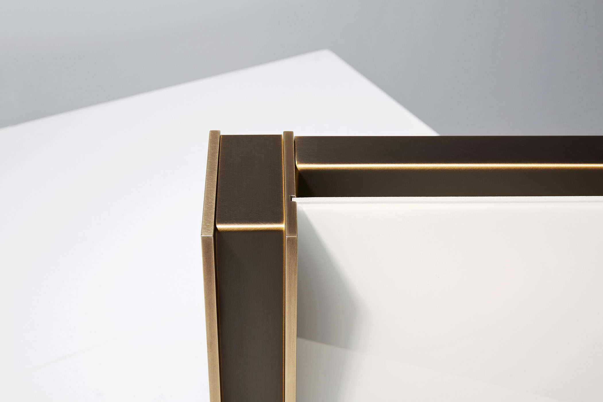 Table lamp with diffused light. Structure in pewter finish and delabré brass or burnished natural brass and dark burnished brass finish. White glass diffuser.