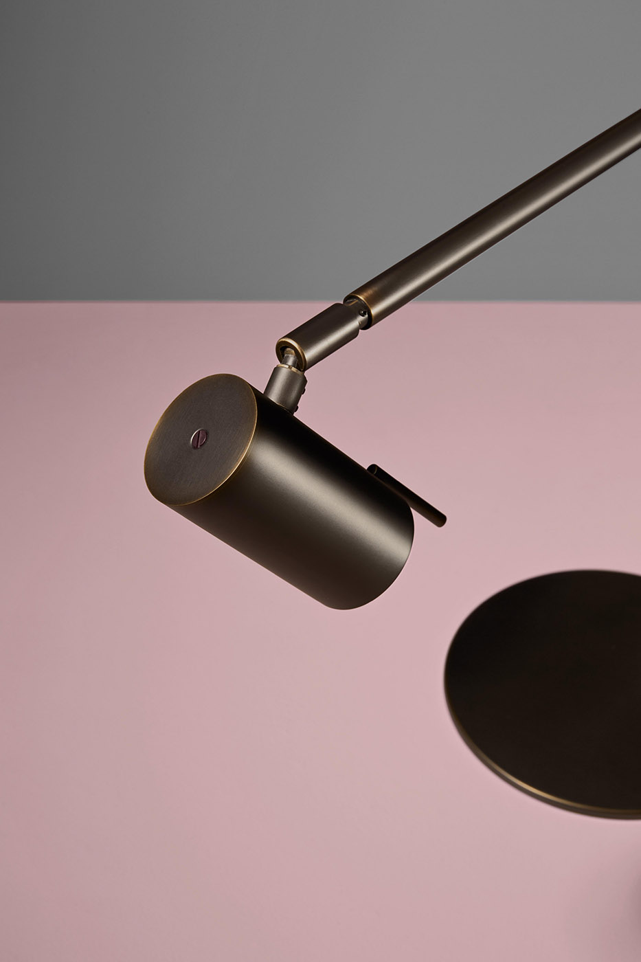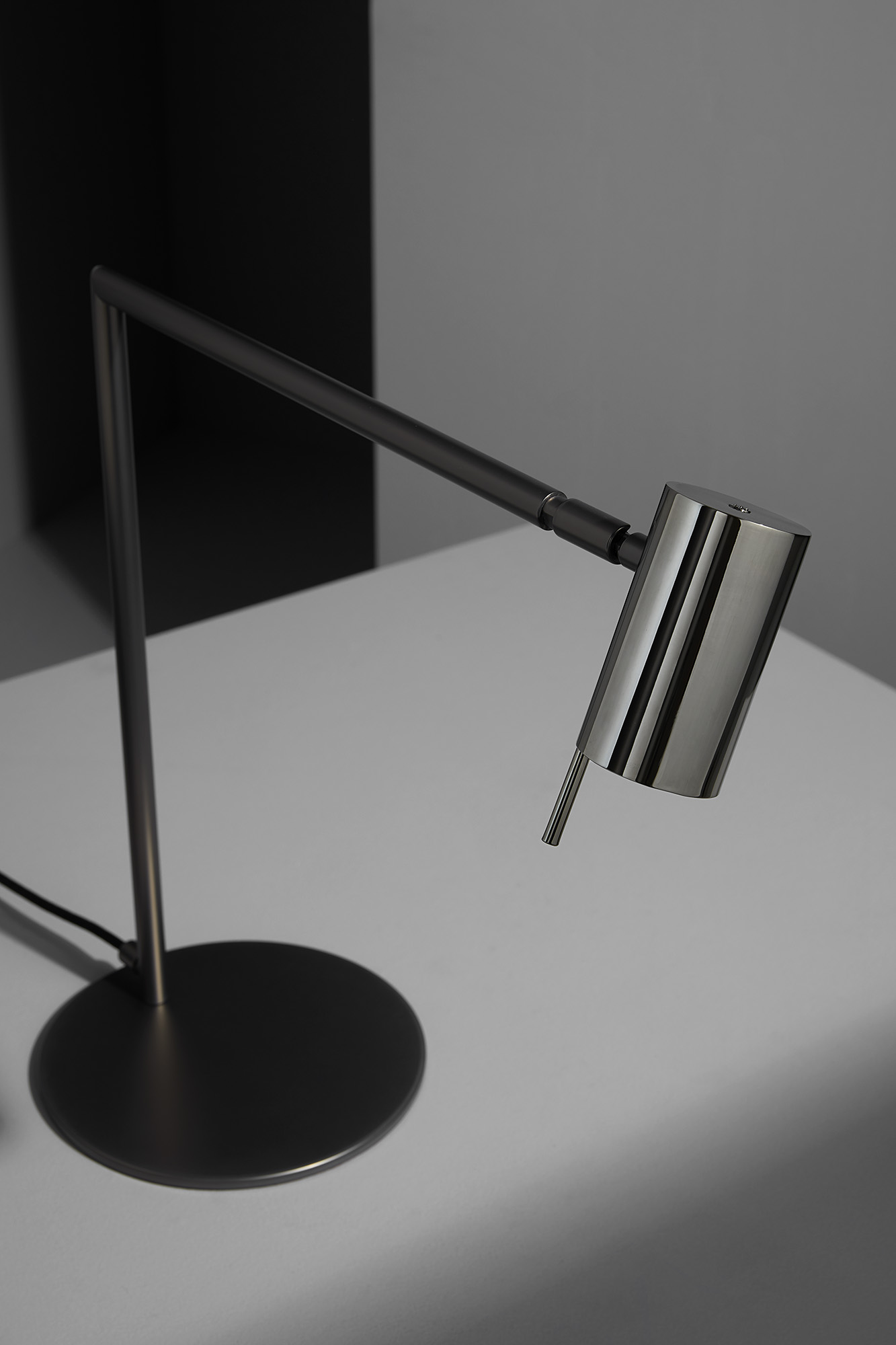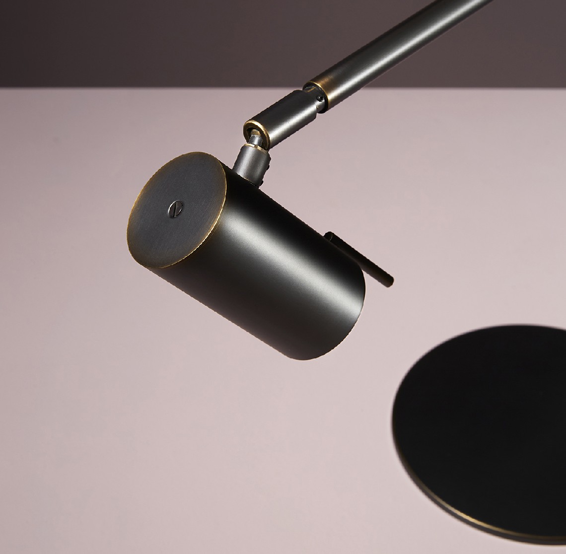 Table lamp with directional light. Dark burnished brass or matte black nickel and polisched black nickel structure and adjustable joint.