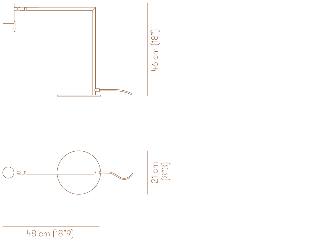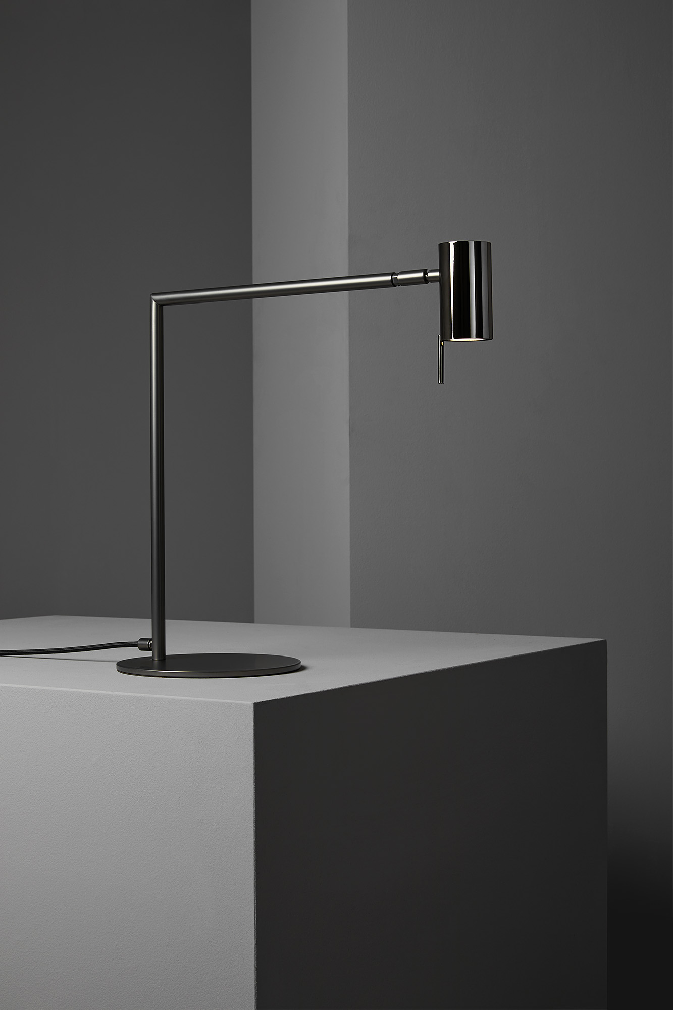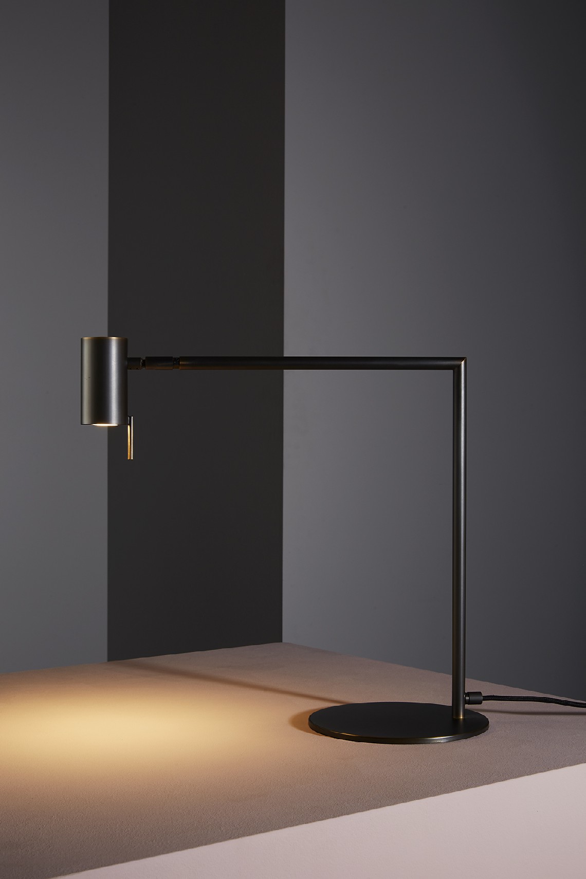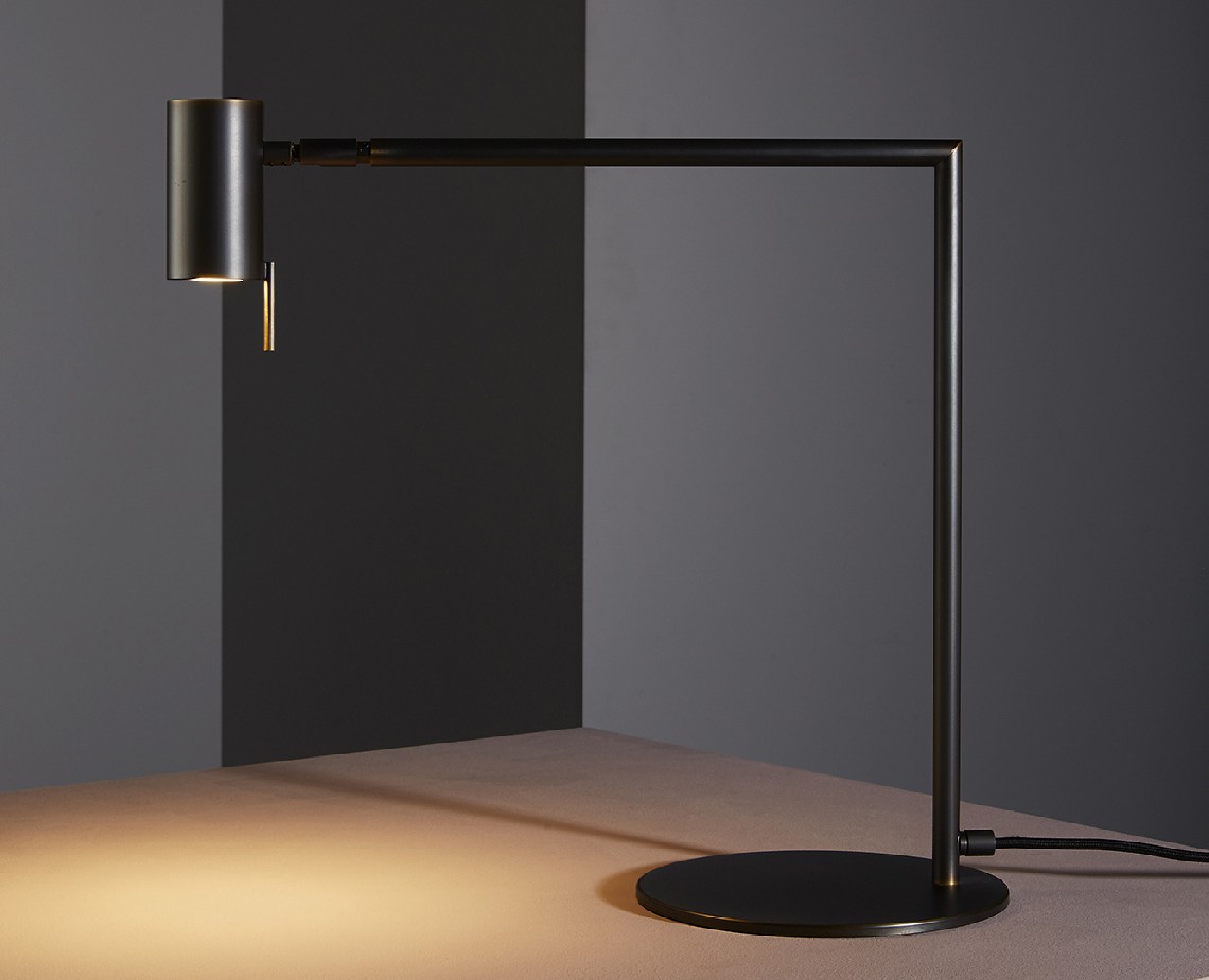 Table lamp with directional light. Dark burnished brass or matte black nickel and polisched black nickel structure and adjustable joint.