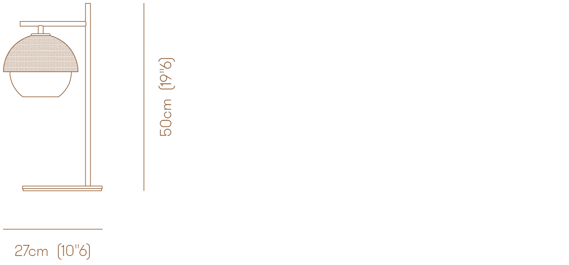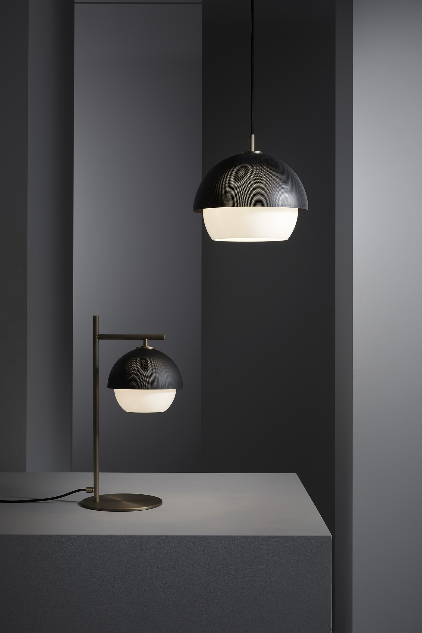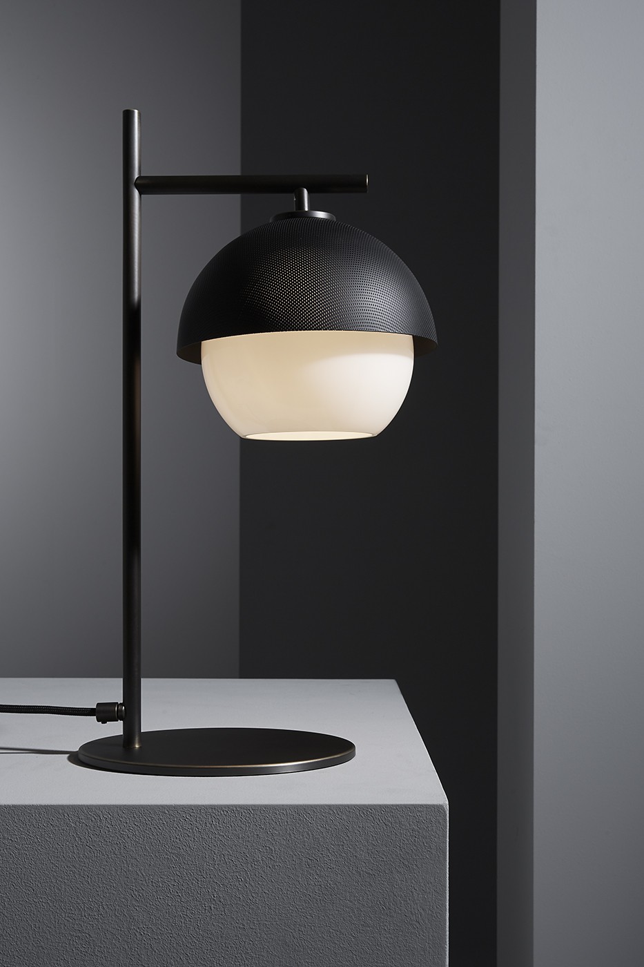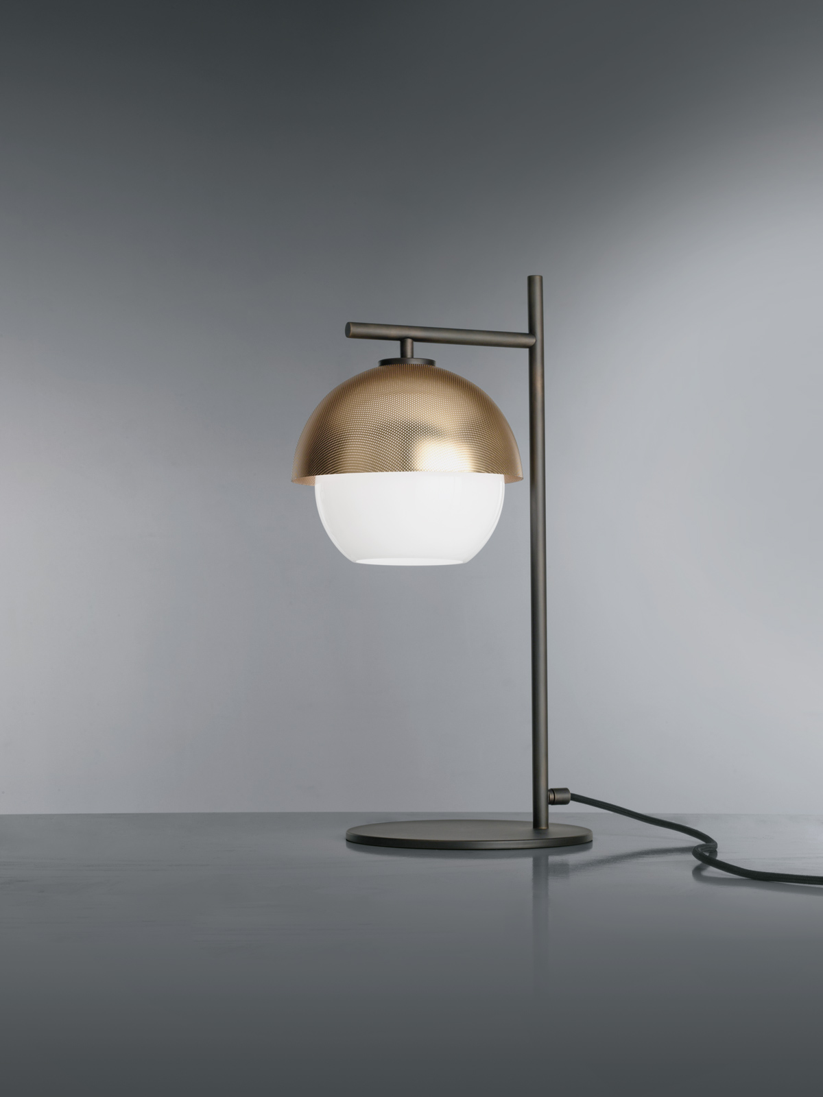 Table lamp with diffused light. Light or dark burnished brass structure with matte gold or matte black perforated metal lampshade. White Murano blown glass diffuser.