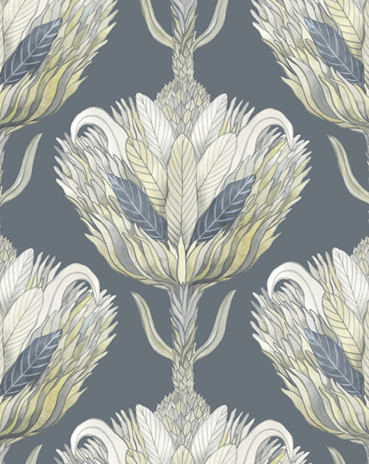 Wallpaper featuring a fantastical composition of feathers and petals in elegant pastel shades, designed by Francesca Greco. It is available in three colours.